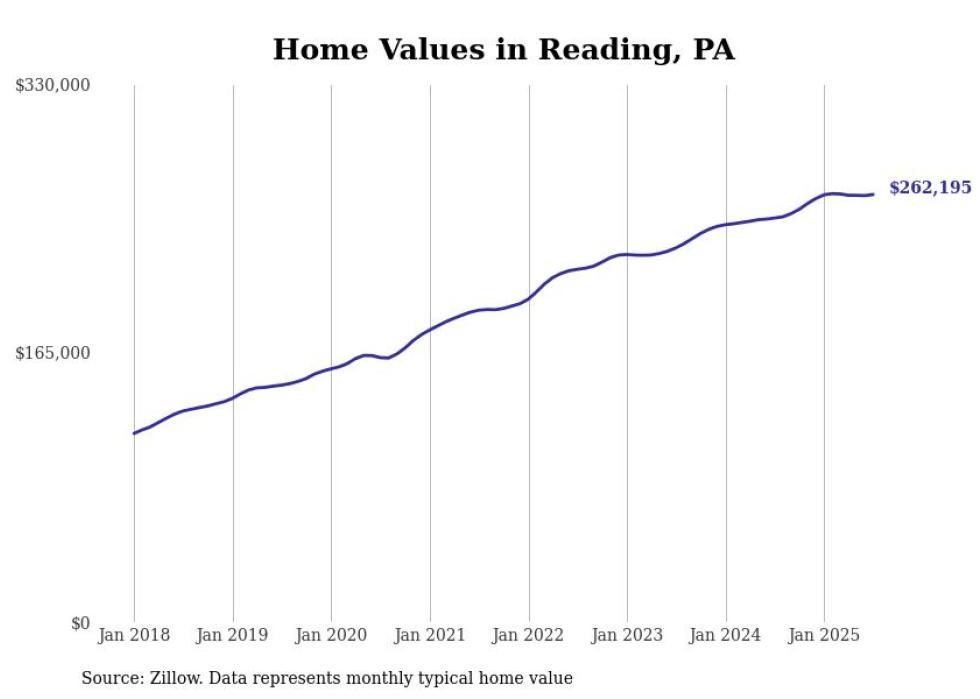 Stacker compiled a list of cities with the most expensive homes in the Reading metro area using data from Zillow. Charts show the monthly typical home value since January 2018. All 24 cities and towns with data available were included in the list.
