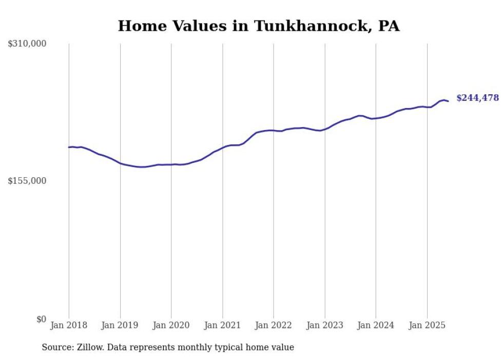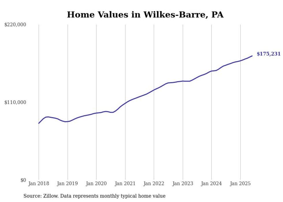 Stacker compiled a list of cities with the most expensive homes in the Scranton--Wilkes-Barre, PA metro area using data from Zillow. Charts show the monthly typical home value since January 2018.