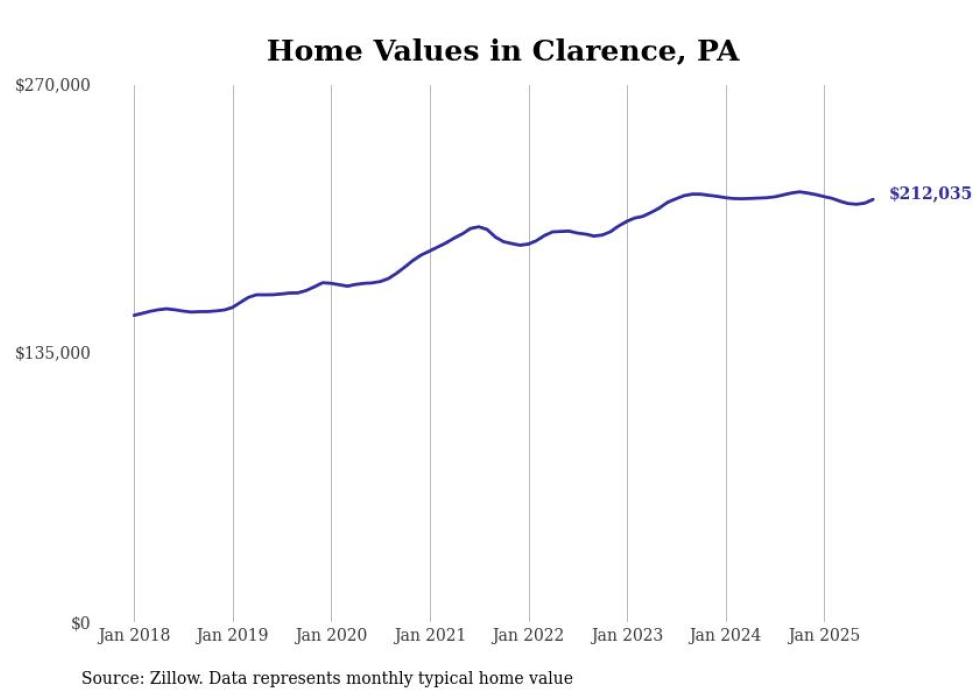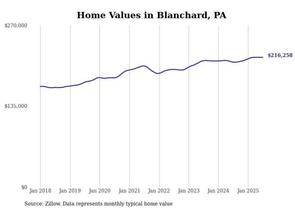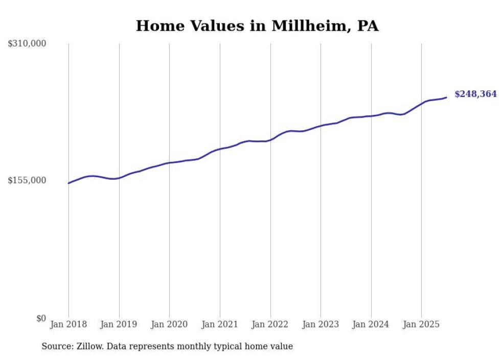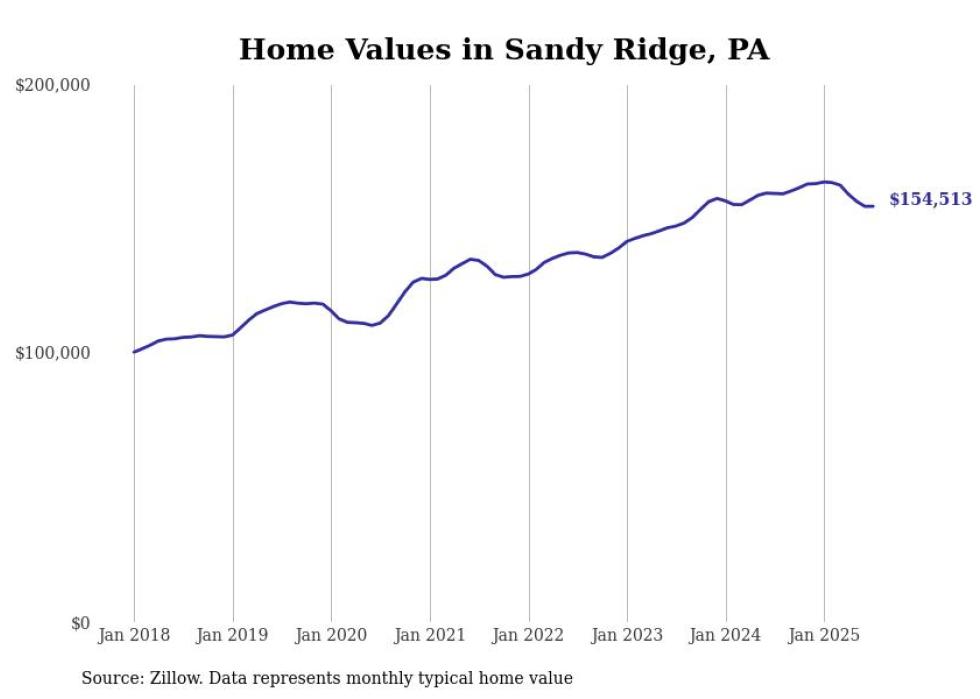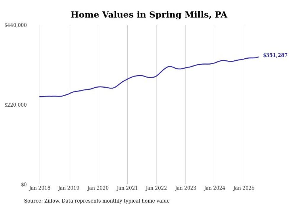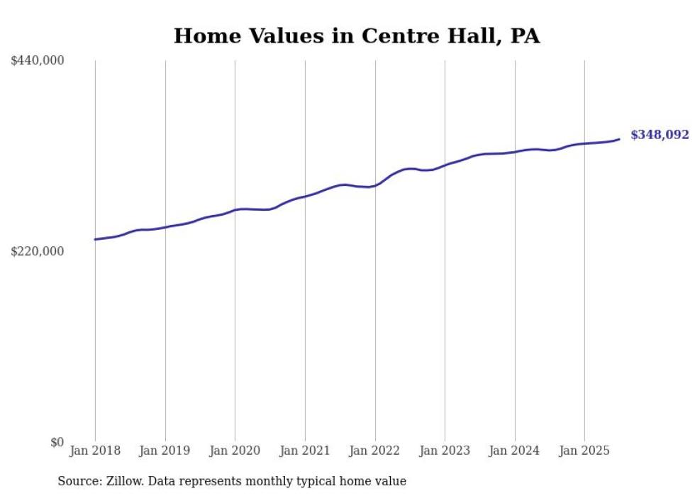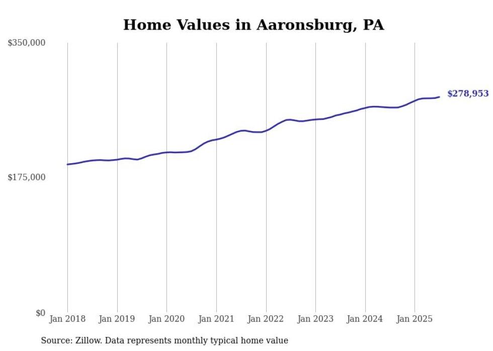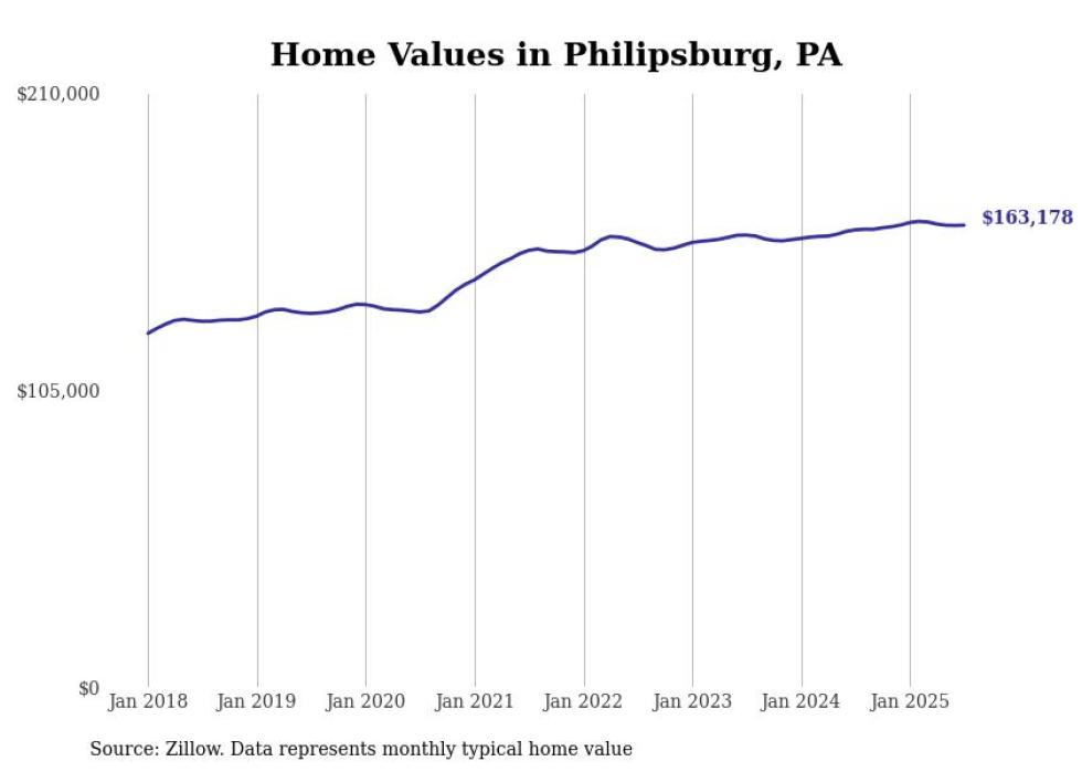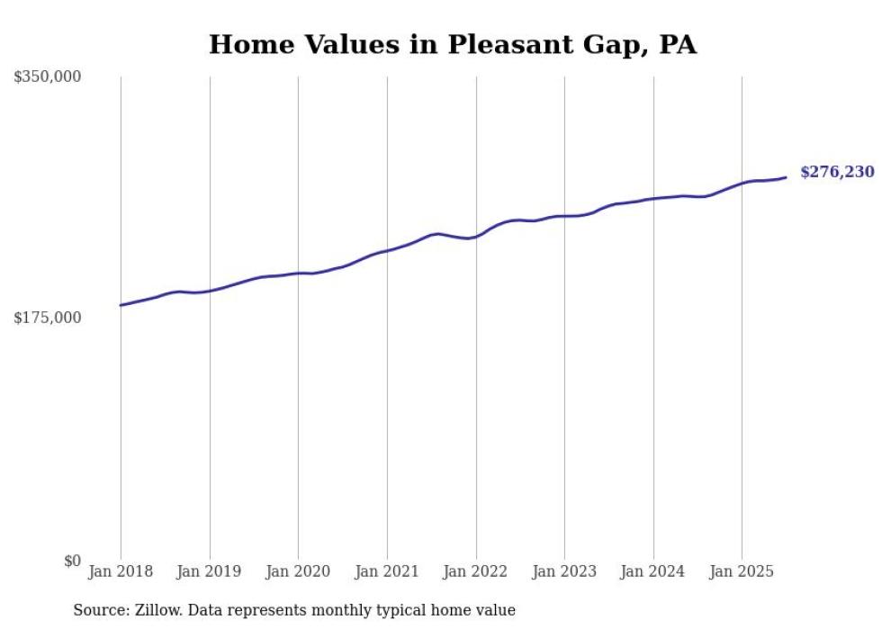 Stacker compiled a list of cities with the most expensive homes in the State College metro area using data from Zillow. Charts show the monthly typical home value since January 2018. All 15 cities and towns with data available were included in the list.