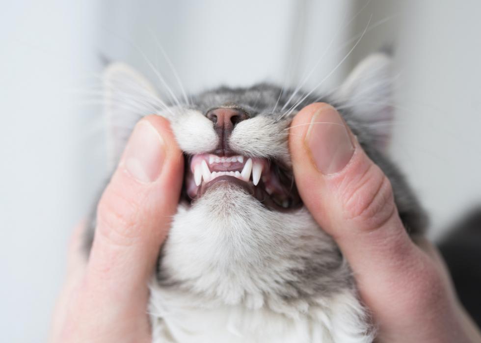 Cats go through a similar coming-of-age ordeal as human kids. They're born without teeth, then they get 26 baby teeth—also called milk teeth or deciduous teeth—starting around two weeks old. By the time kittenhood ends, however, they all fall out and are replaced by 30 permanent teeth.