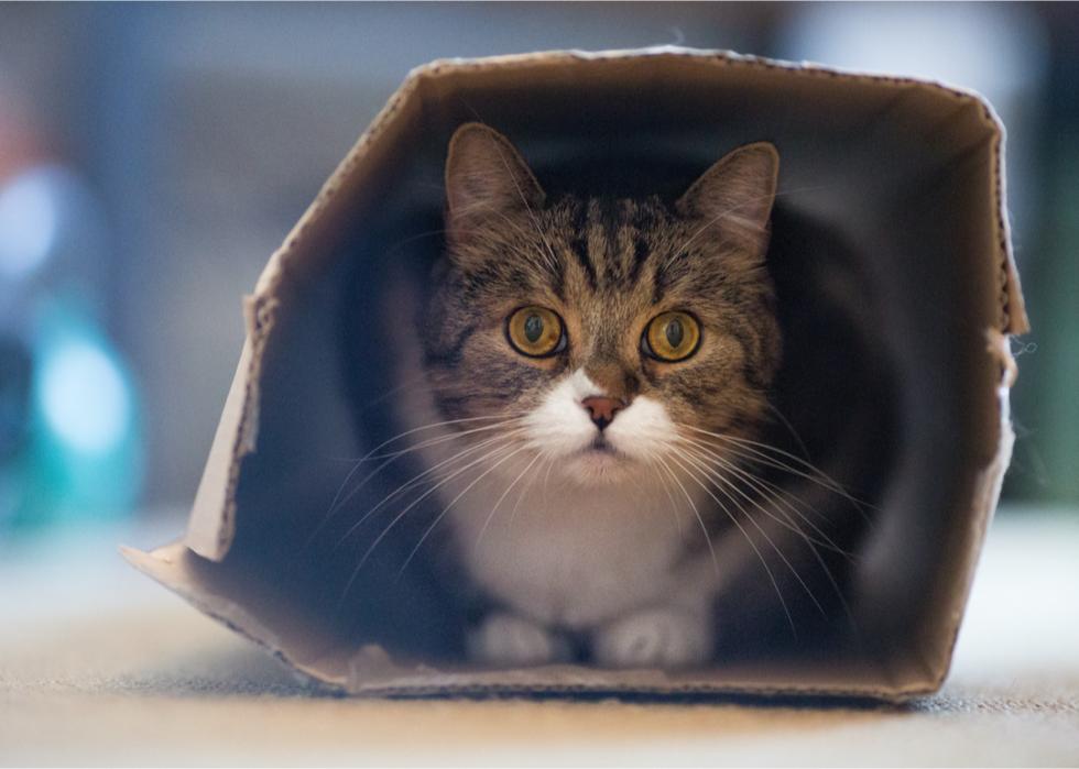 Cats are ambush predators that sneak up quietly, hide, then pounce unexpectedly on their prey. They're also adept at hiding in dark, closed spaces when larger predators stalk them. Therefore, tight hiding spaces like boxes are a comfort zone for both of a cat's two main survival instincts—catching meals and avoiding becoming one.