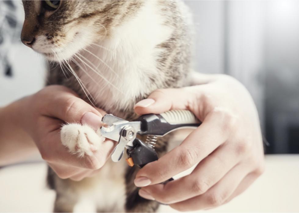 Cats nails should be trimmed, but it's not always a job for the DIY cat owner. The experience can be anxiety-inducing for the cat and scratch-inducing for the owner. Unless the cat will tolerate the uncomfortable intrusion, this might best be left to a vet or professional groomer, who will almost always pull it off faster, with less pain (for both parties), and with less likelihood of cutting too close to the quick.
