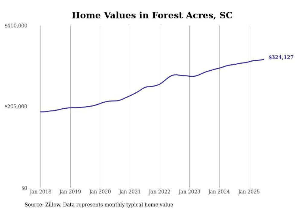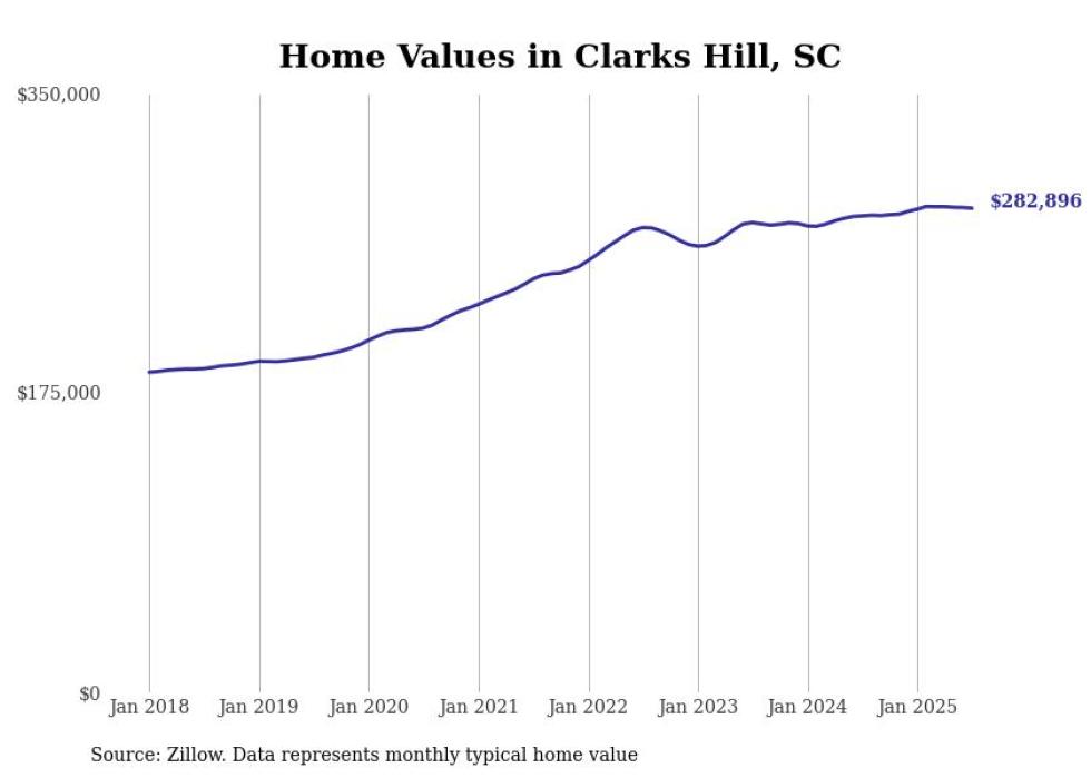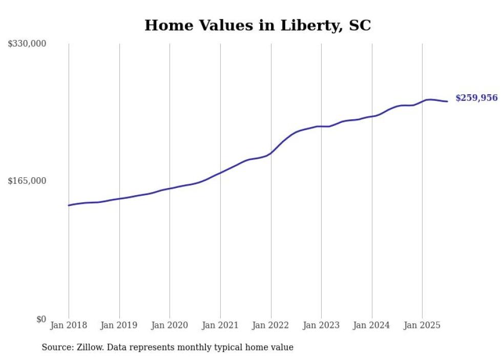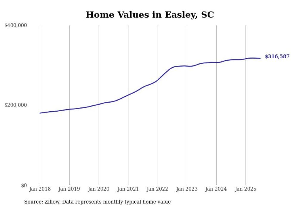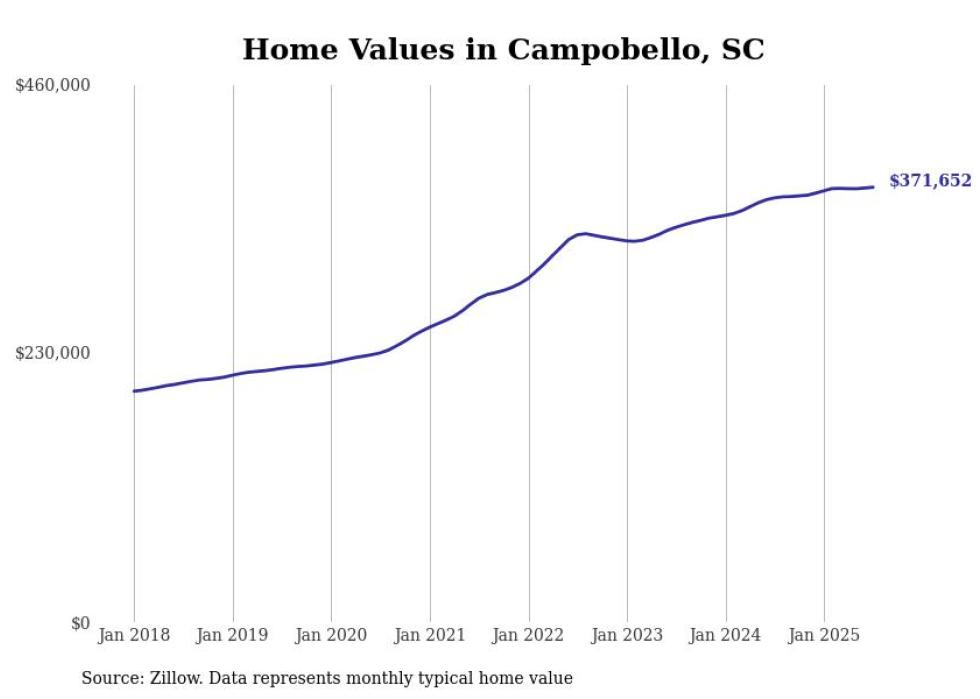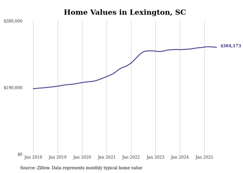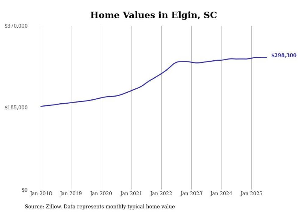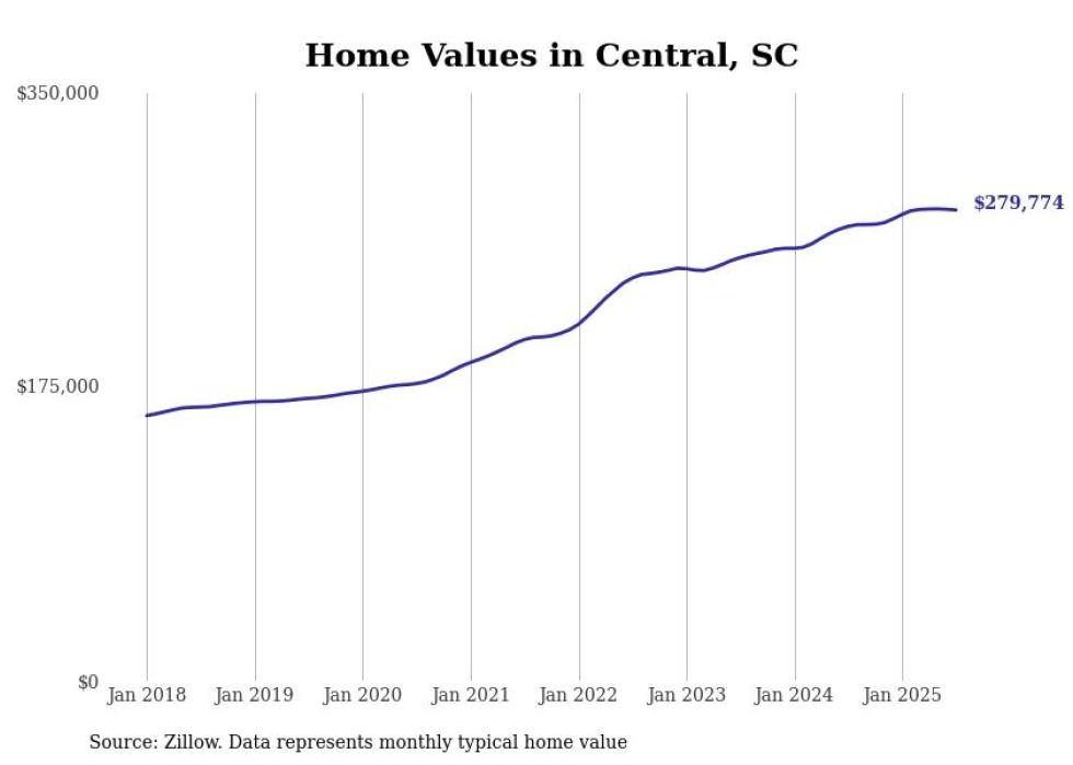 Stacker compiled a list of cities with the fastest-growing home prices in South Carolina using data from Zillow. Cities are ranked by the dollar change in the Zillow Home Values Index for all homes from the 12 months ending July 2025. The charts in this story were created automatically using Matplotlib. Data was available for 50 cities and towns in South Carolina.