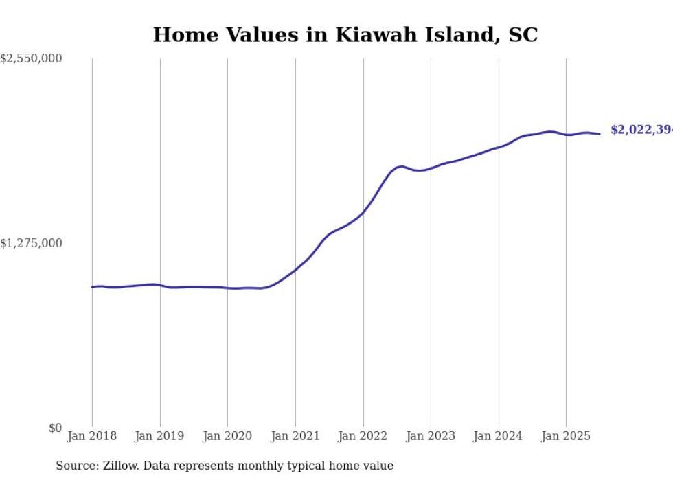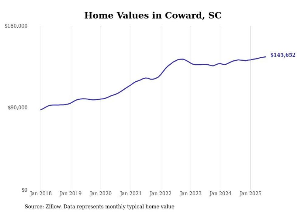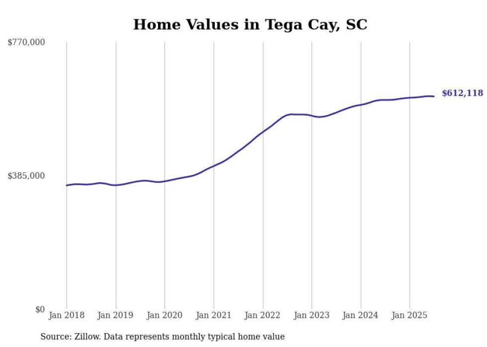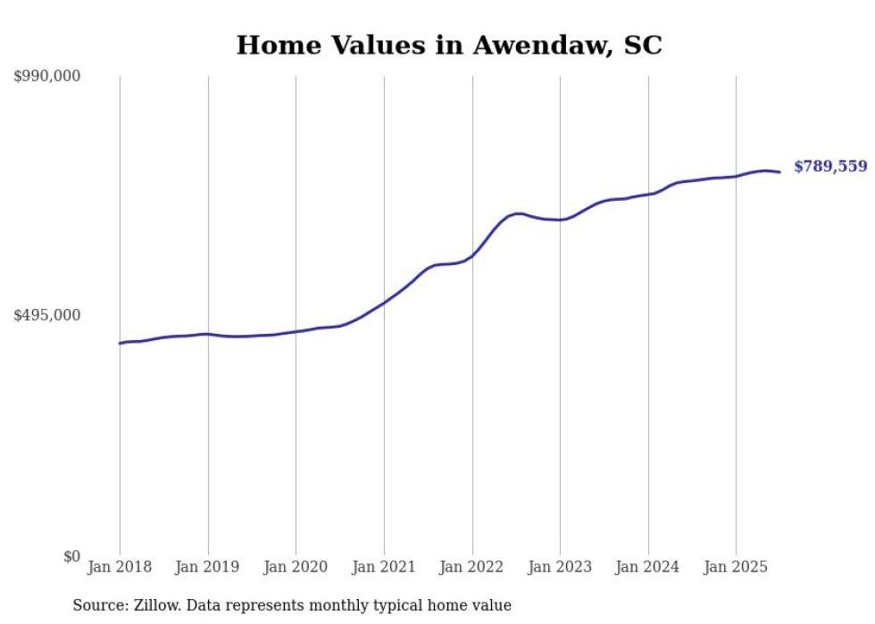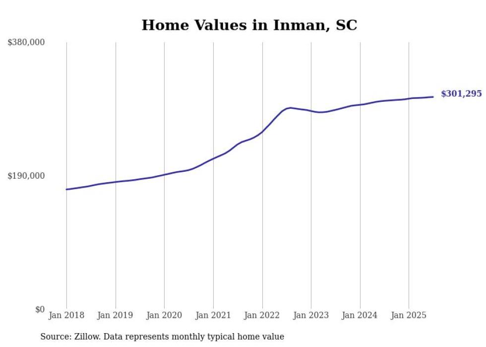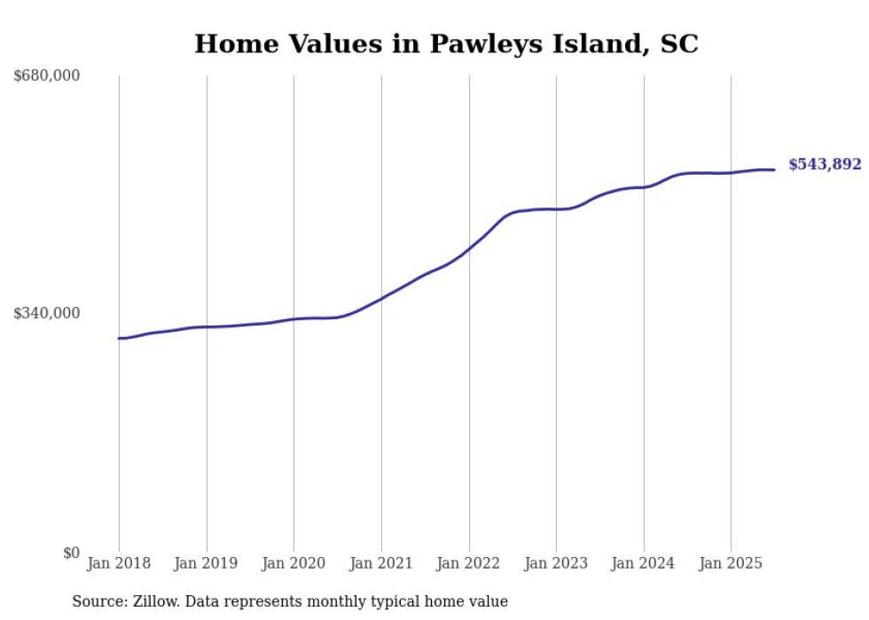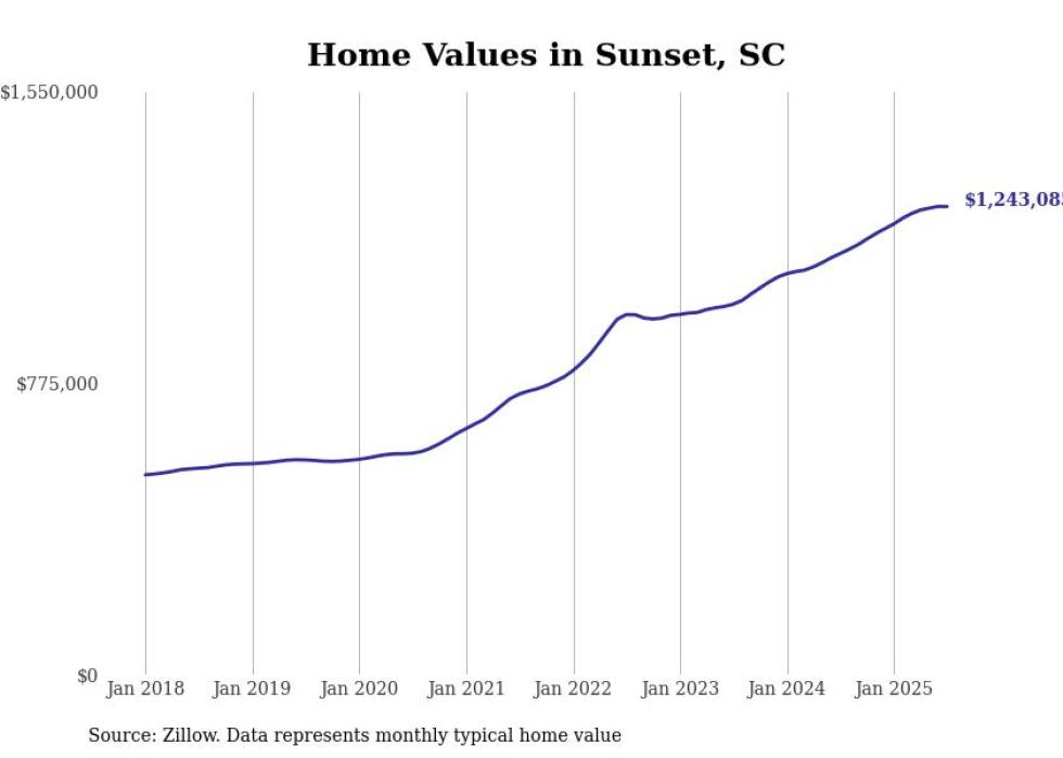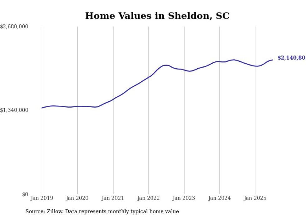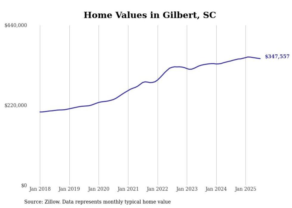 Stacker compiled a list of cities with the fastest-growing home prices in South Carolina using data from Zillow. Cities are ranked by the dollar change in the Zillow Home Values Index for all homes from the 12 months ending July 2025. The charts in this story were created automatically using Matplotlib. Data was available for 50 cities and towns in South Carolina.