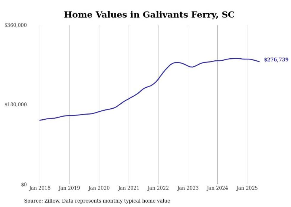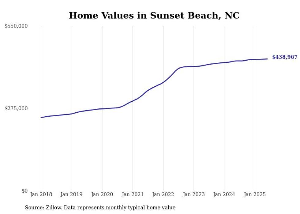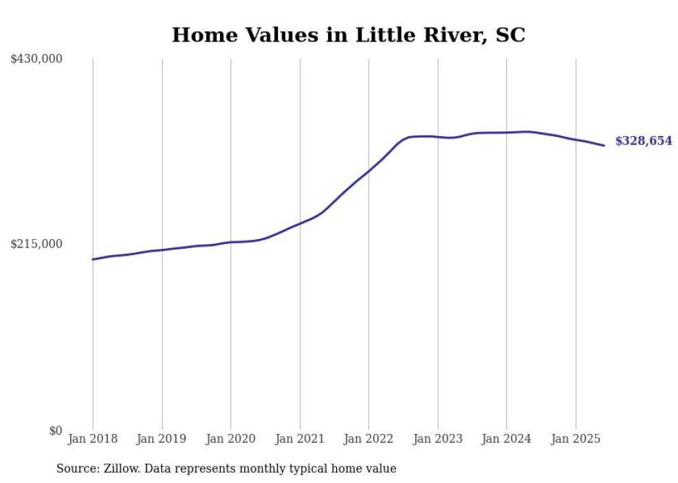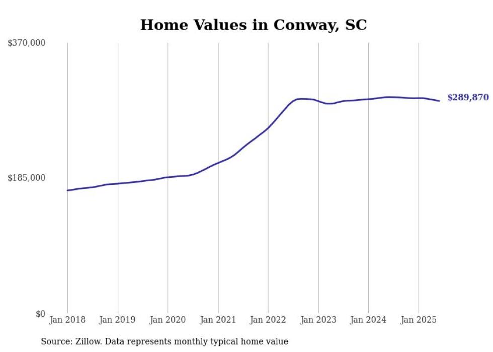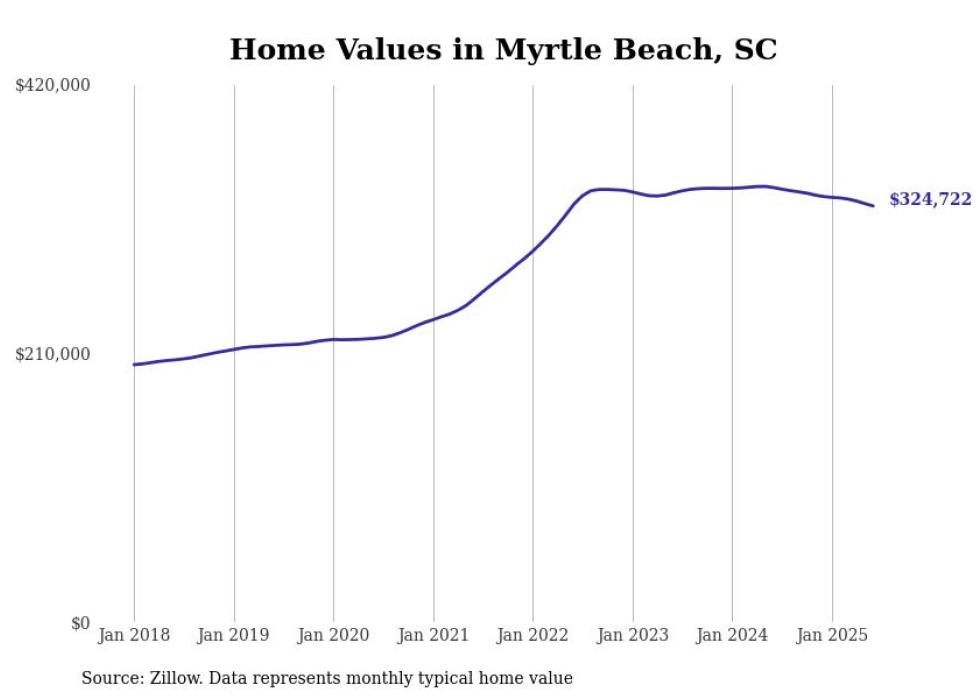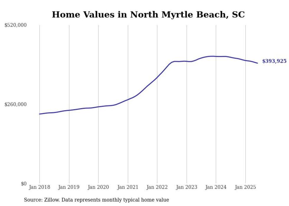 Stacker compiled a list of cities with the most expensive homes in the Myrtle Beach-Conway-North Myrtle Beach, SC-NC metro area using data from Zillow. Charts show the monthly typical home value since January 2018.