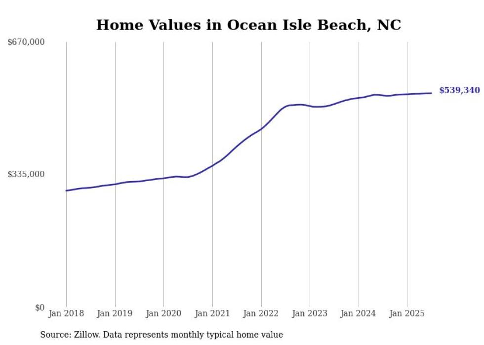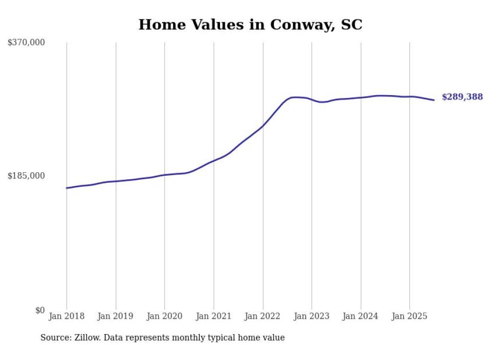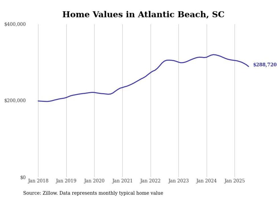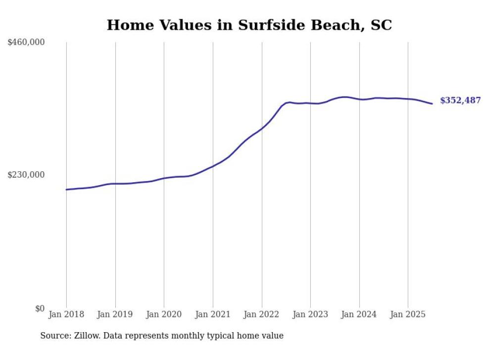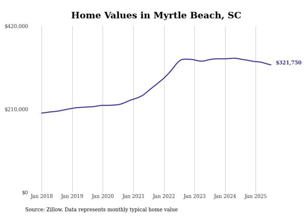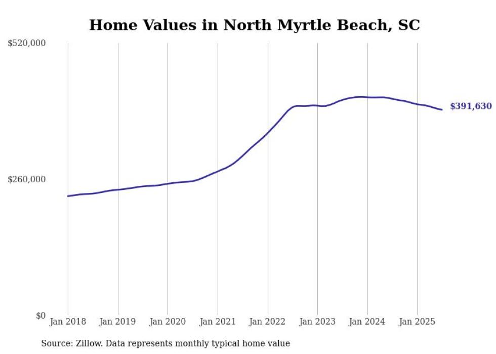 Stacker compiled a list of cities with the most expensive homes in the Myrtle Beach metro area using data from Zillow. Charts show the monthly typical home value since January 2018. Data was available for 31 cities and towns.