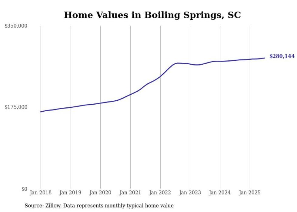 Stacker compiled a list of cities with the most expensive homes in the Spartanburg metro area using data from Zillow. Charts show the monthly typical home value since January 2018. All 15 cities and towns with data available were included in the list.