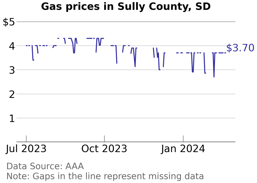 Stacker compiled statistics on gas prices in Sully County using data from AAA. Gas prices are current as of Feb. 26.