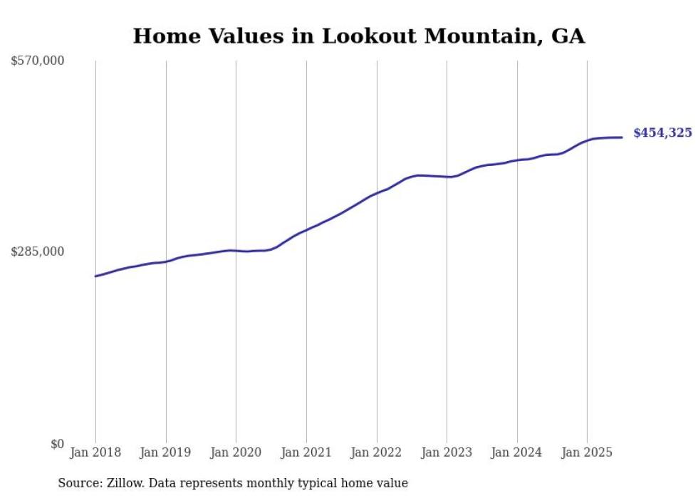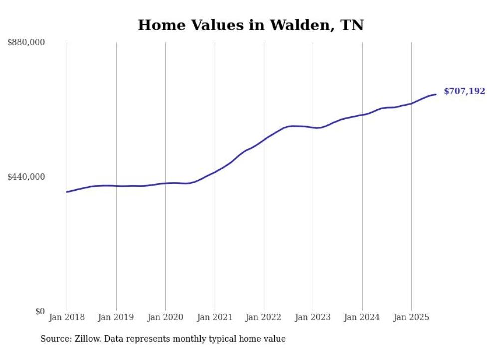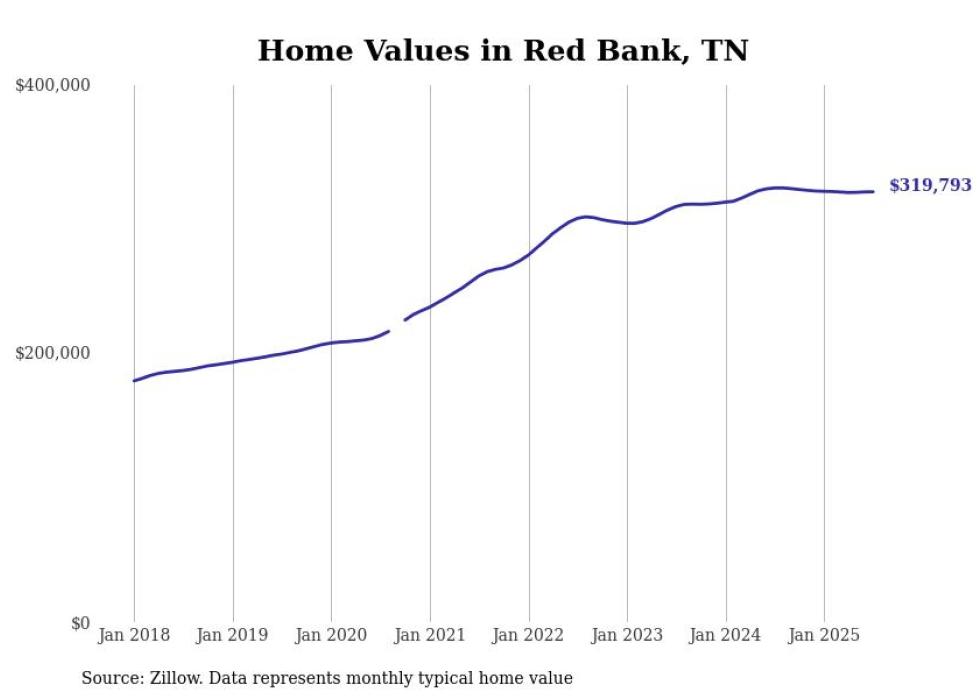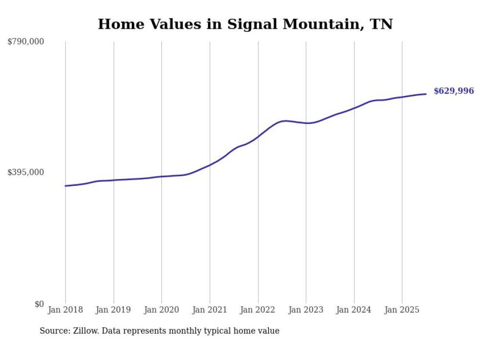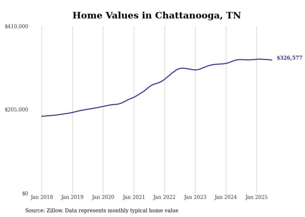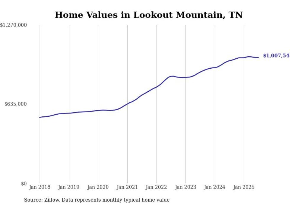 Stacker compiled a list of cities with the most expensive homes in the Chattanooga metro area using data from Zillow. Charts show the monthly typical home value since January 2018. Data was available for 36 cities and towns.