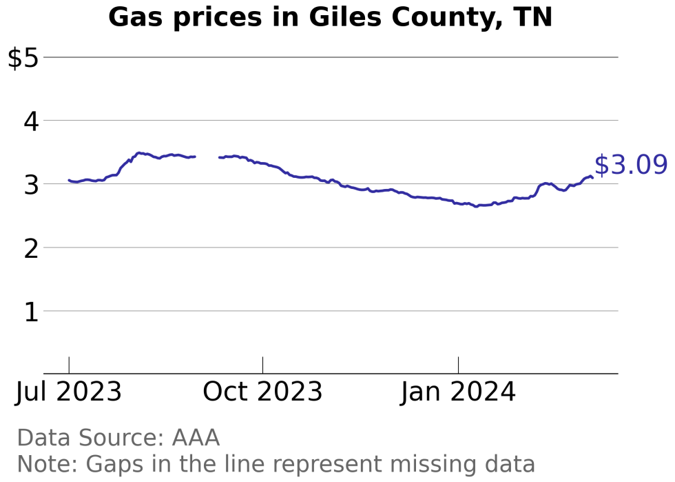 Stacker compiled statistics on gas prices in Giles County using data from AAA. Gas prices are current as of March 11.