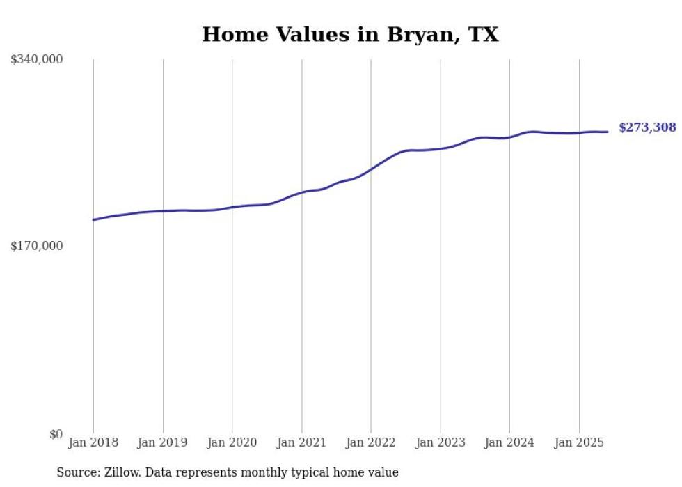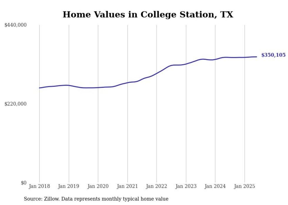Stacker compiled a list of cities with the most expensive homes in the College Station-Bryan, TX metro area using data from Zillow. Charts show the monthly typical home value since January 2018.
