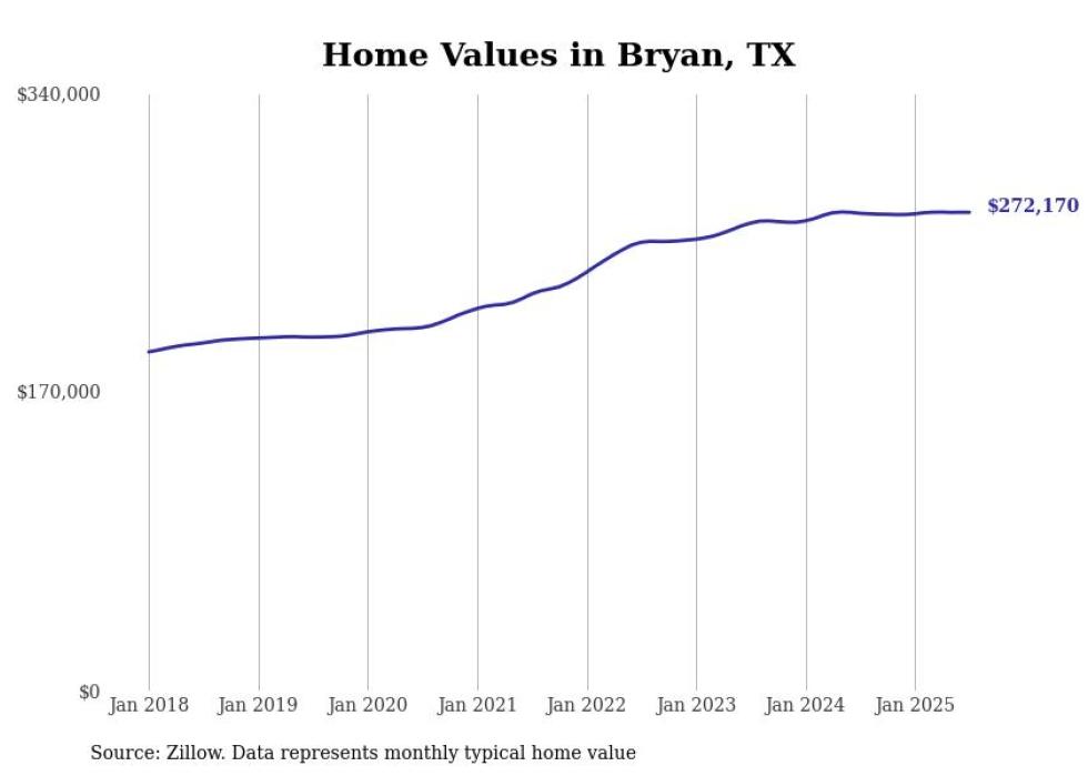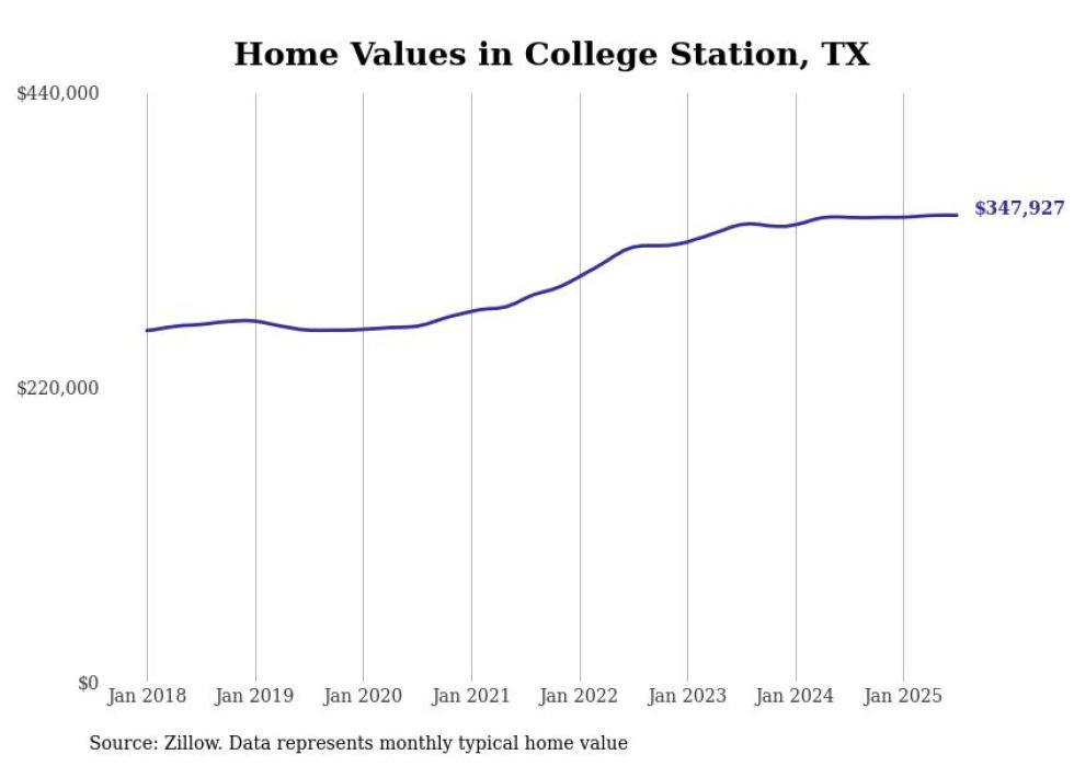 Stacker compiled a list of cities with the most expensive homes in the College Station metro area using data from Zillow. Charts show the monthly typical home value since January 2018. All 11 cities and towns with data available were included in the list.