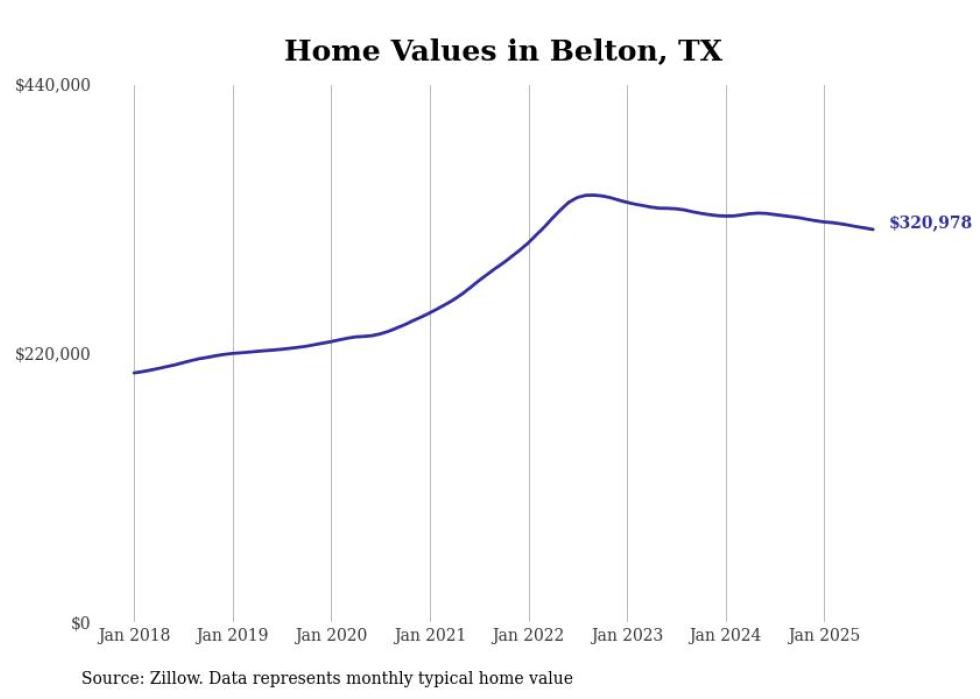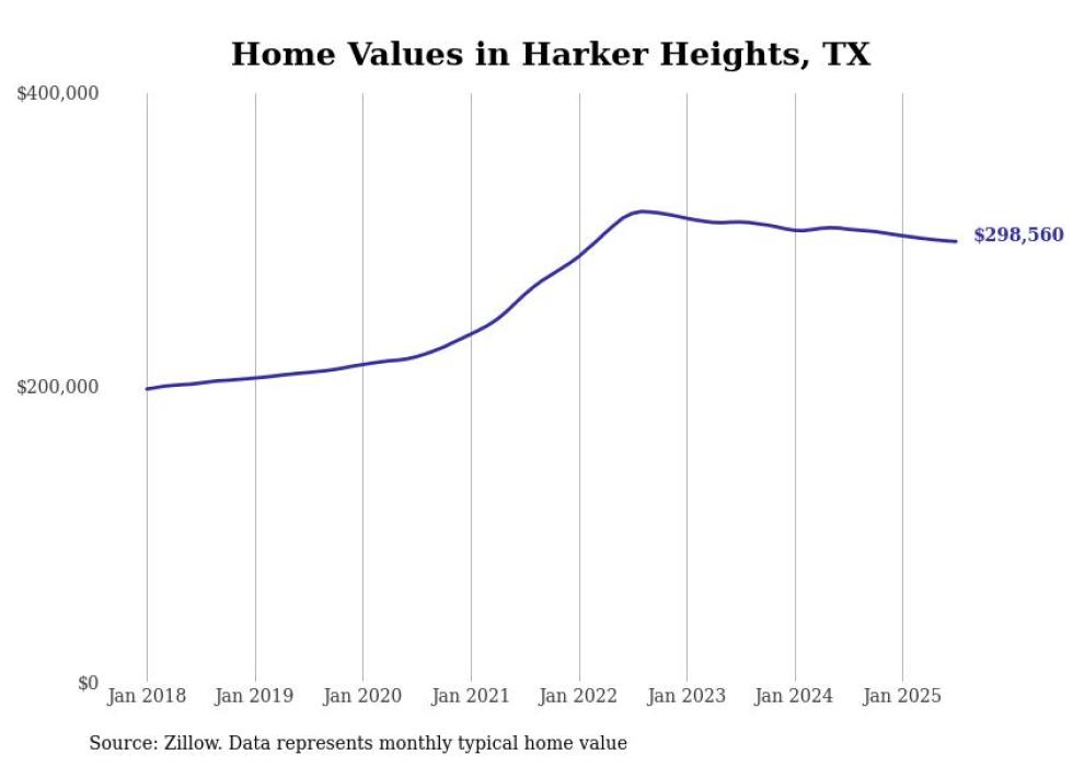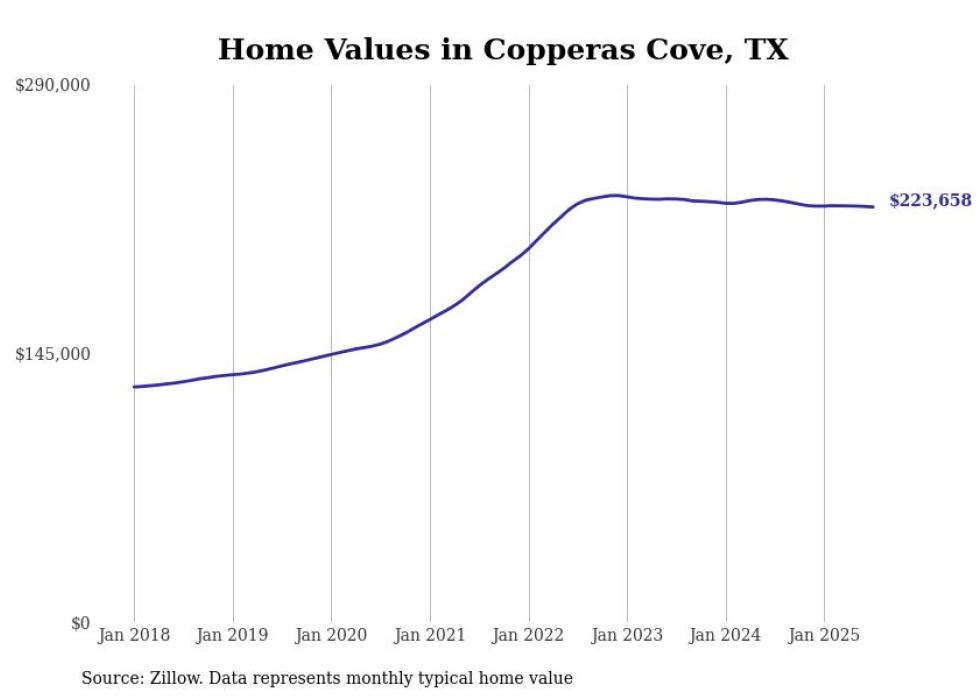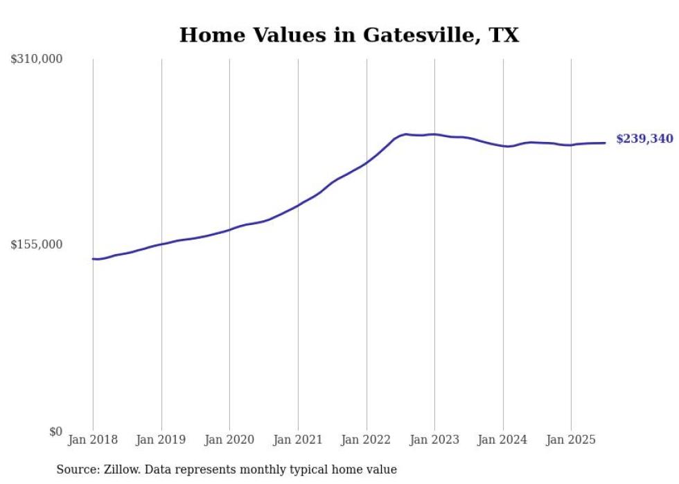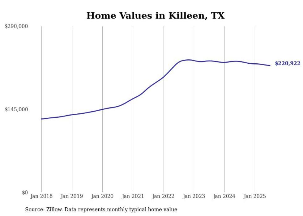 Stacker compiled a list of cities with the most expensive homes in the Killeen metro area using data from Zillow. Charts show the monthly typical home value since January 2018. All 24 cities and towns with data available were included in the list.