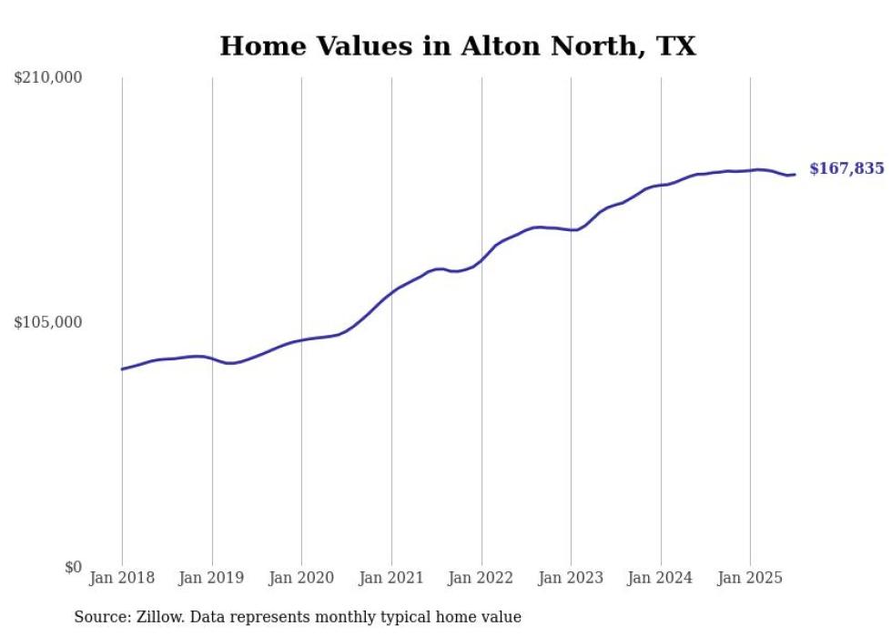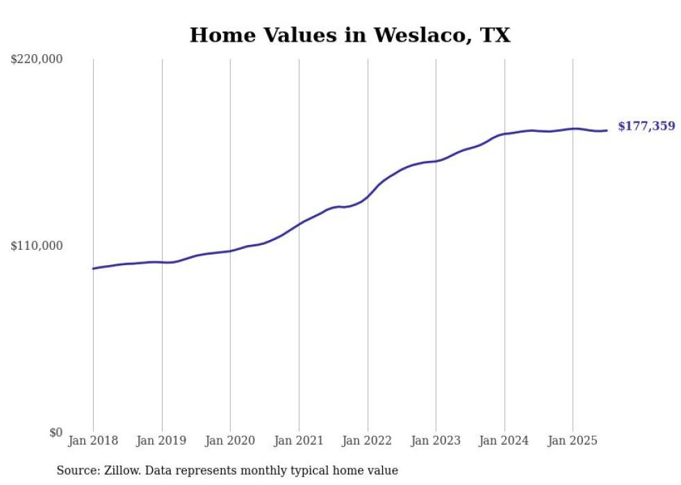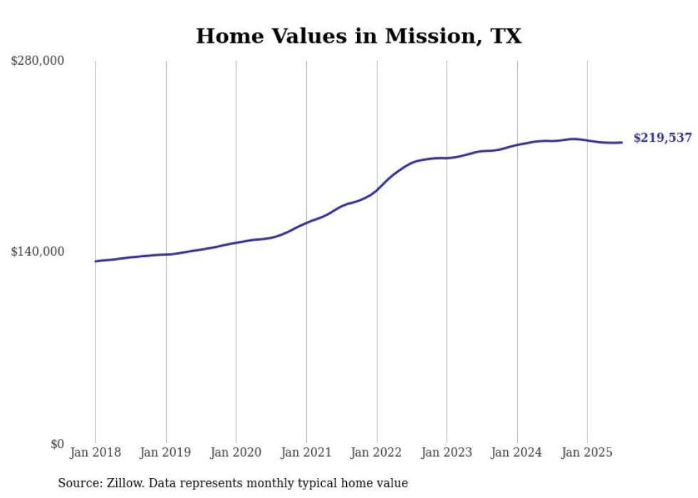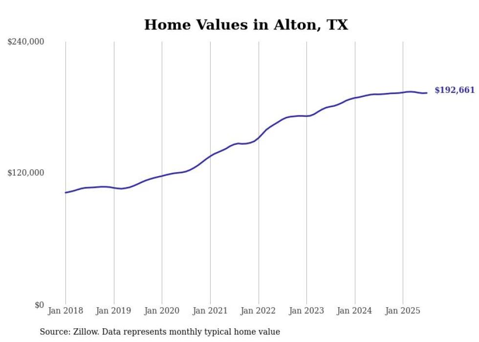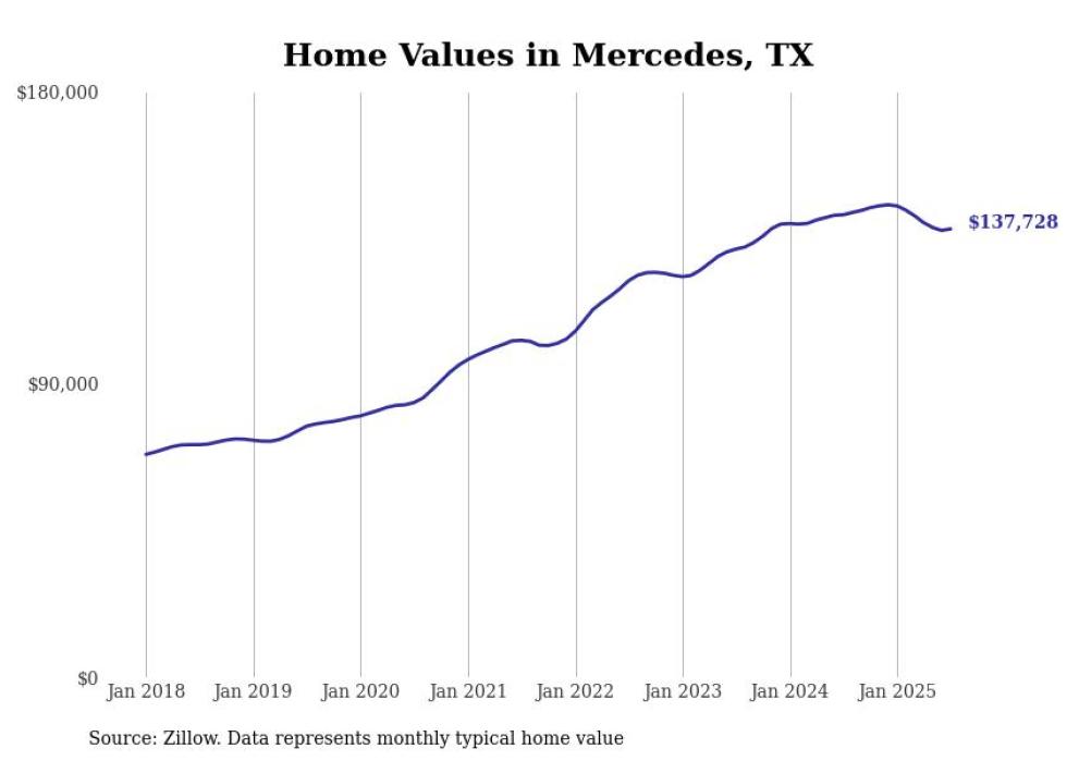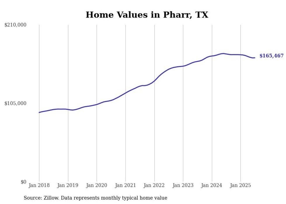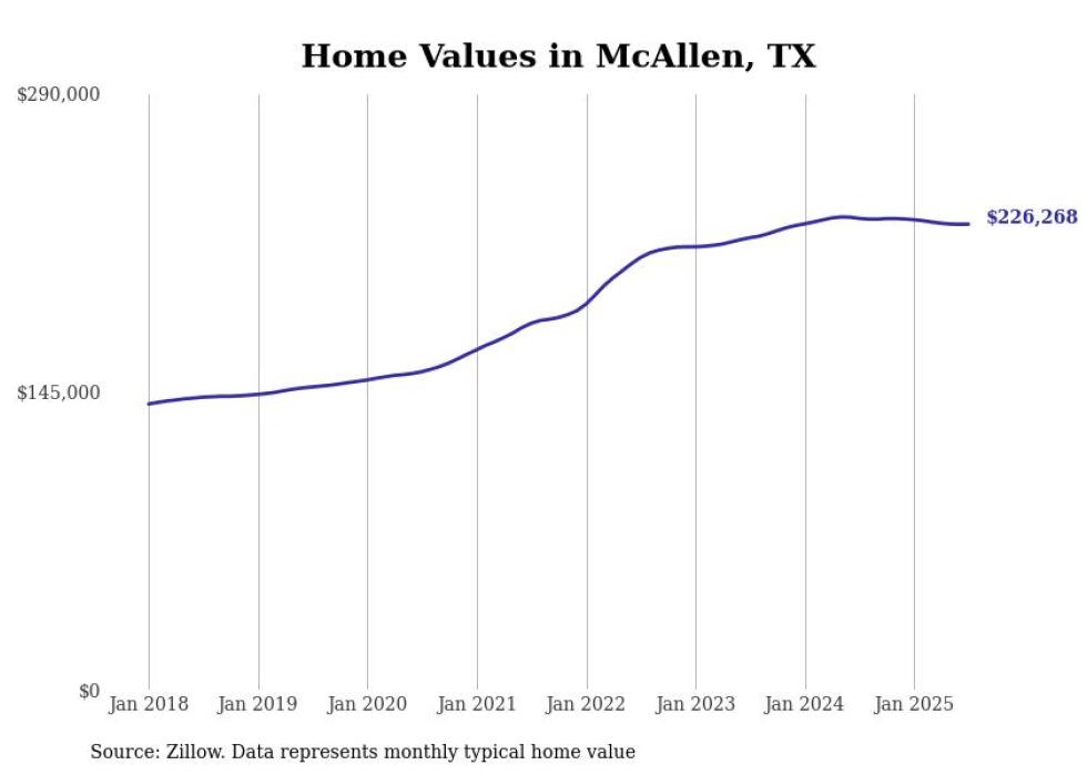 Stacker compiled a list of cities with the most expensive homes in the McAllen metro area using data from Zillow. Charts show the monthly typical home value since January 2018. Data was available for 31 cities and towns.