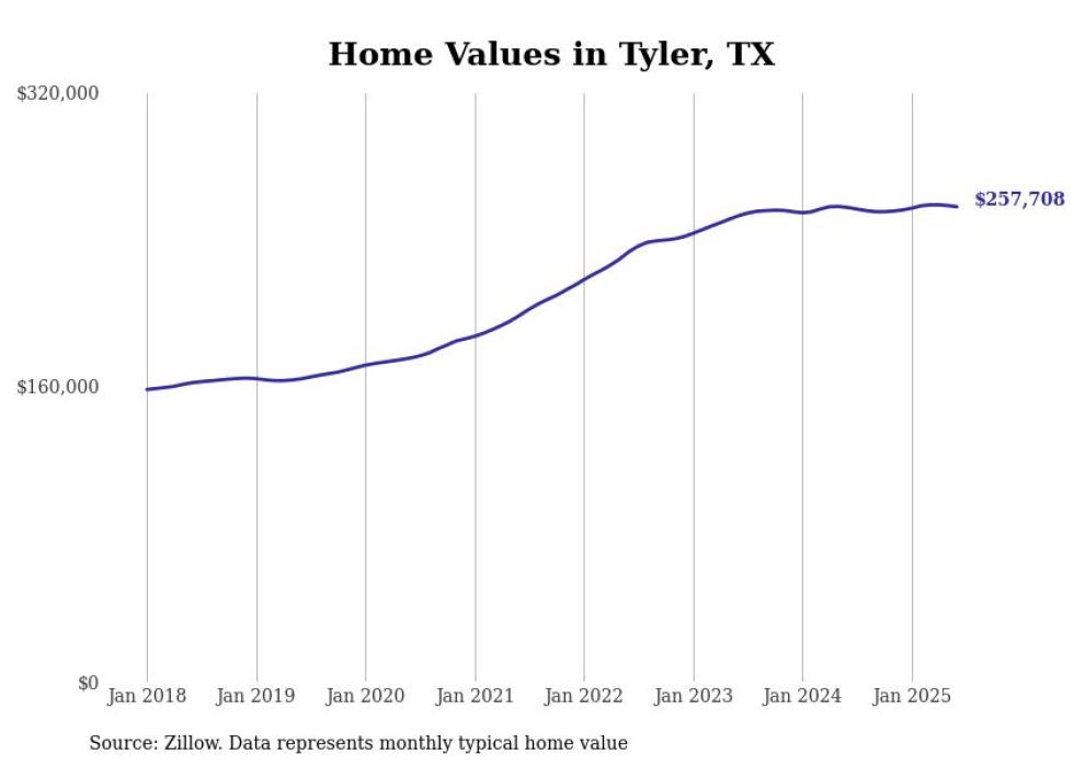 Stacker compiled a list of cities with the most expensive homes in the Tyler, TX metro area using data from Zillow. Charts show the monthly typical home value since January 2018.