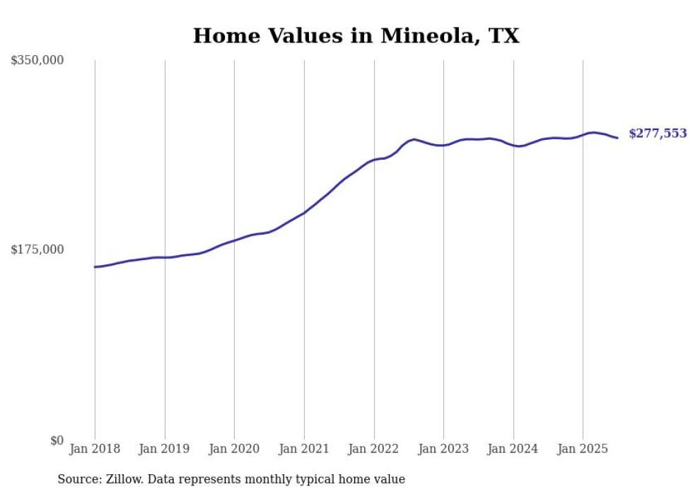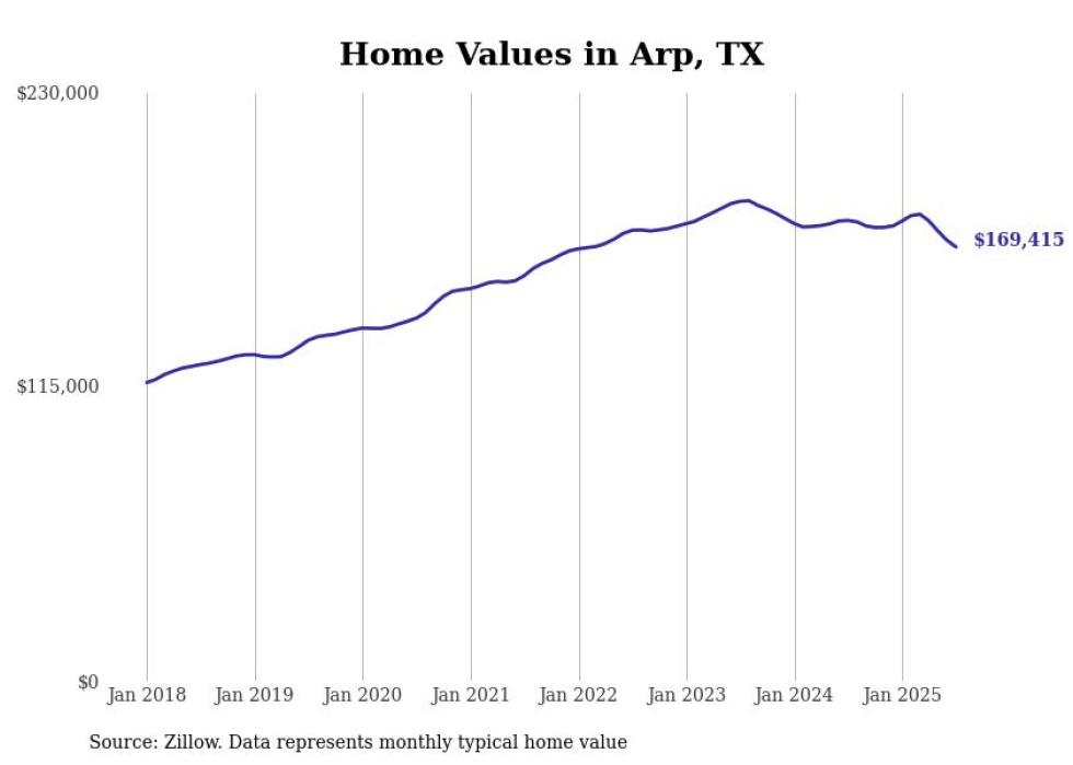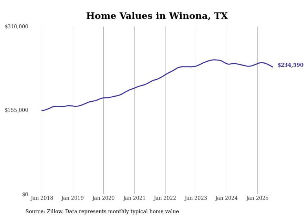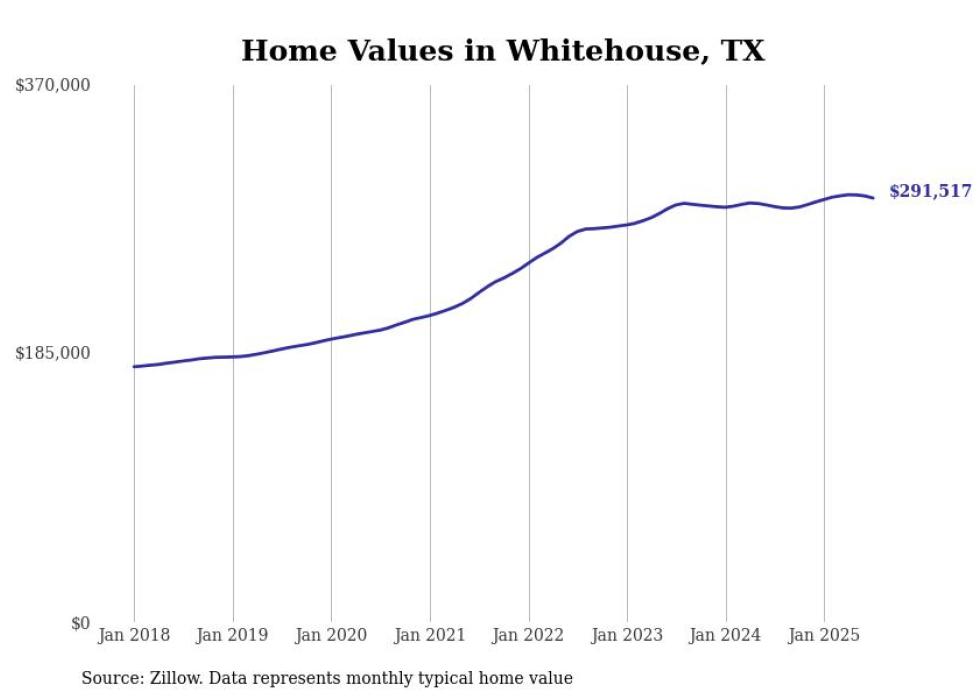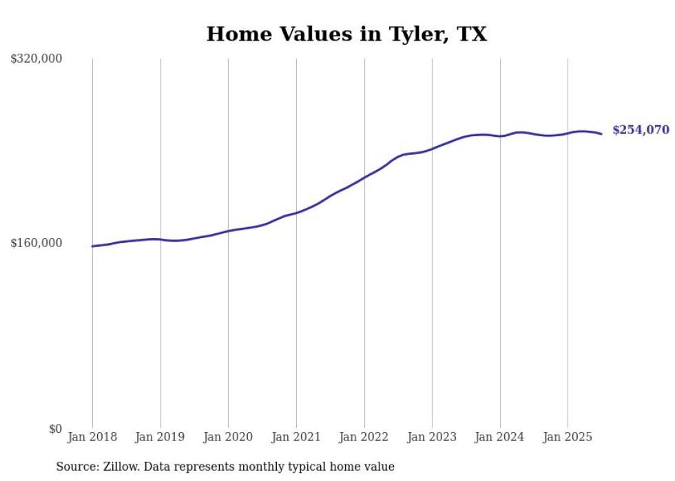 Stacker compiled a list of cities with the most expensive homes in the Tyler metro area using data from Zillow. Charts show the monthly typical home value since January 2018. All 7 cities and towns with data available were included in the list.