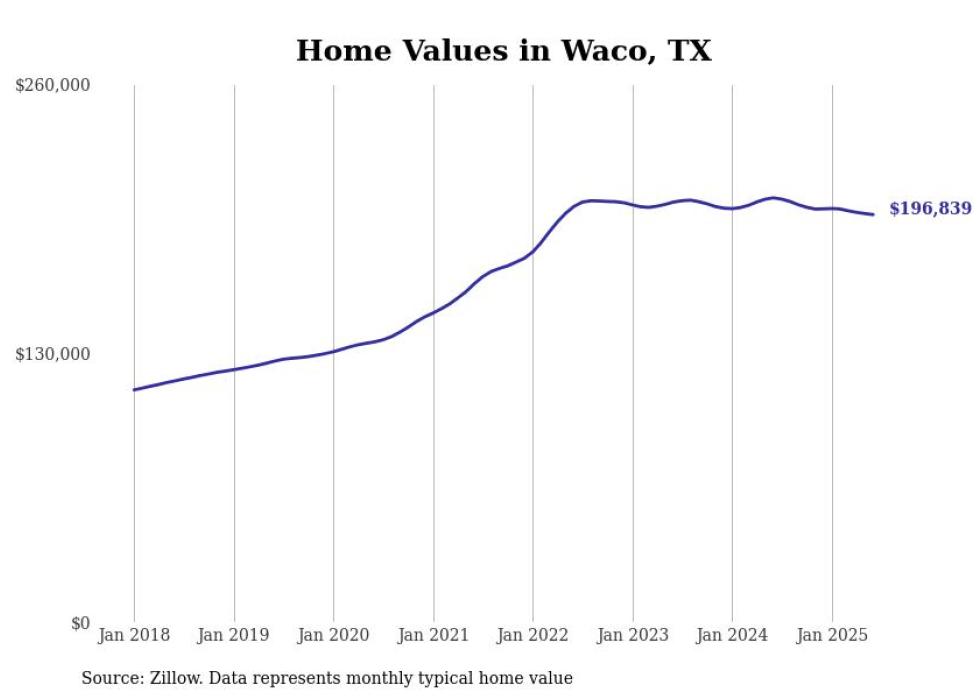 Stacker compiled a list of cities with the most expensive homes in the Waco, TX metro area using data from Zillow. Charts show the monthly typical home value since January 2018.