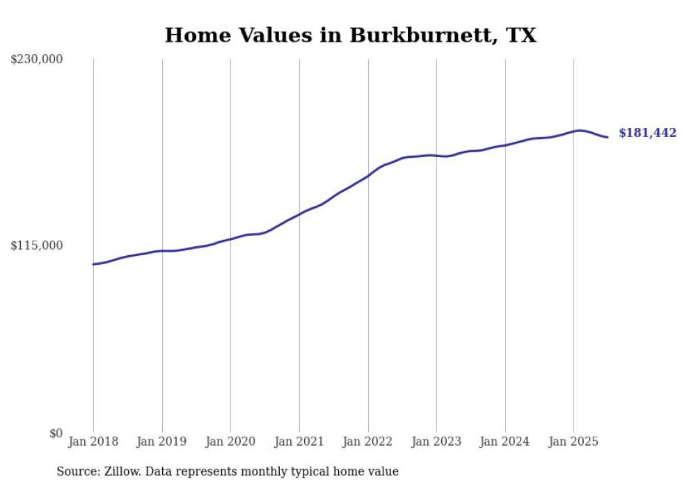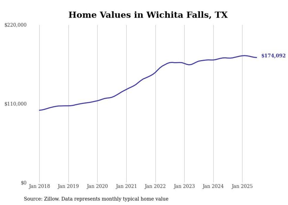 Stacker compiled a list of cities with the most expensive homes in the Wichita Falls metro area using data from Zillow. Charts show the monthly typical home value since January 2018. All 12 cities and towns with data available were included in the list.