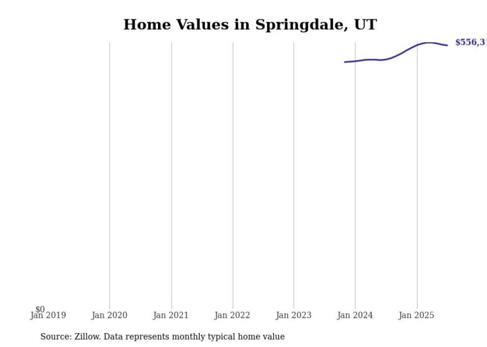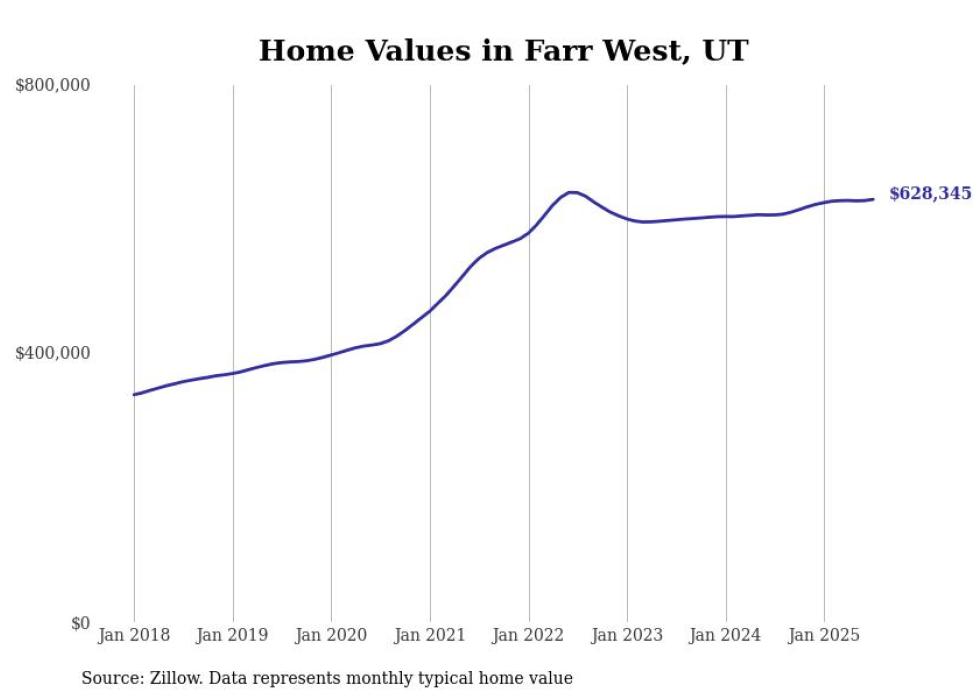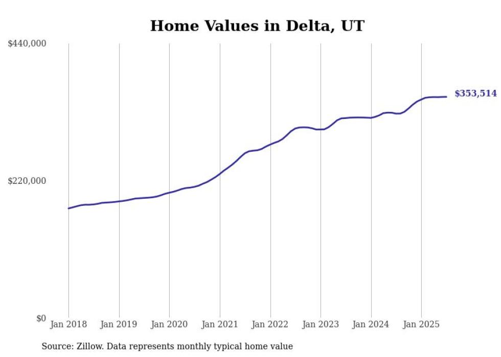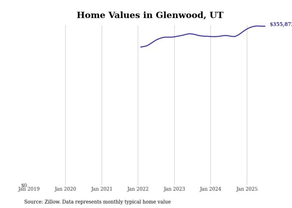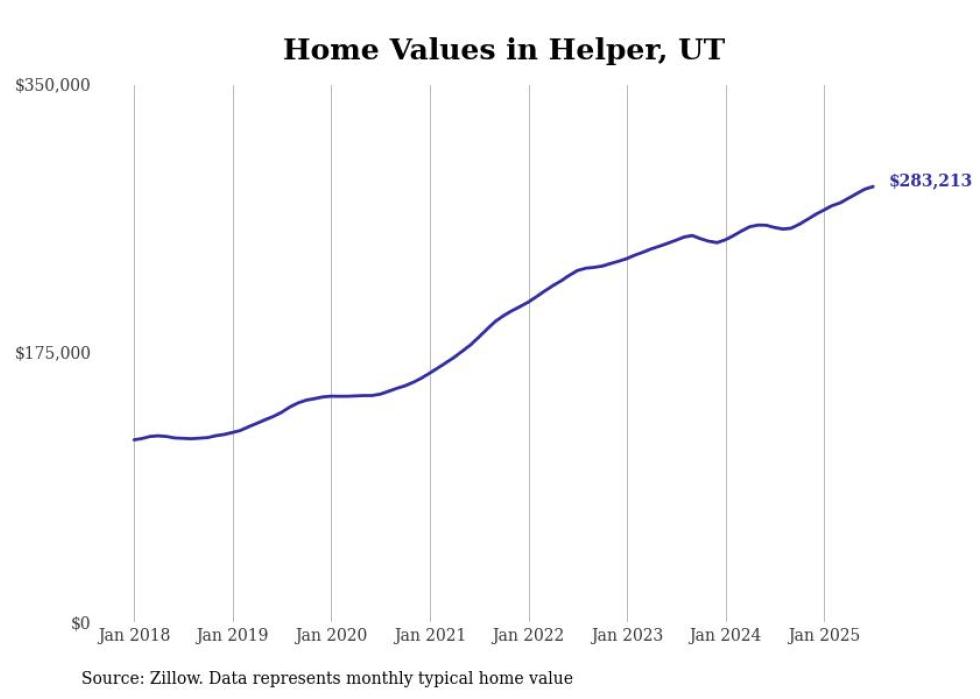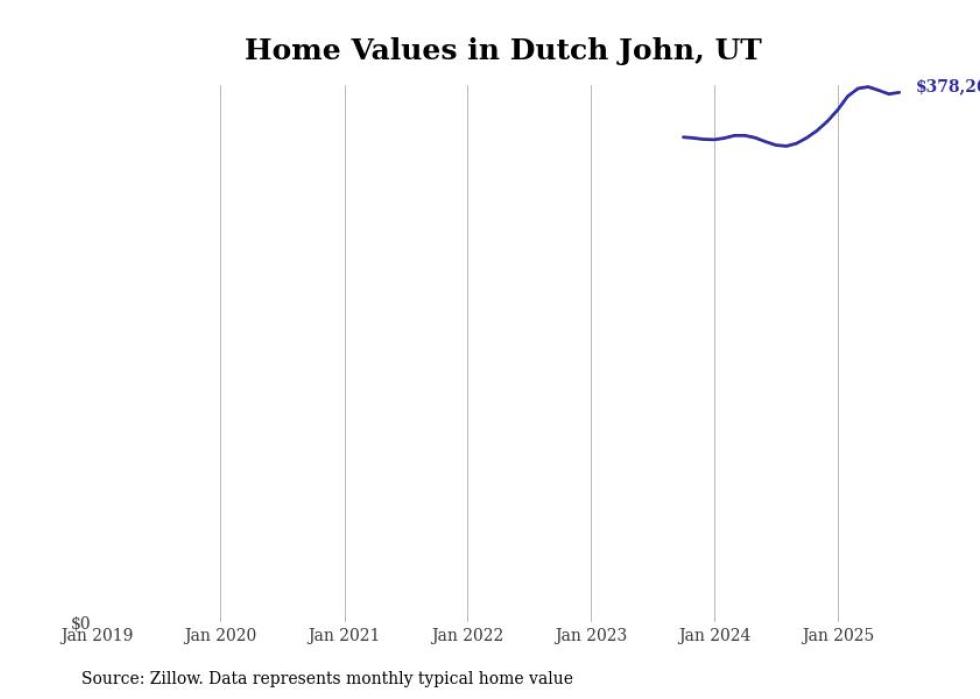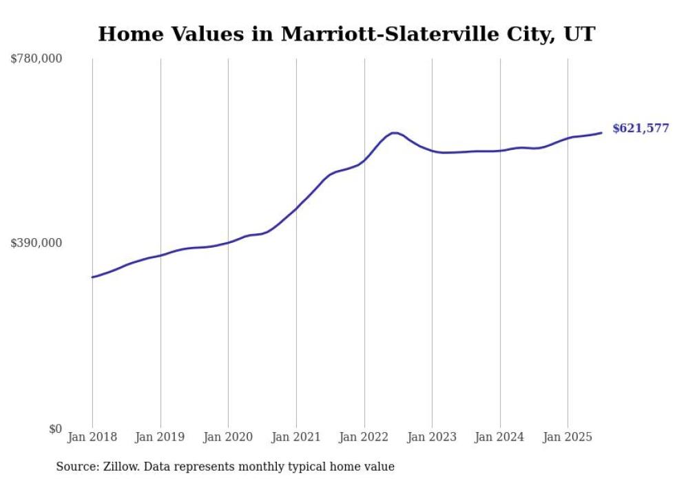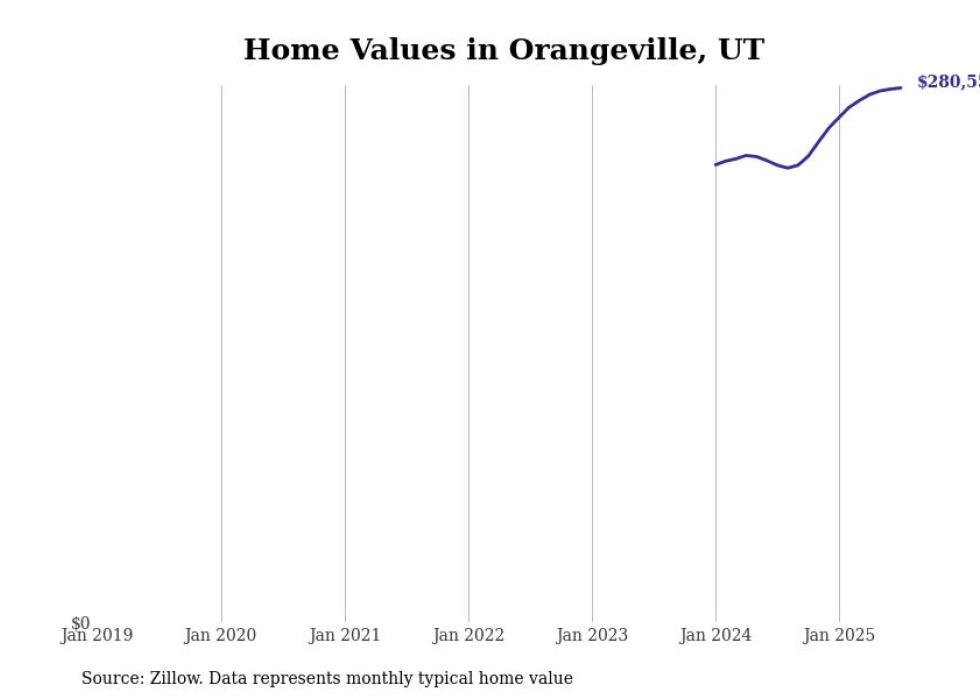 Stacker compiled a list of cities with the fastest-growing home prices in Utah using data from Zillow. Cities are ranked by the dollar change in the Zillow Home Values Index for all homes from the 12 months ending July 2025. The charts in this story were created automatically using Matplotlib. Data was available for 50 cities and towns in Utah.