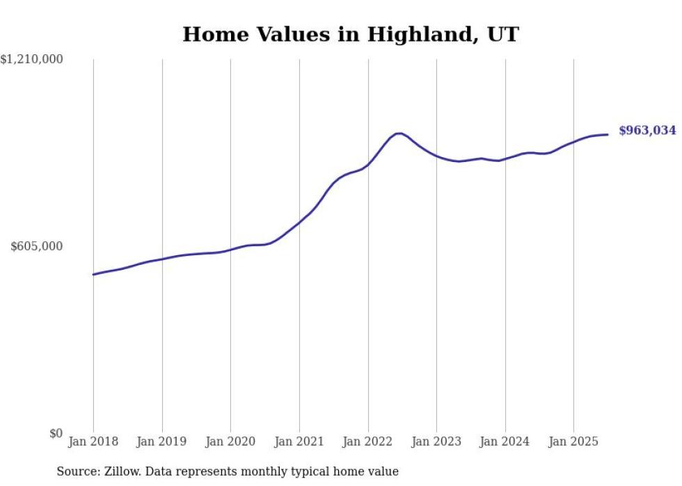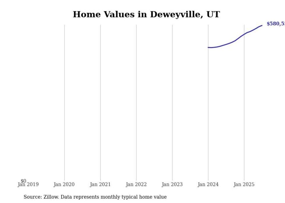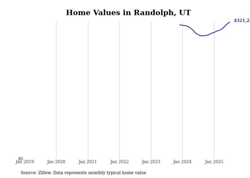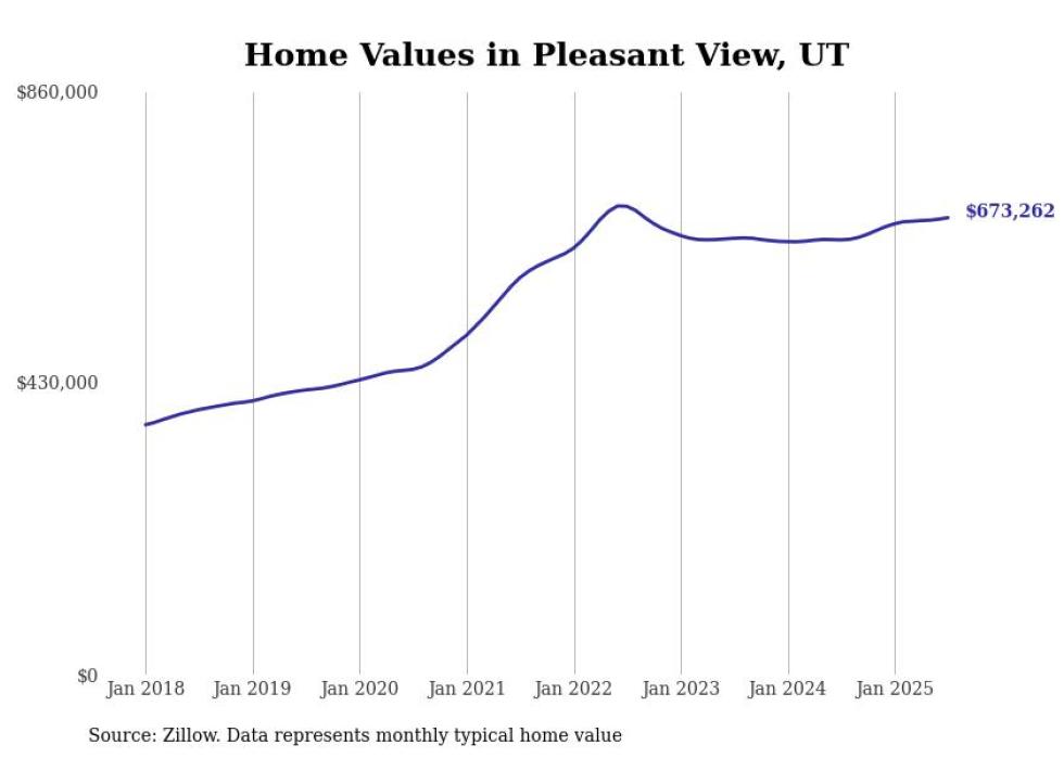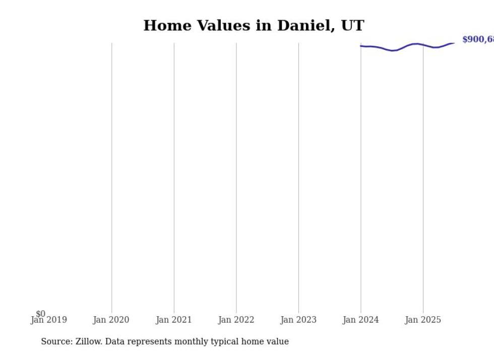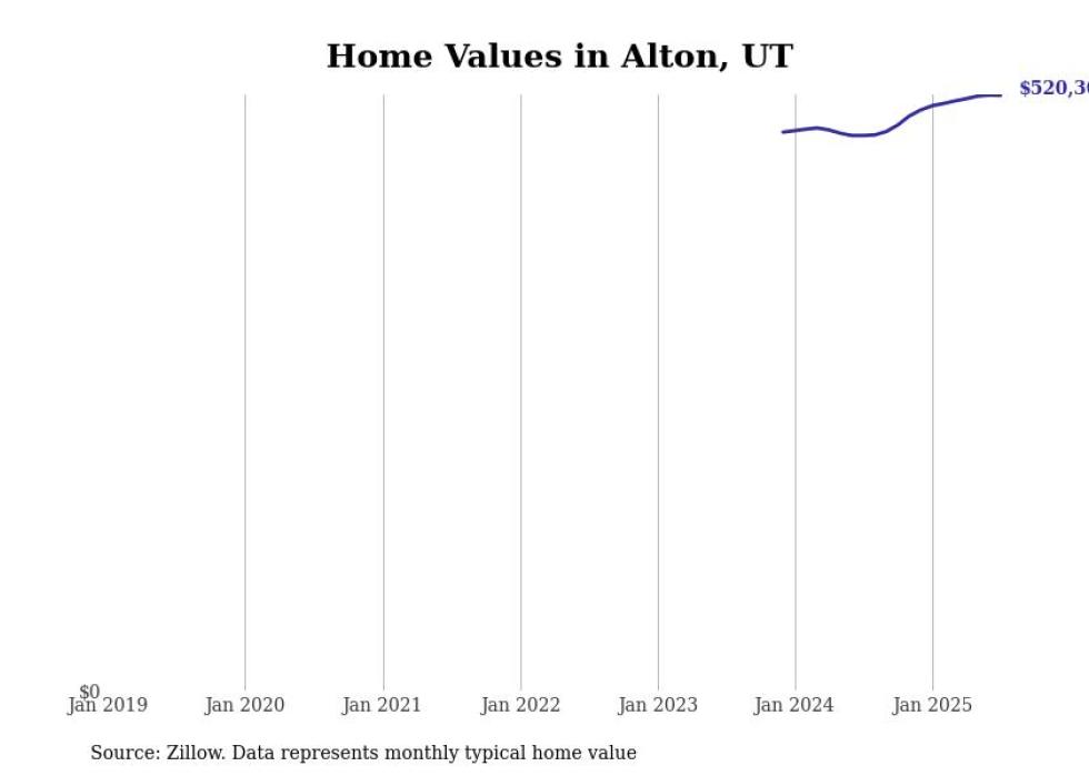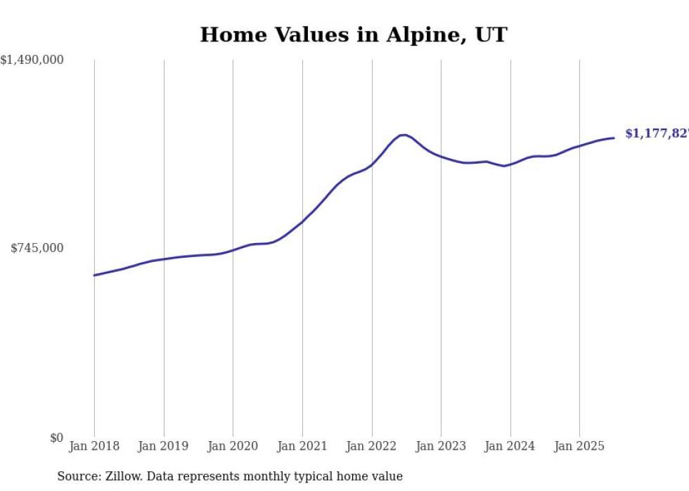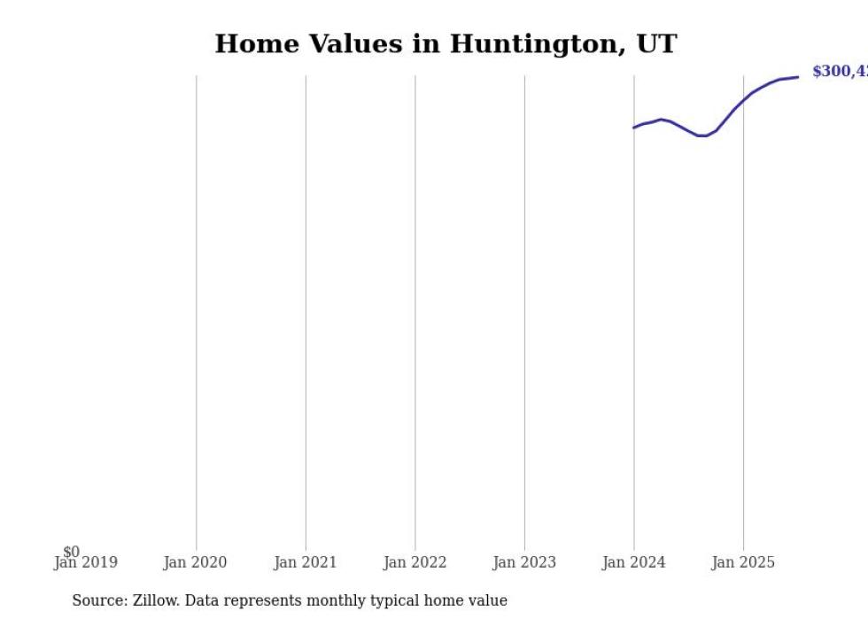 Stacker compiled a list of cities with the fastest-growing home prices in Utah using data from Zillow. Cities are ranked by the dollar change in the Zillow Home Values Index for all homes from the 12 months ending July 2025. The charts in this story were created automatically using Matplotlib. Data was available for 50 cities and towns in Utah.