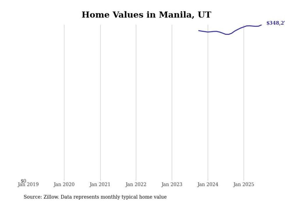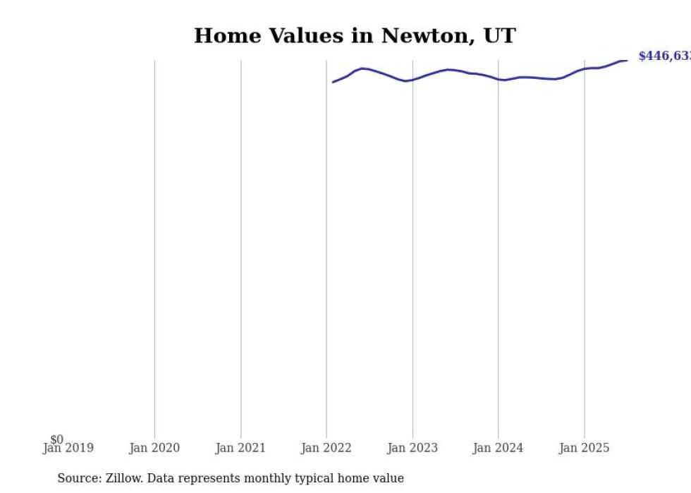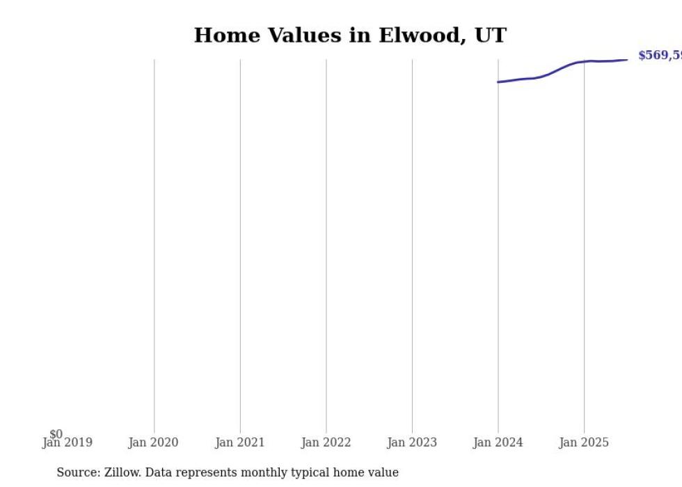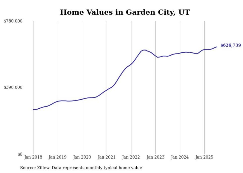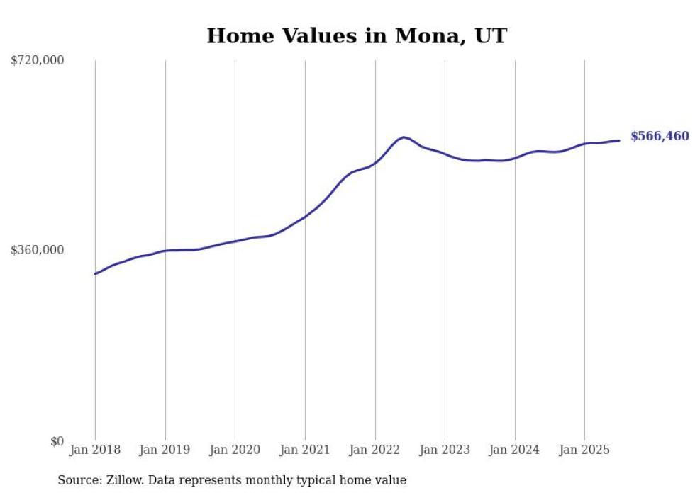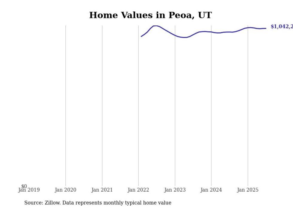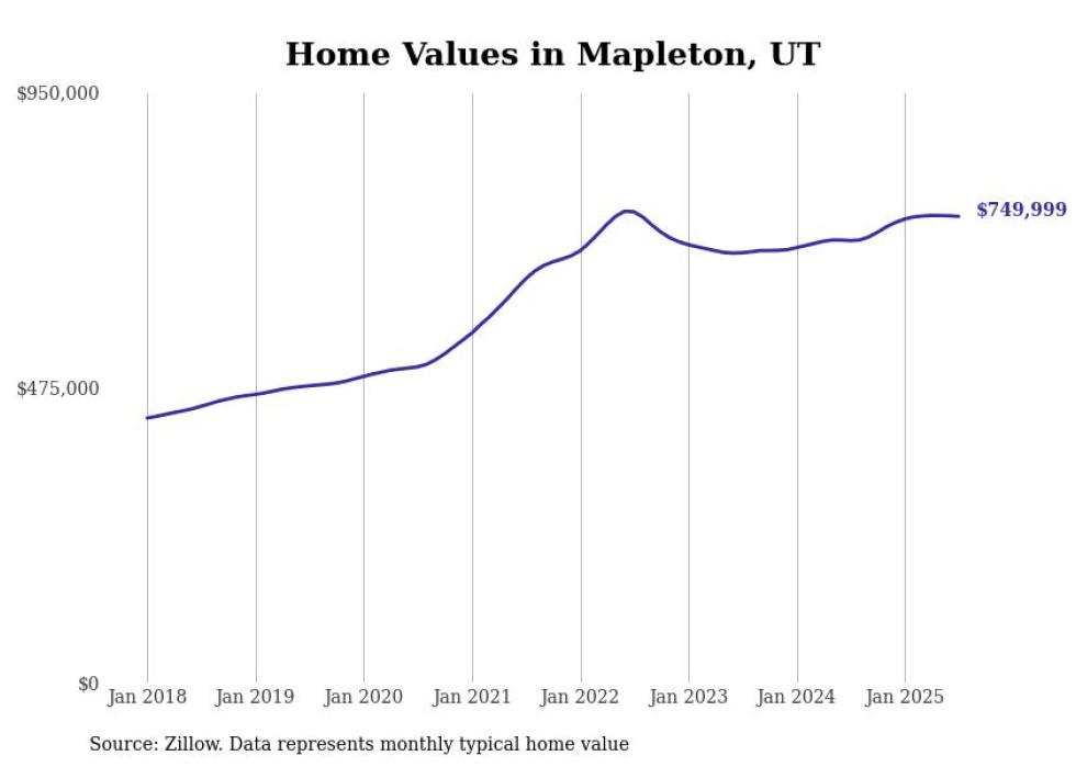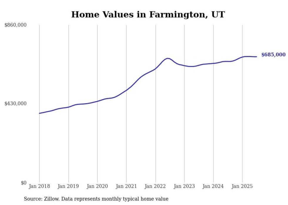 Stacker compiled a list of cities with the fastest-growing home prices in Utah using data from Zillow. Cities are ranked by the dollar change in the Zillow Home Values Index for all homes from the 12 months ending July 2025. The charts in this story were created automatically using Matplotlib. Data was available for 50 cities and towns in Utah.