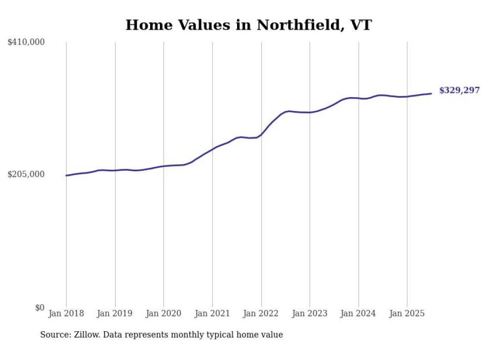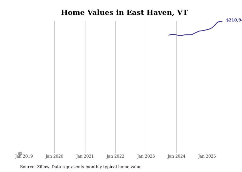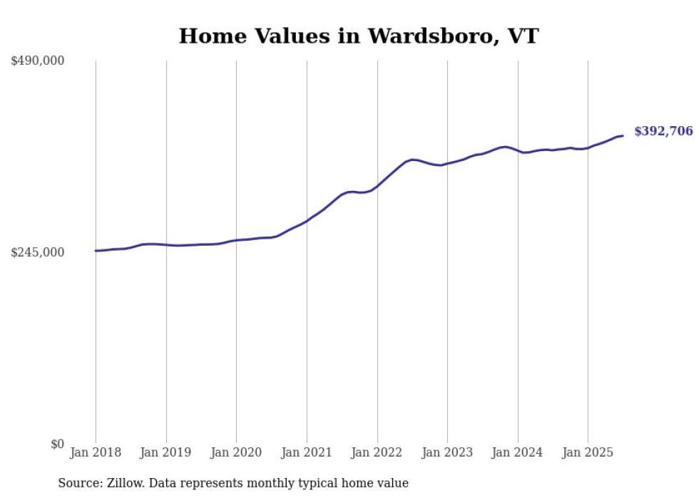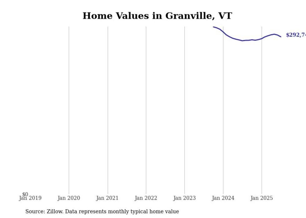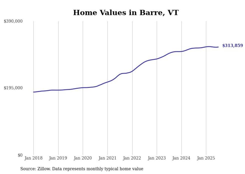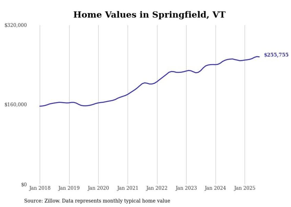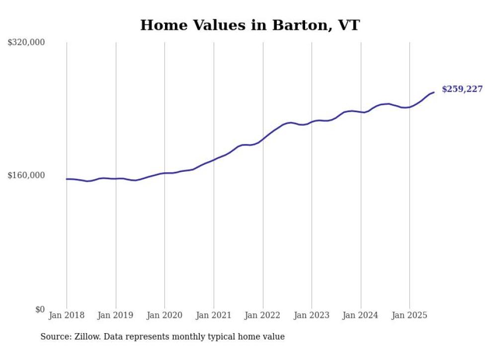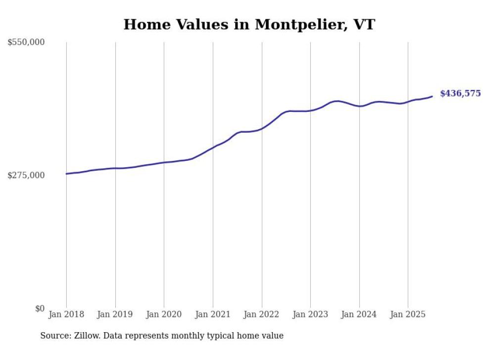 Stacker compiled a list of cities with the fastest-growing home prices in Vermont using data from Zillow. Cities are ranked by the dollar change in the Zillow Home Values Index for all homes from the 12 months ending July 2025. The charts in this story were created automatically using Matplotlib. Data was available for 50 cities and towns in Vermont.