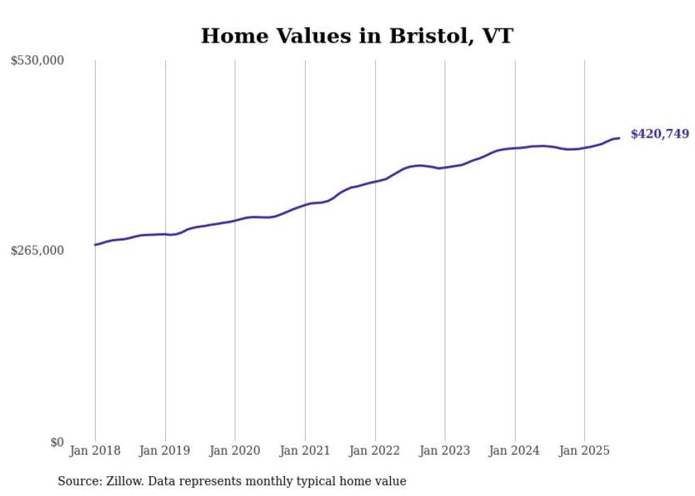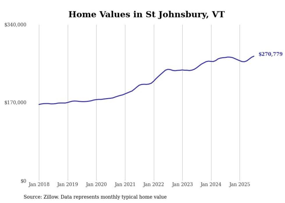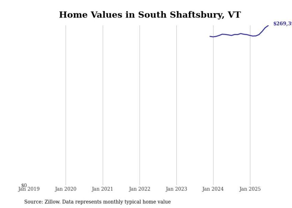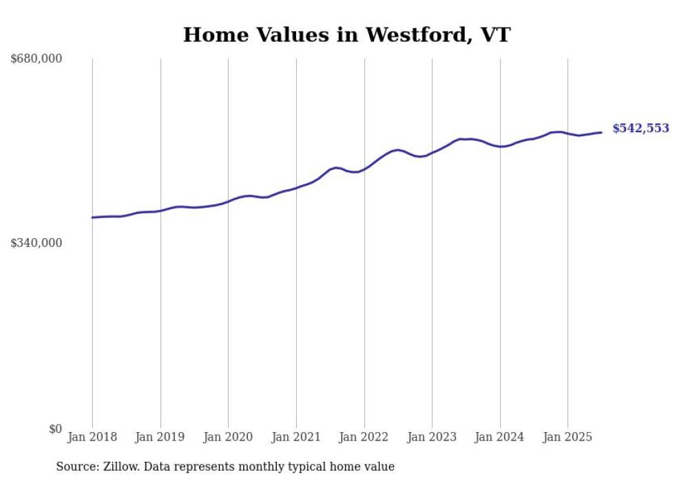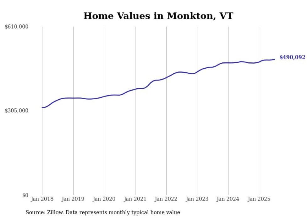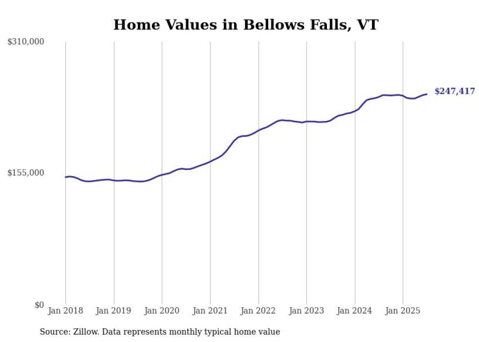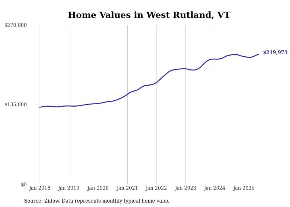 Stacker compiled a list of cities with the fastest-growing home prices in Vermont using data from Zillow. Cities are ranked by the dollar change in the Zillow Home Values Index for all homes from the 12 months ending July 2025. The charts in this story were created automatically using Matplotlib. Data was available for 50 cities and towns in Vermont.
