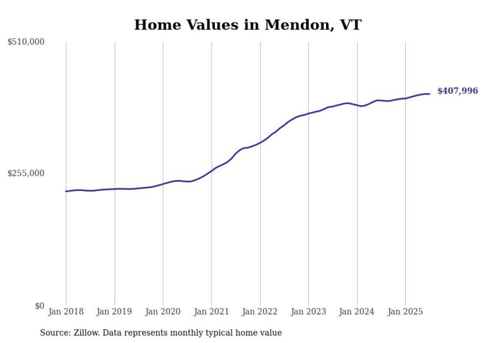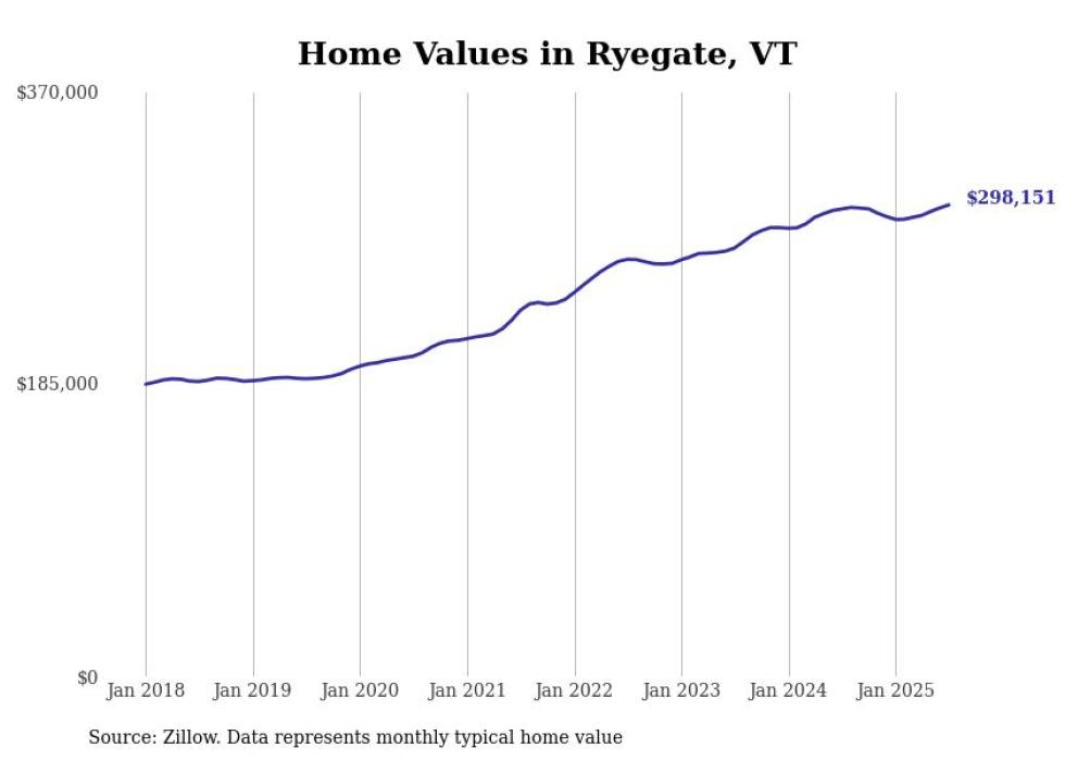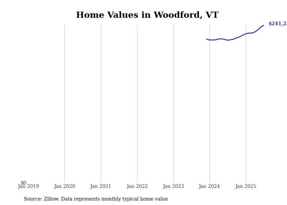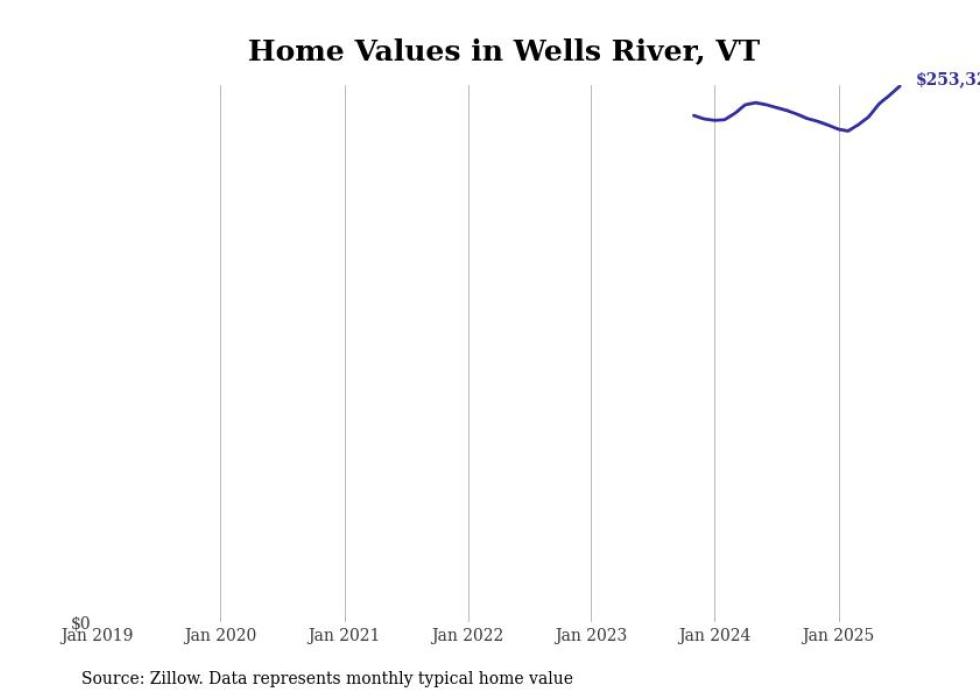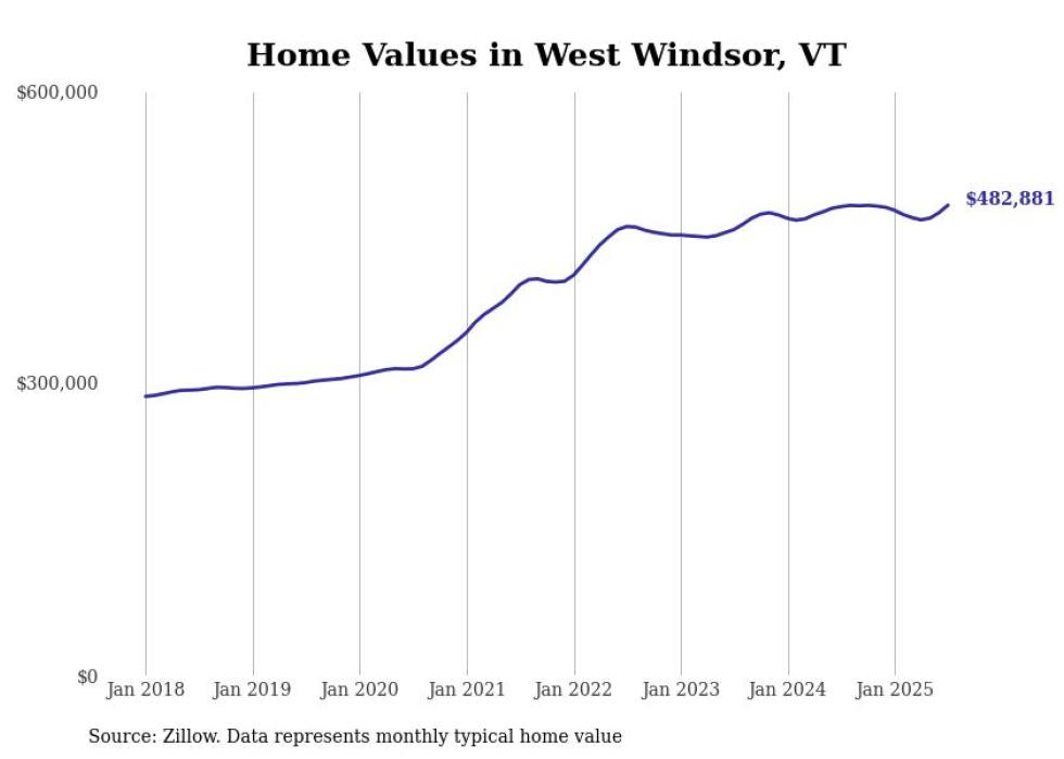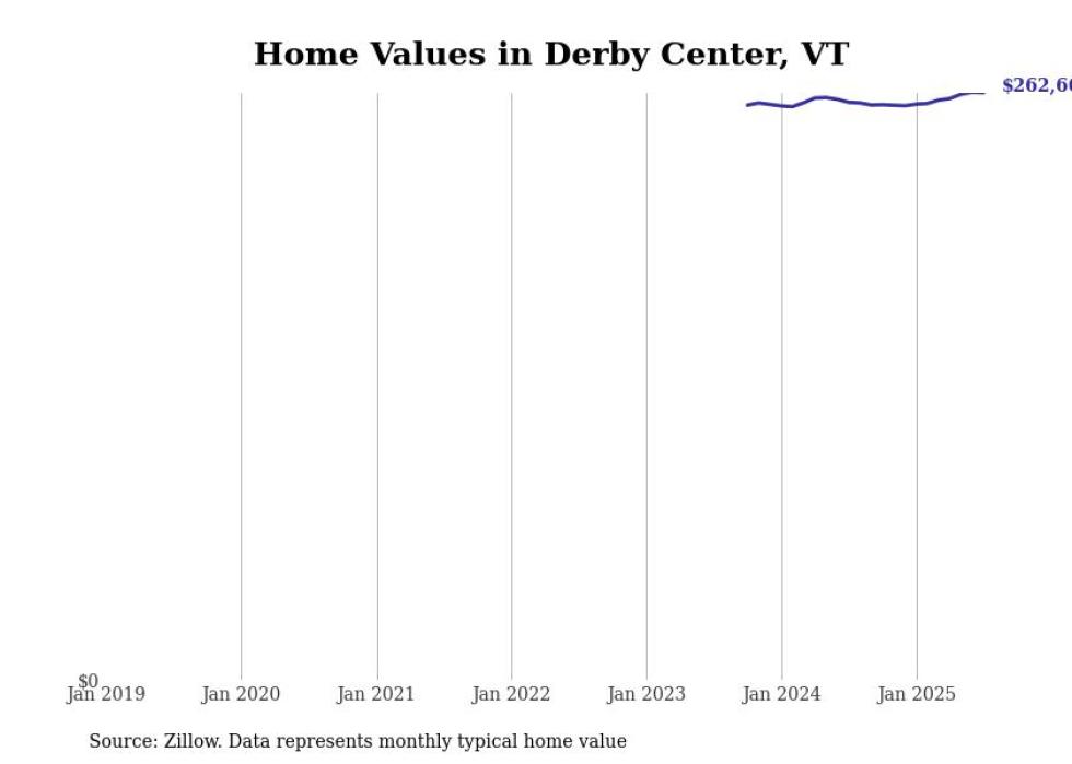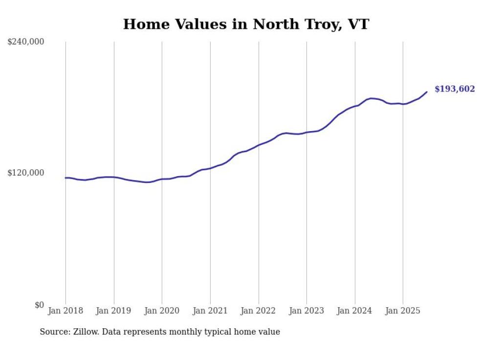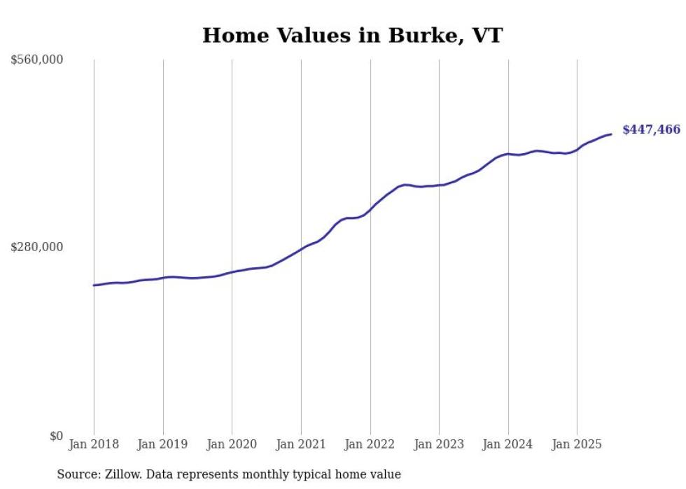 Stacker compiled a list of cities with the fastest-growing home prices in Vermont using data from Zillow. Cities are ranked by the dollar change in the Zillow Home Values Index for all homes from the 12 months ending July 2025. The charts in this story were created automatically using Matplotlib. Data was available for 50 cities and towns in Vermont.