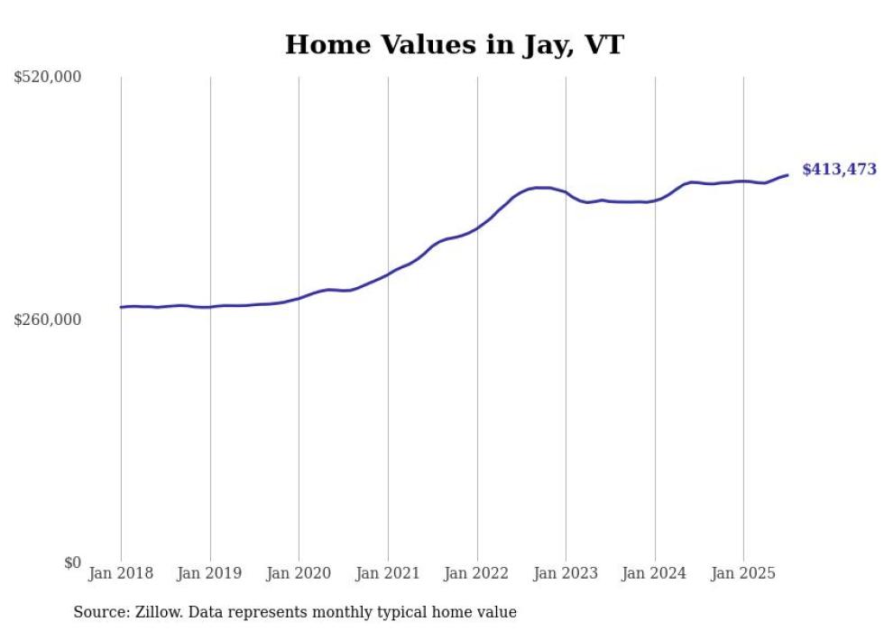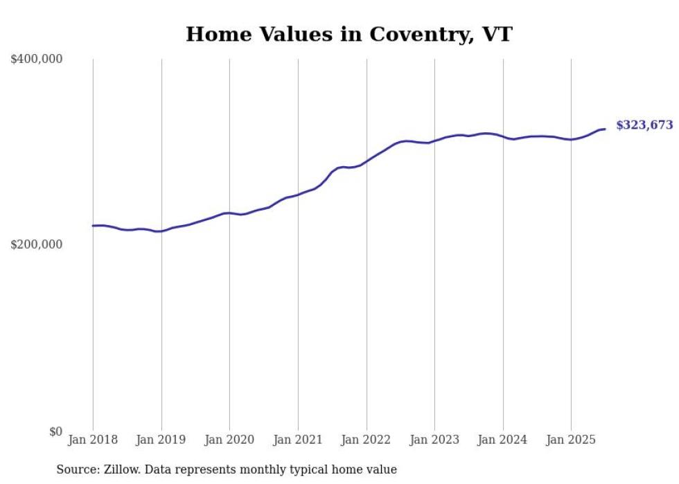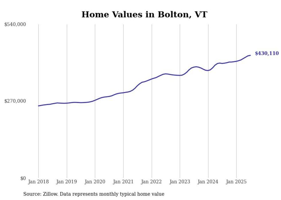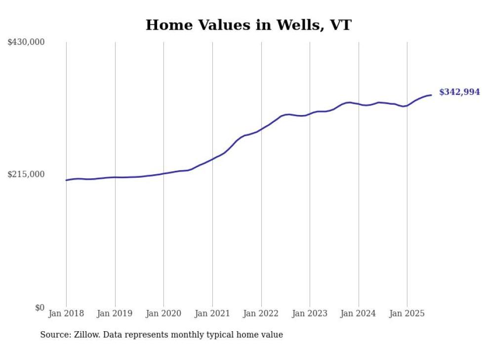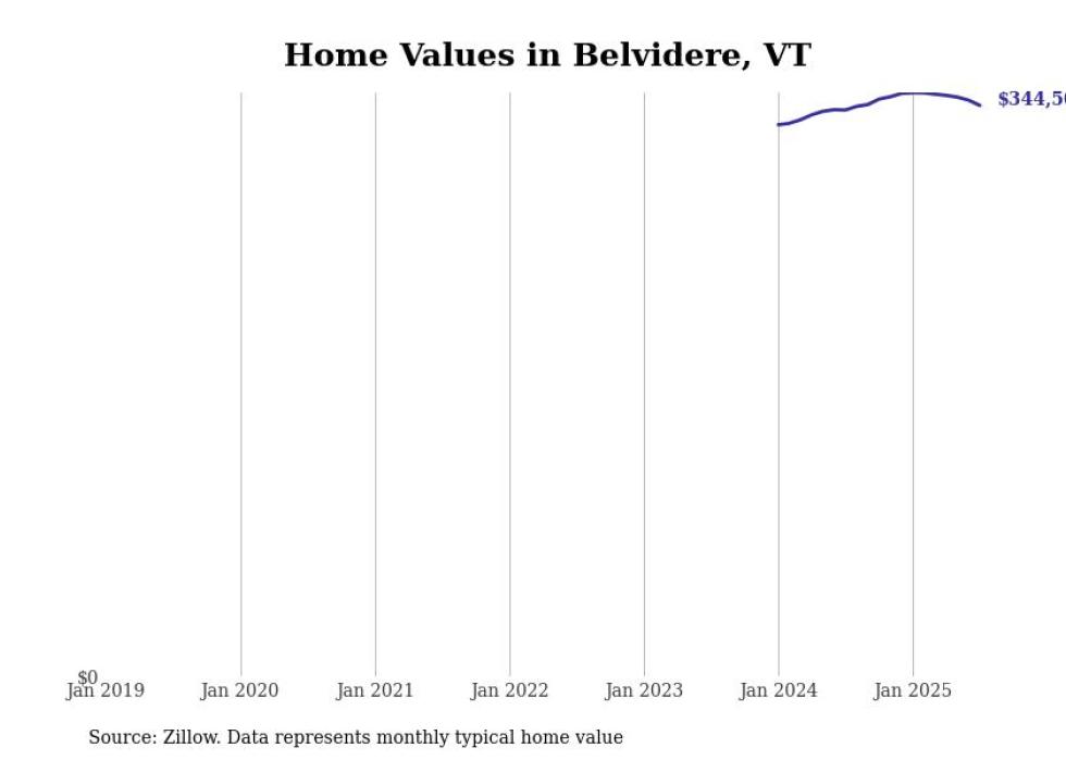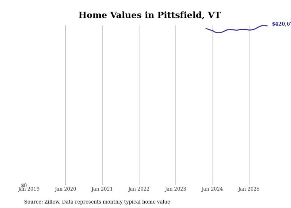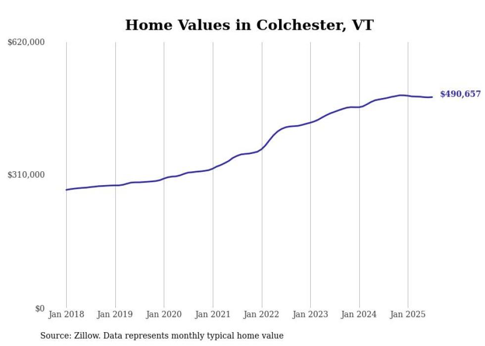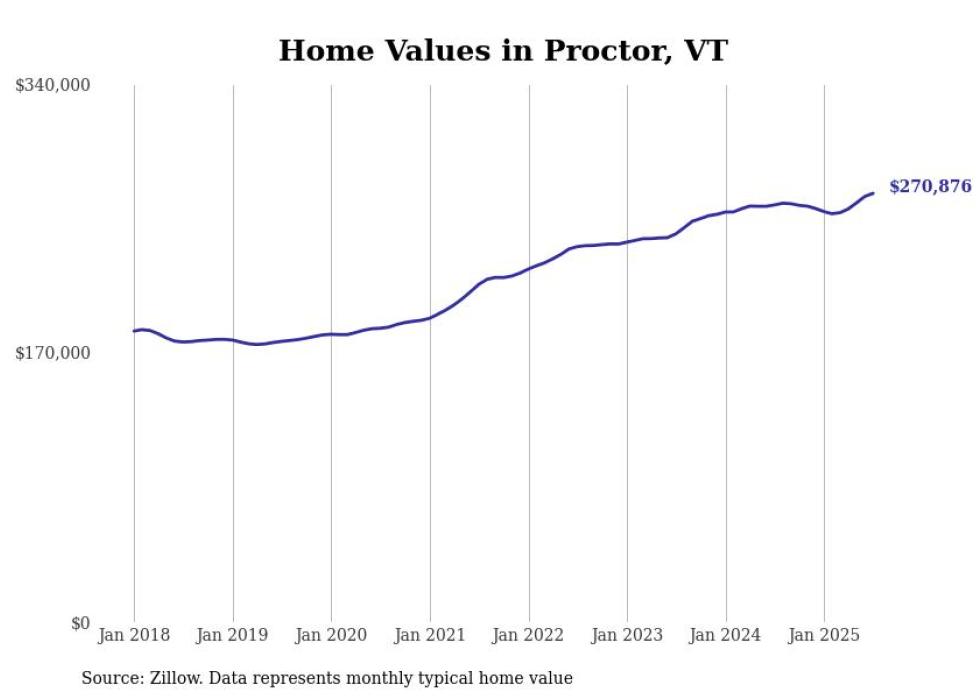 Stacker compiled a list of cities with the fastest-growing home prices in Vermont using data from Zillow. Cities are ranked by the dollar change in the Zillow Home Values Index for all homes from the 12 months ending July 2025. The charts in this story were created automatically using Matplotlib. Data was available for 50 cities and towns in Vermont.