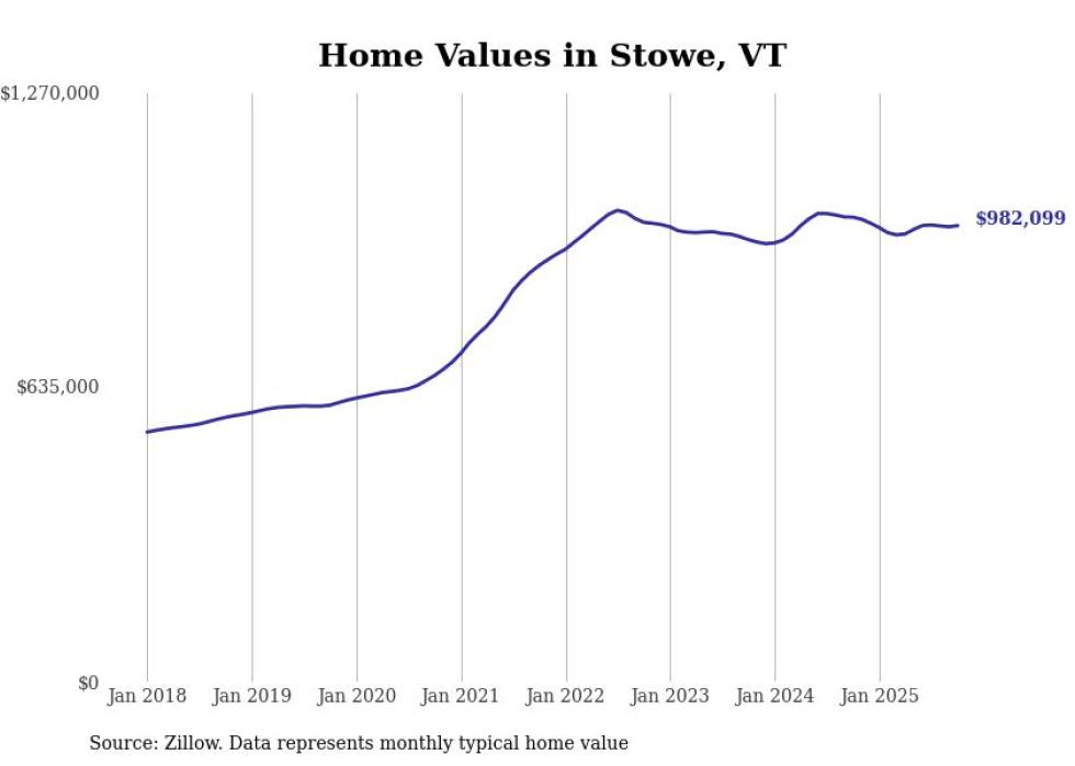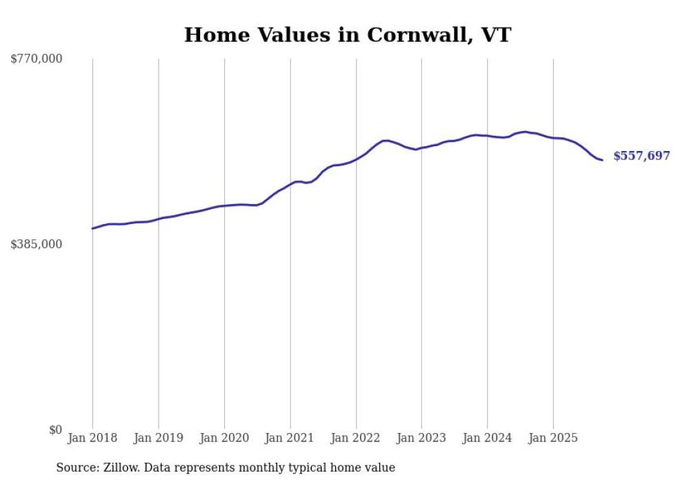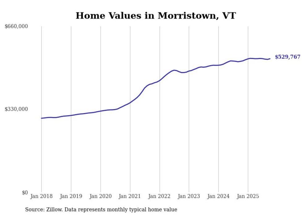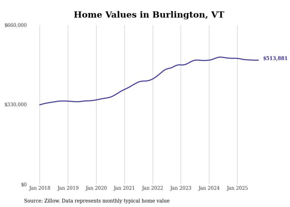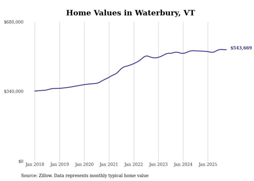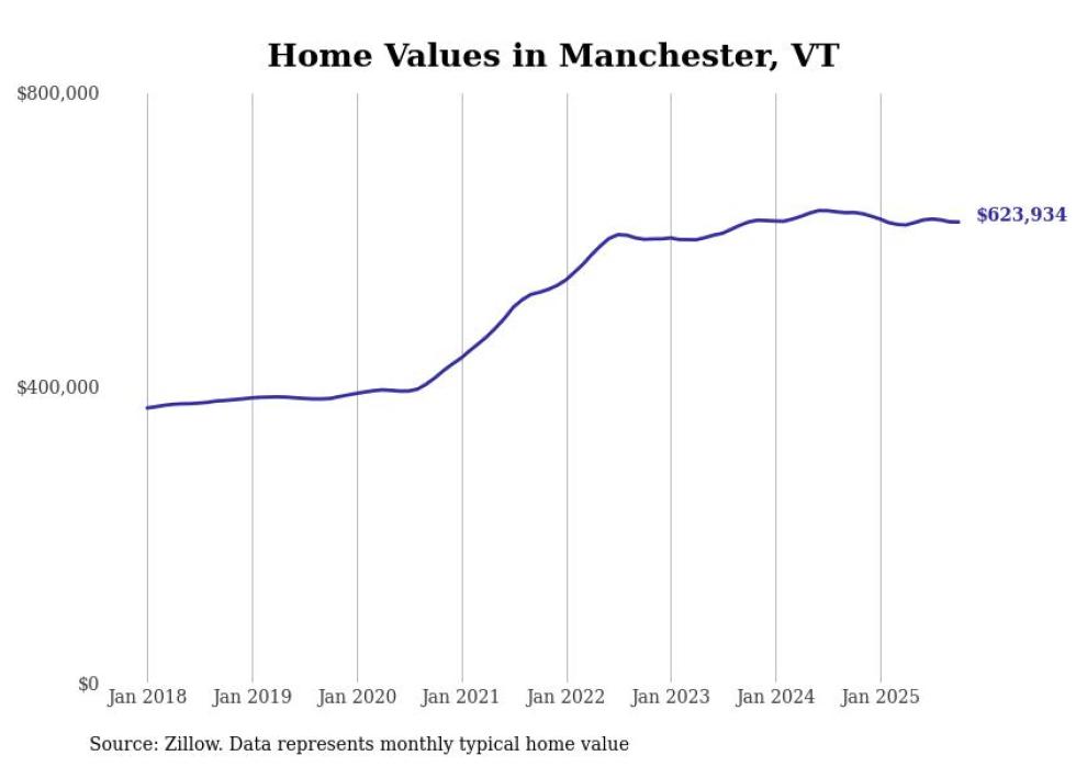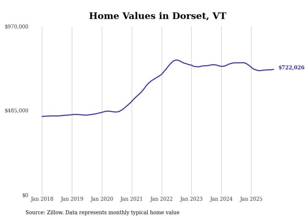 Stacker compiled a list of cities with the most expensive homes in Vermont using data from Zillow. Cities are ranked by the Zillow Home Values Index for all homes as of October 2025. The charts in this story were created automatically using Matplotlib.