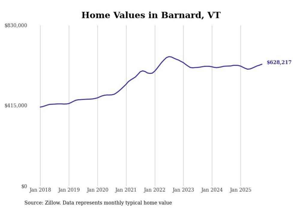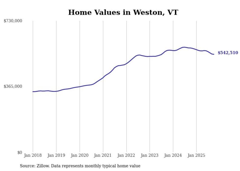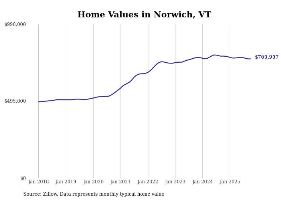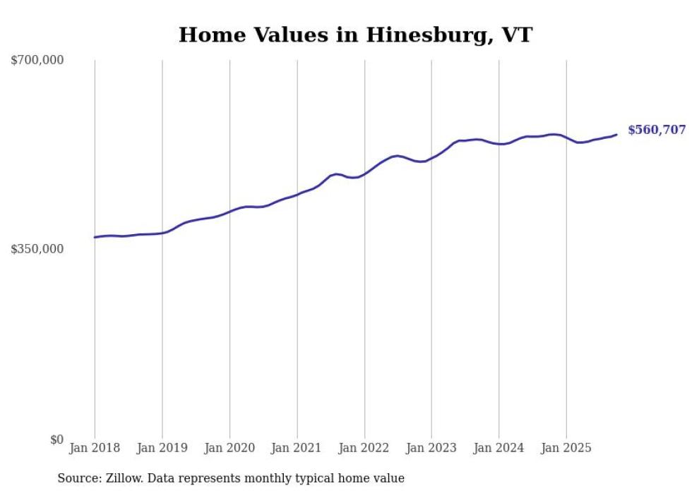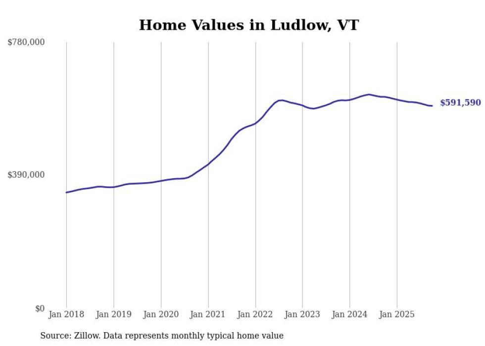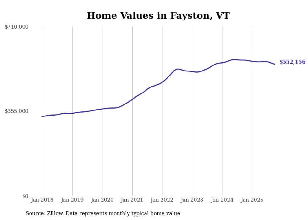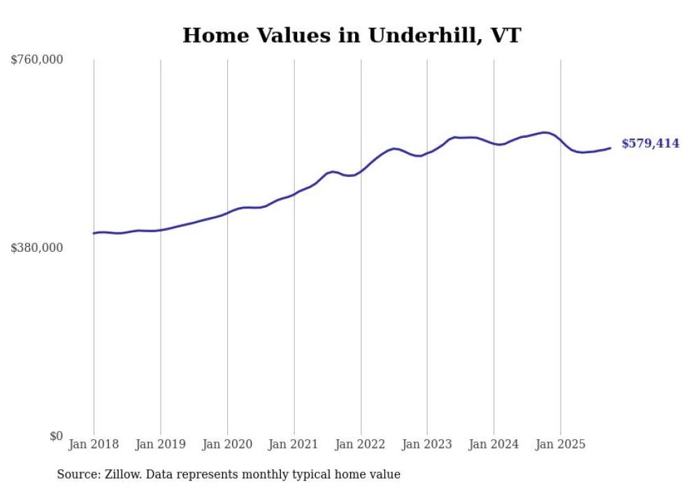Stacker compiled a list of cities with the most expensive homes in Vermont using data from Zillow. Cities are ranked by the Zillow Home Values Index for all homes as of October 2025. The charts in this story were created automatically using Matplotlib.