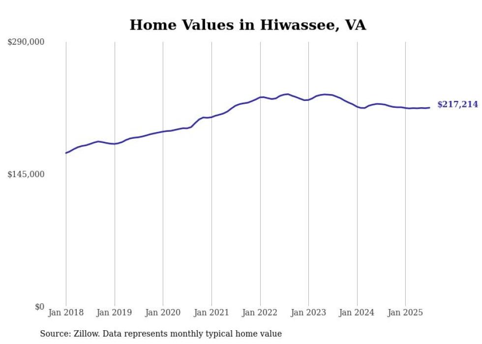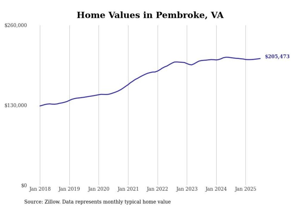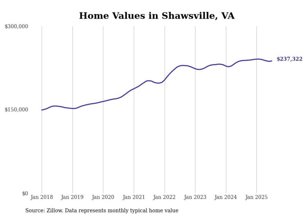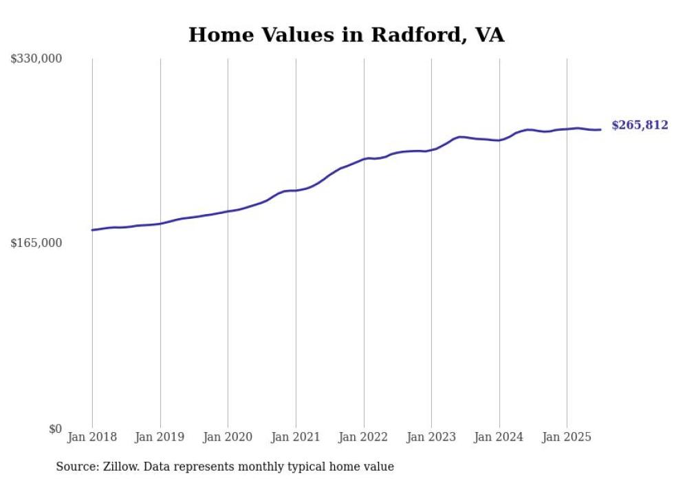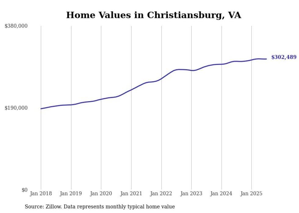 Stacker compiled a list of cities with the most expensive homes in the Blacksburg metro area using data from Zillow. Charts show the monthly typical home value since January 2018. All 18 cities and towns with data available were included in the list.
