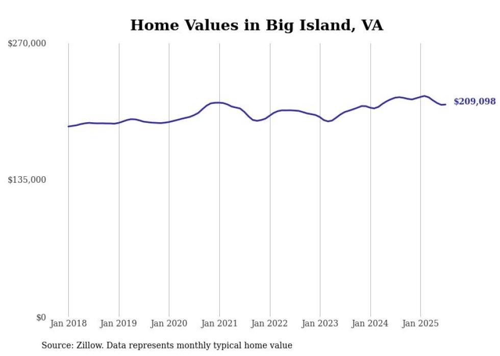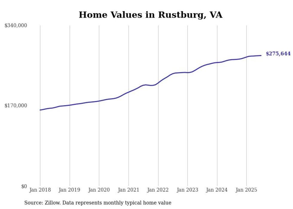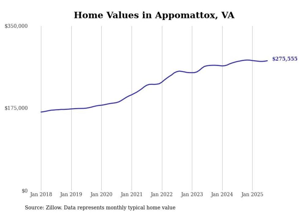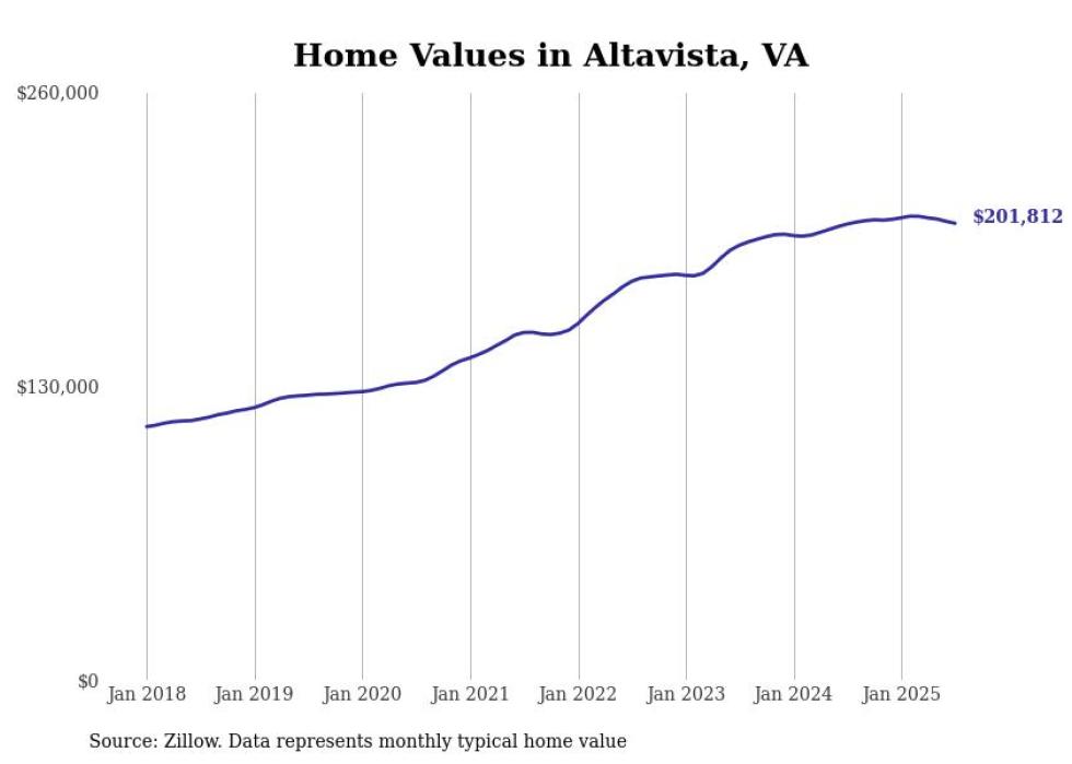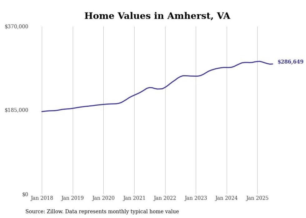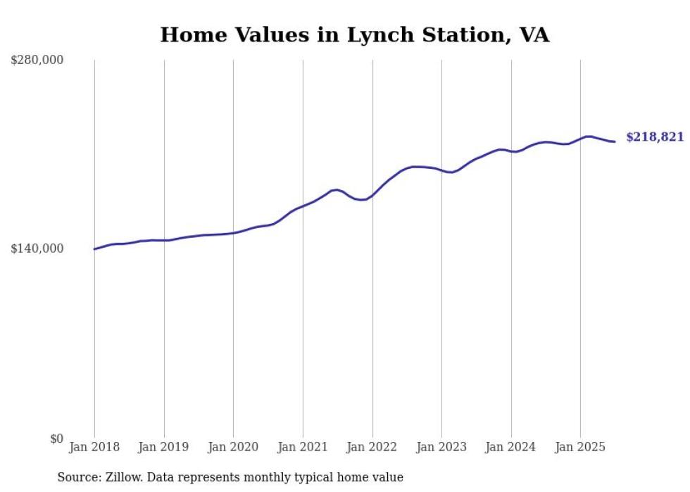 Stacker compiled a list of cities with the most expensive homes in the Lynchburg metro area using data from Zillow. Charts show the monthly typical home value since January 2018. All 28 cities and towns with data available were included in the list.