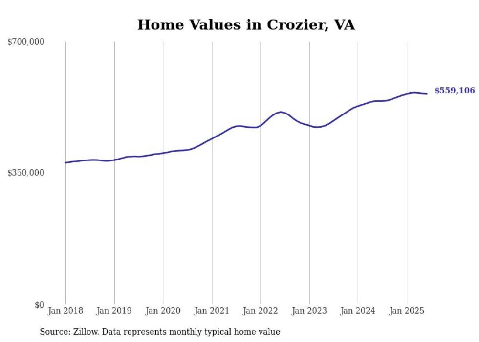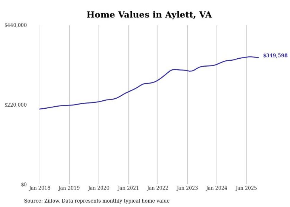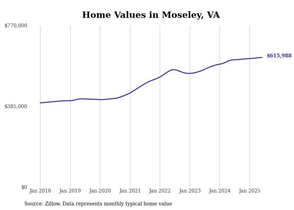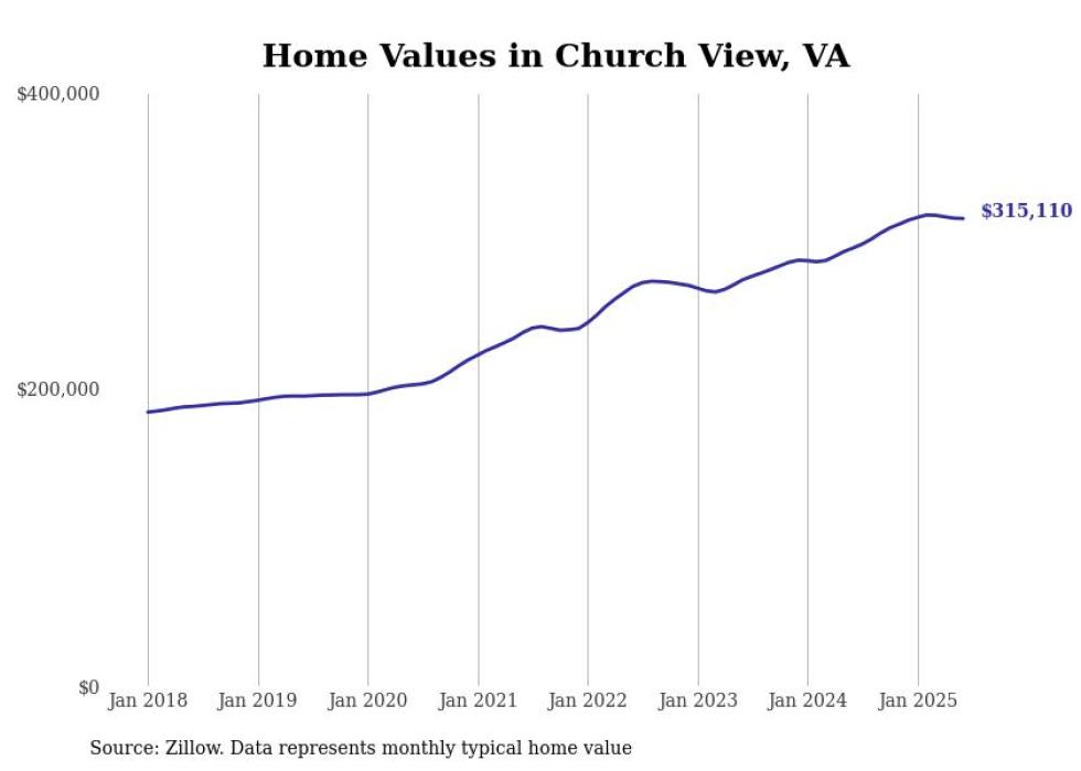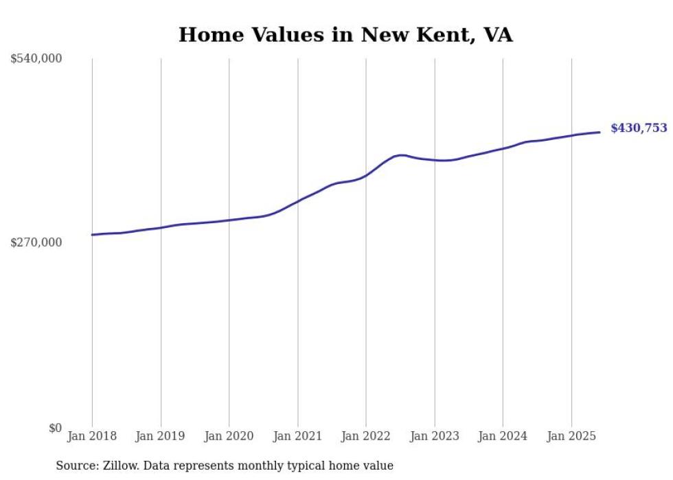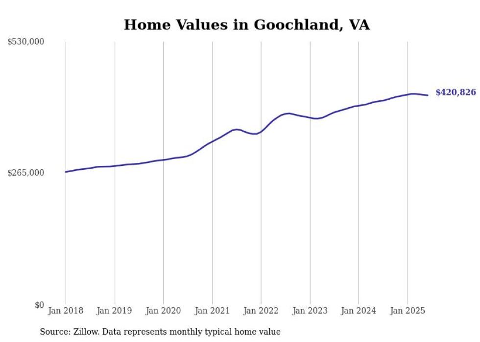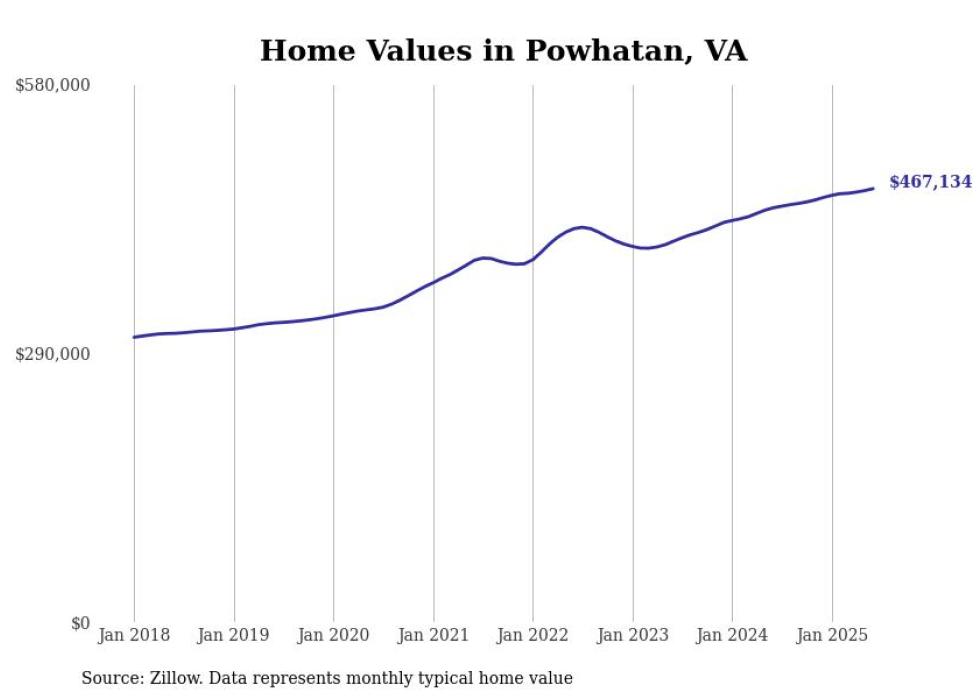 Stacker compiled a list of cities with the most expensive homes in the Richmond, VA metro area using data from Zillow. Charts show the monthly typical home value since January 2018.