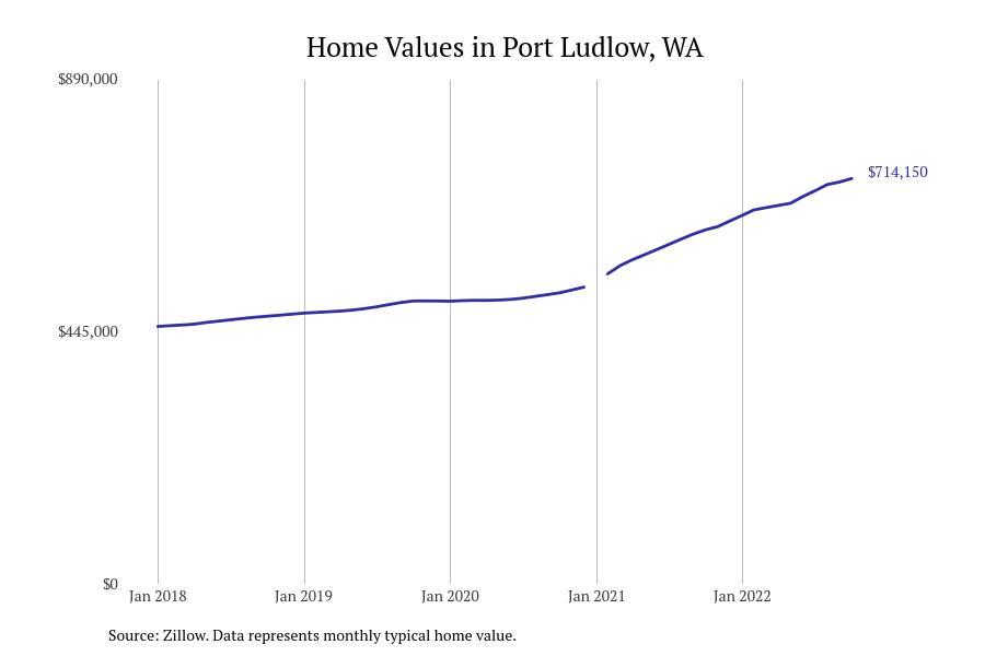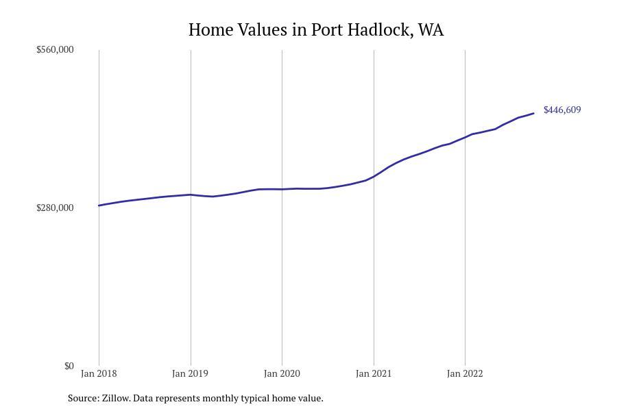 Stacker compiled a list of places with the fastest growing home prices in Jefferson County, WA using data from Zillow. Places are ranked by the dollar change Zillow Home Values Index for all homes from October 2021 to October 2022. The ZVHI represents a seasonally adjusted price for the middle market for all homes. All 8 cities and towns with data available were included in the list. Charts for each place show the monthly typical home value since January 2018.