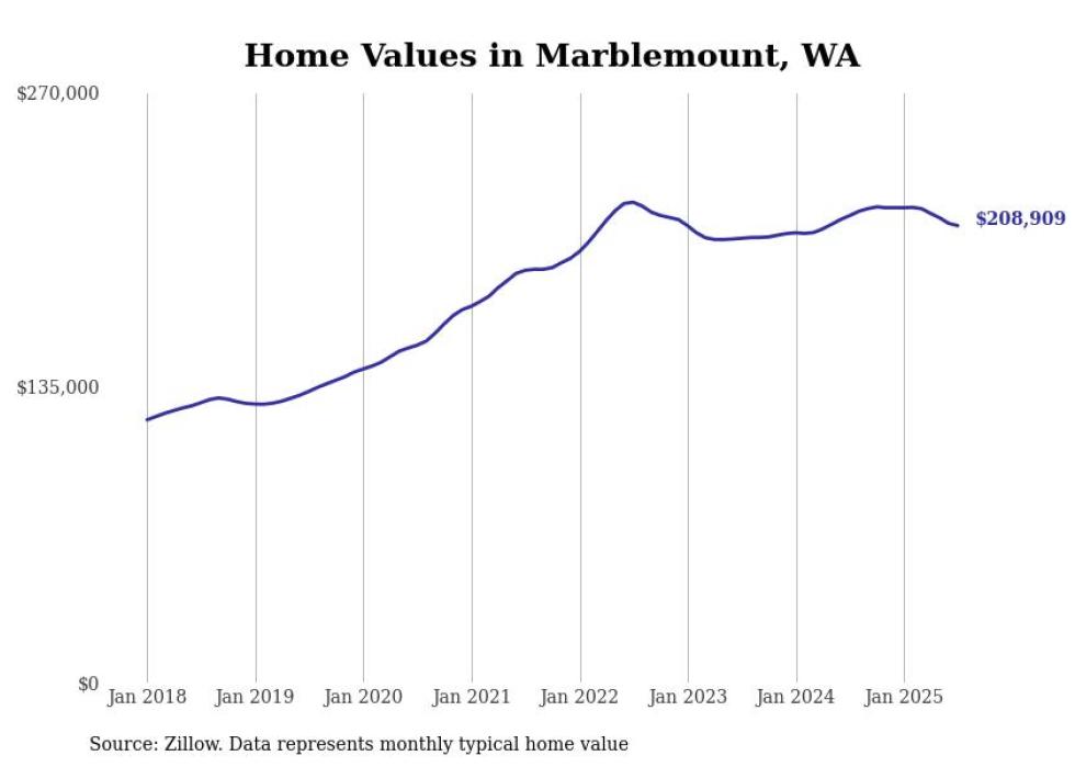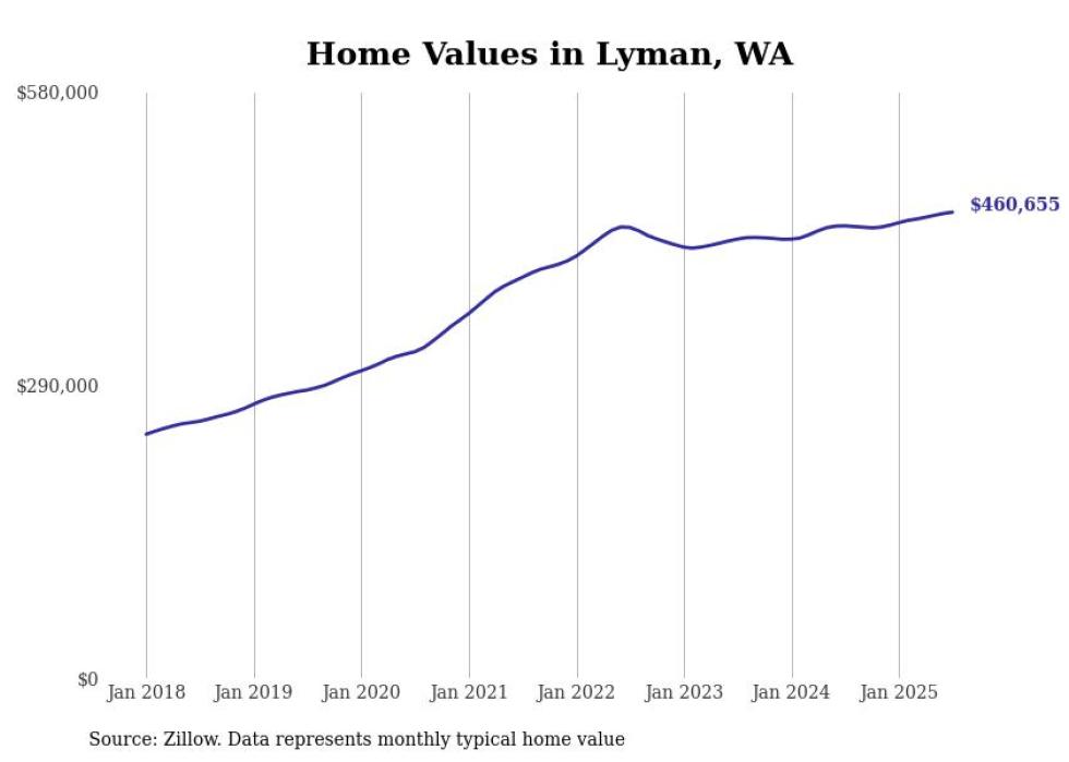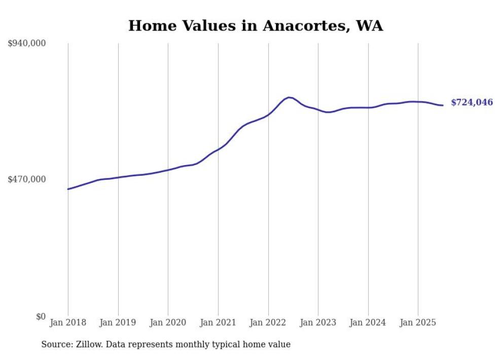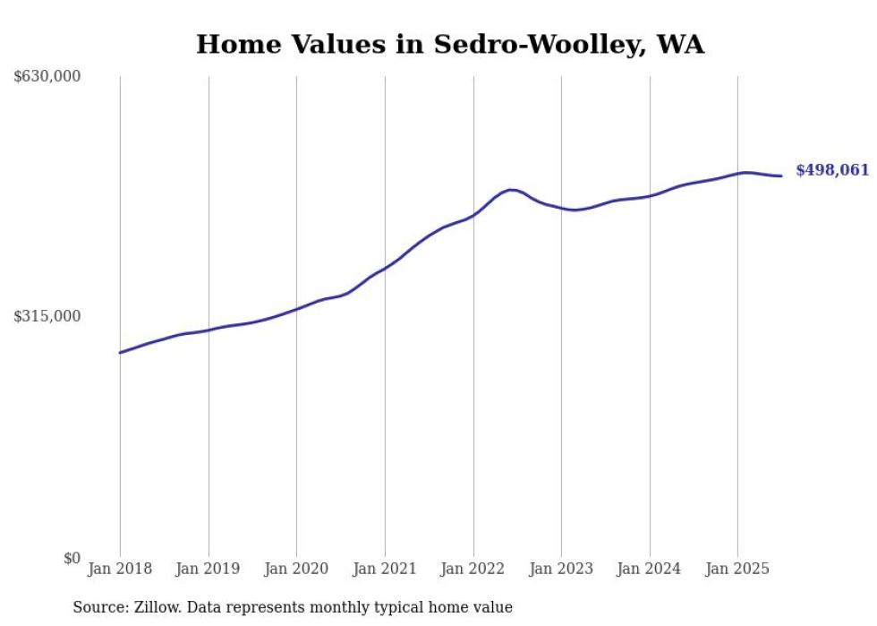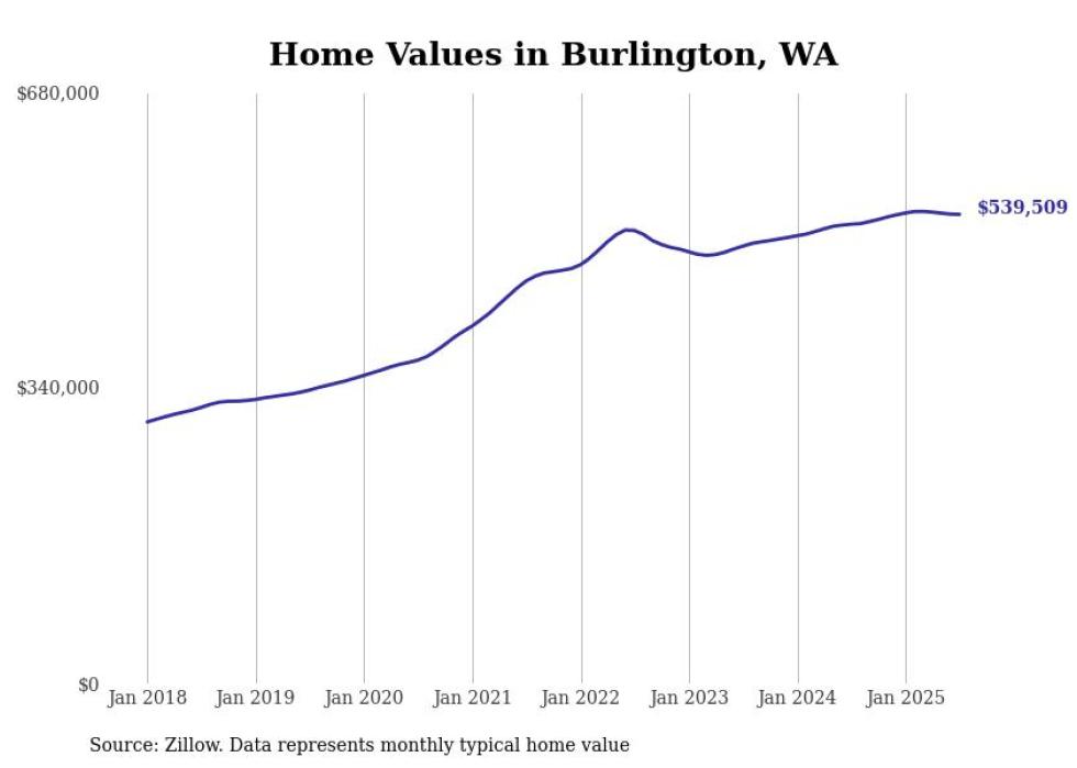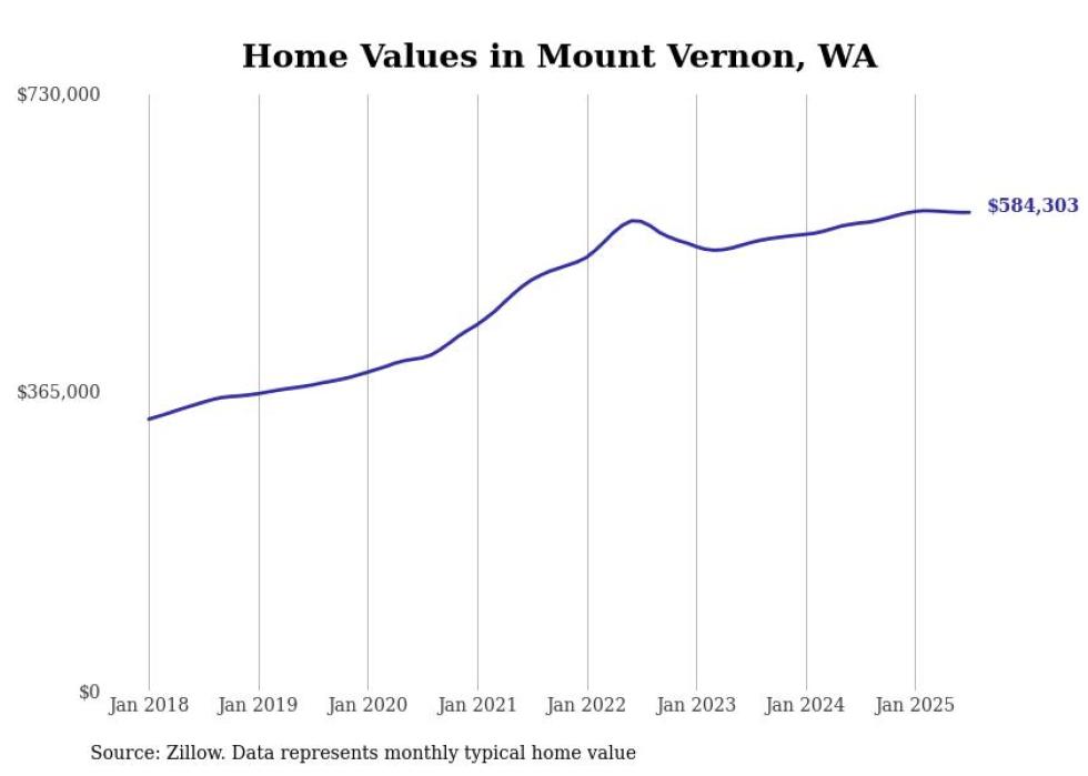 Stacker compiled a list of cities with the most expensive homes in the Mount Vernon metro area using data from Zillow. Charts show the monthly typical home value since January 2018. All 9 cities and towns with data available were included in the list.