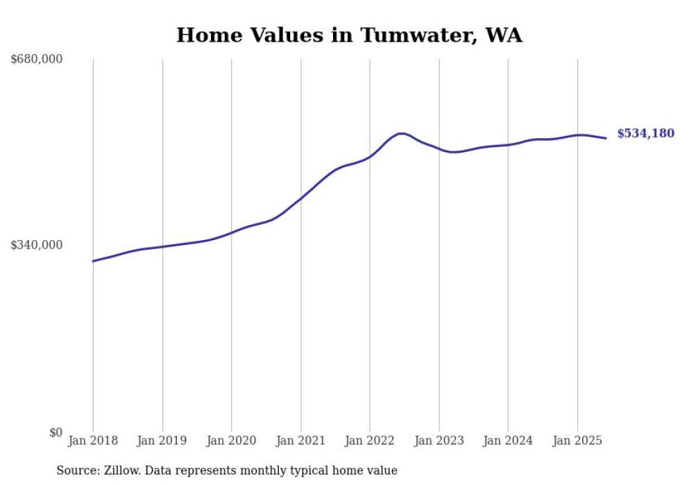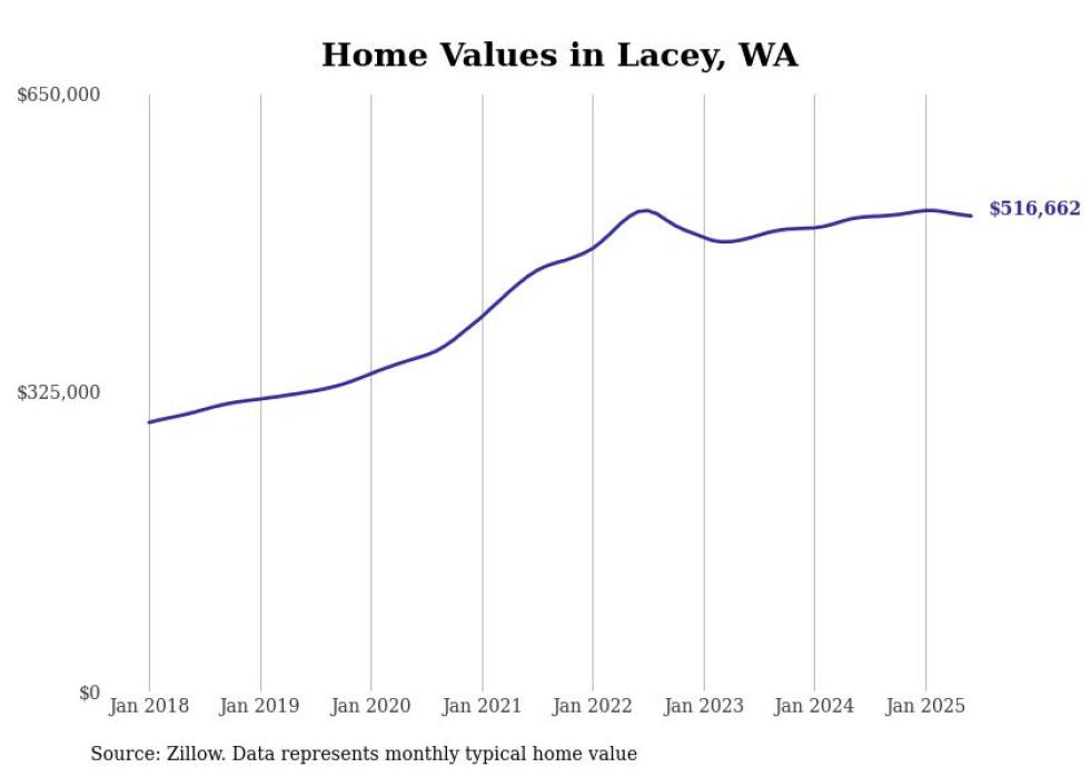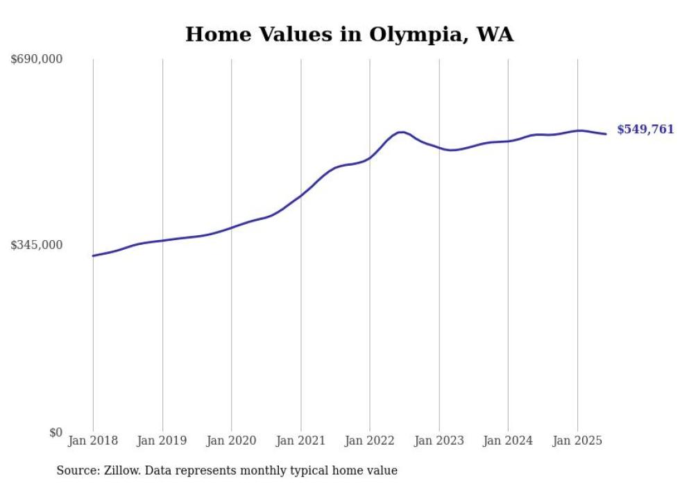 Stacker compiled a list of cities with the most expensive homes in the Olympia-Lacey-Tumwater, WA metro area using data from Zillow. Charts show the monthly typical home value since January 2018.