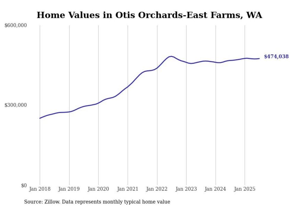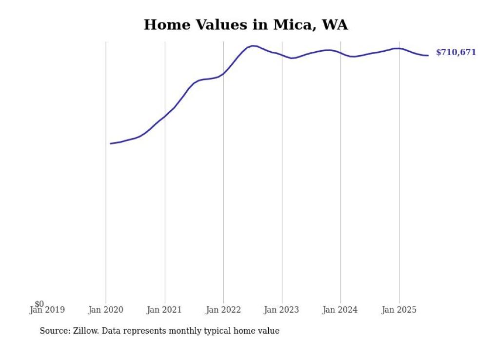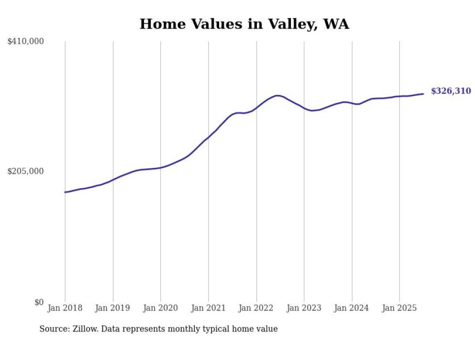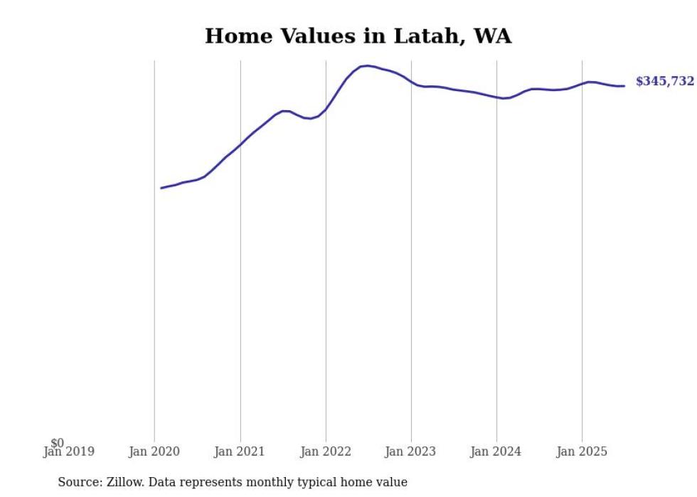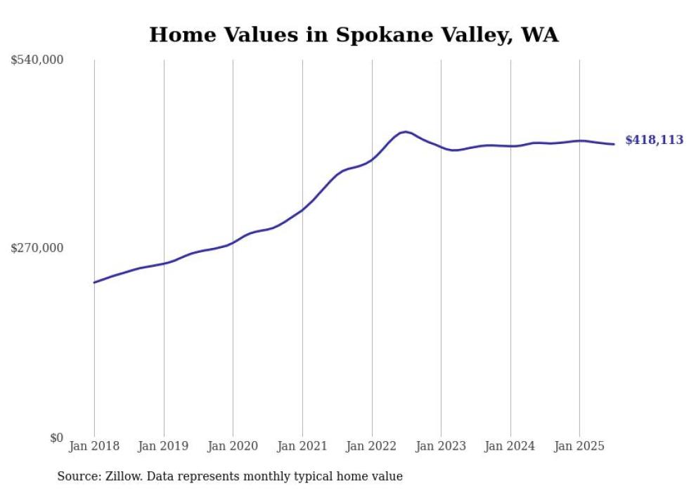 Stacker compiled a list of cities with the most expensive homes in the Spokane metro area using data from Zillow. Charts show the monthly typical home value since January 2018. Data was available for 34 cities and towns.