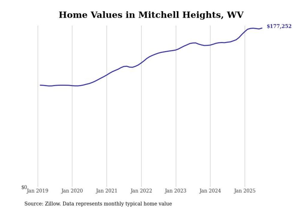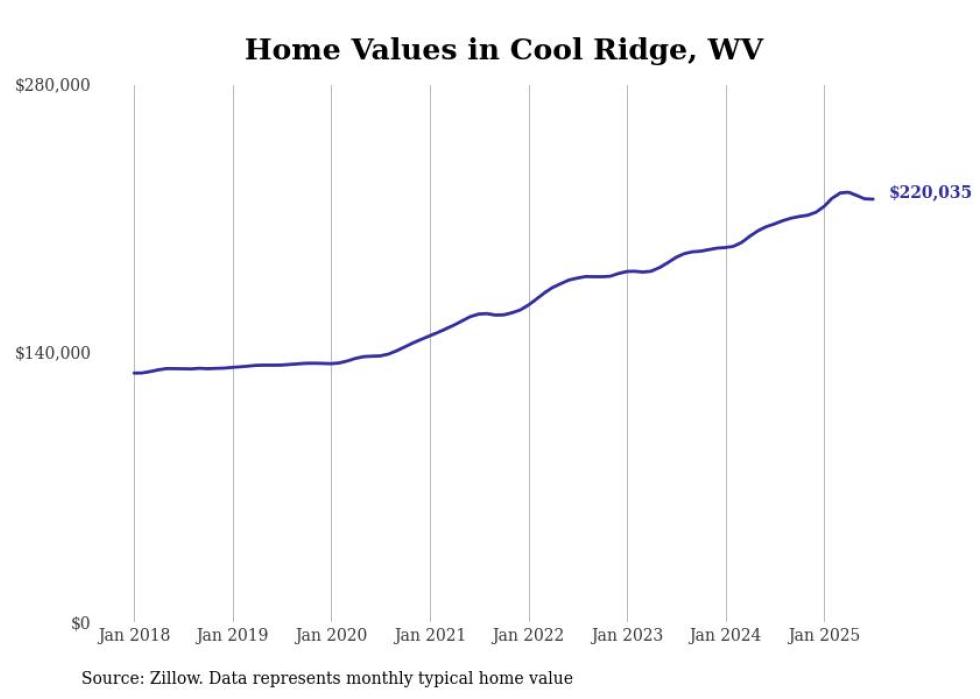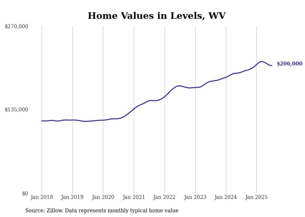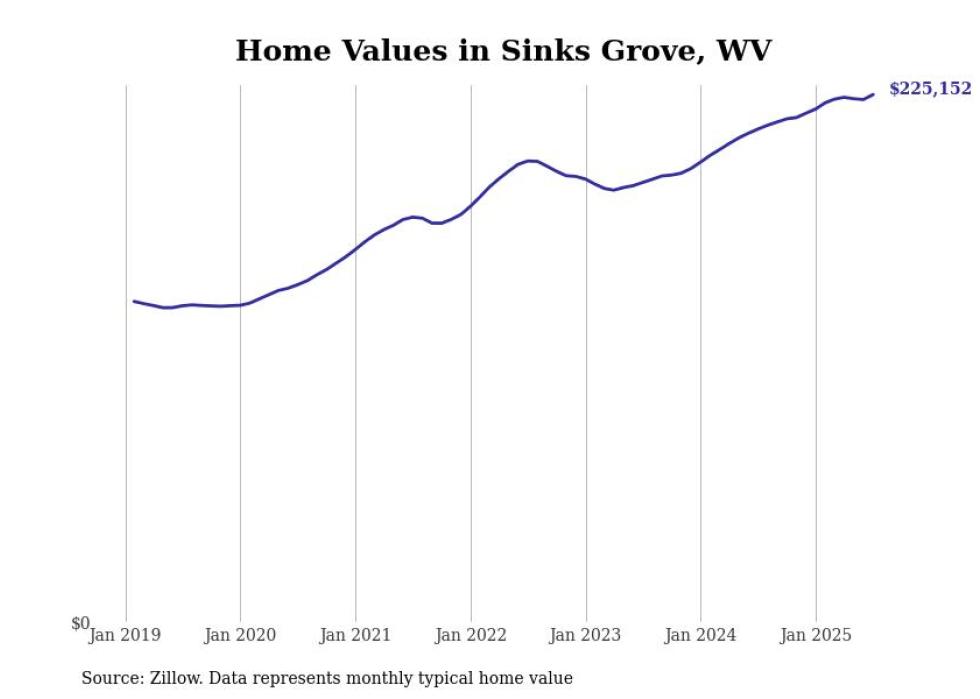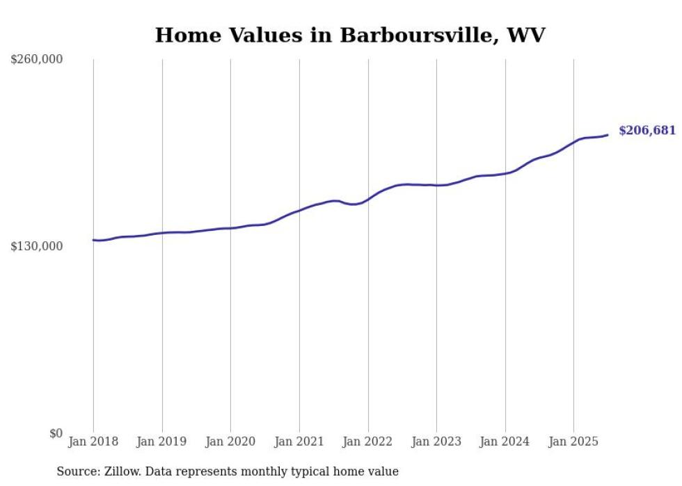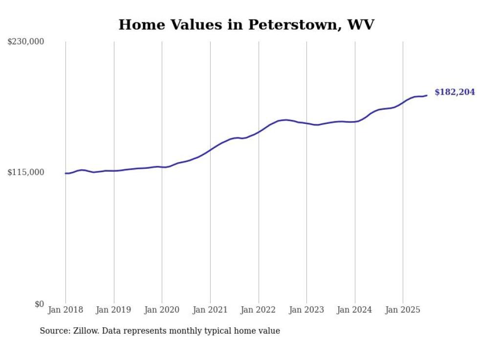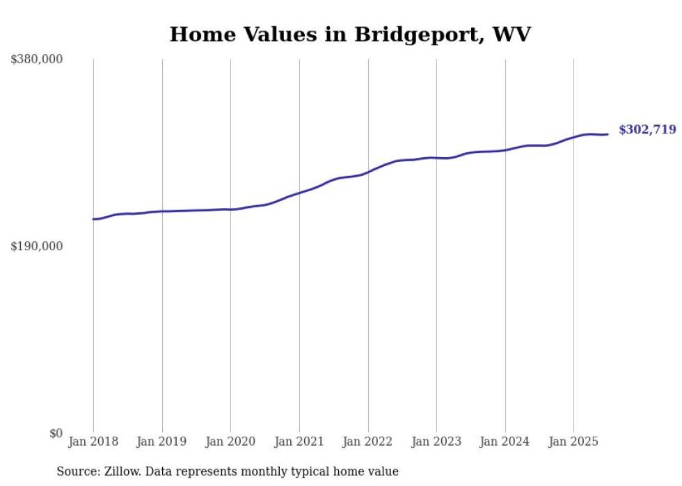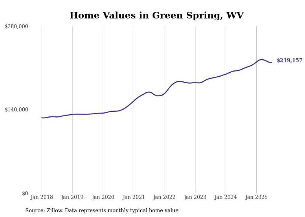 Stacker compiled a list of cities with the fastest-growing home prices in West Virginia using data from Zillow. Cities are ranked by the dollar change in the Zillow Home Values Index for all homes from the 12 months ending July 2025. The charts in this story were created automatically using Matplotlib. Data was available for 50 cities and towns in West Virginia.