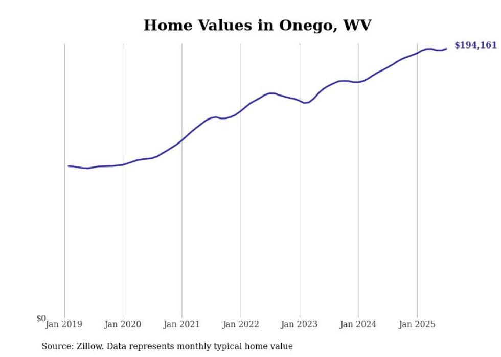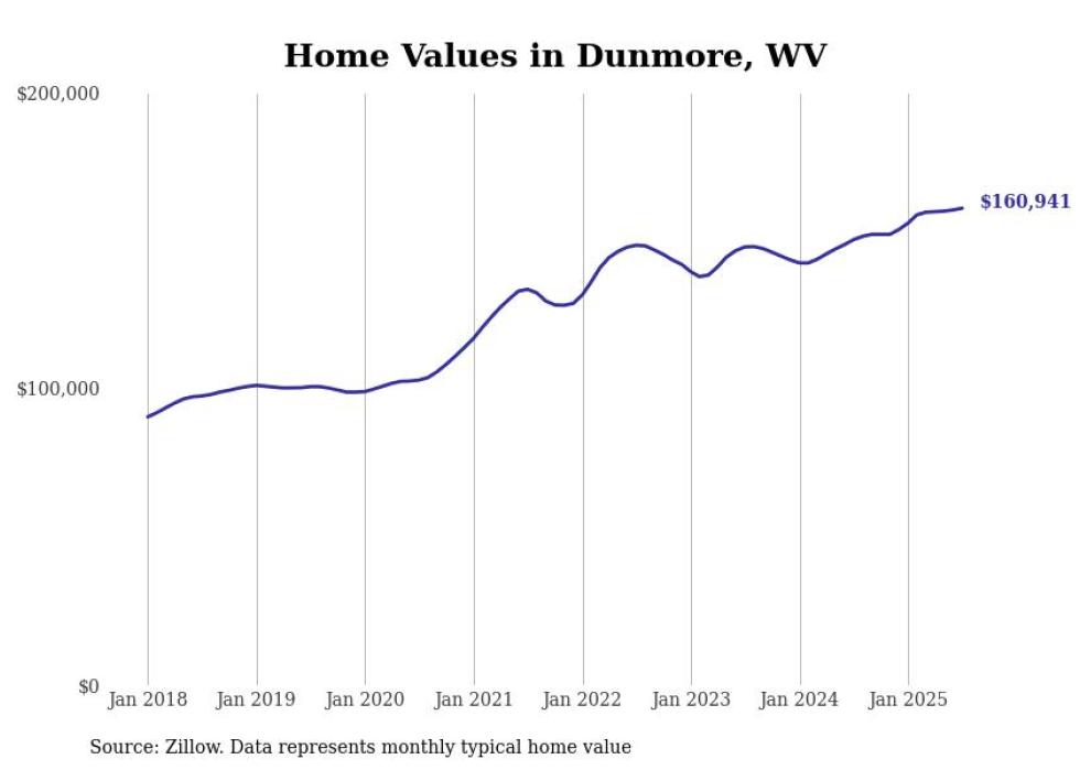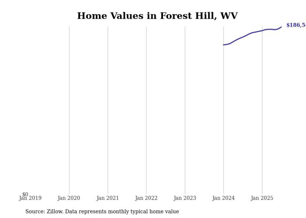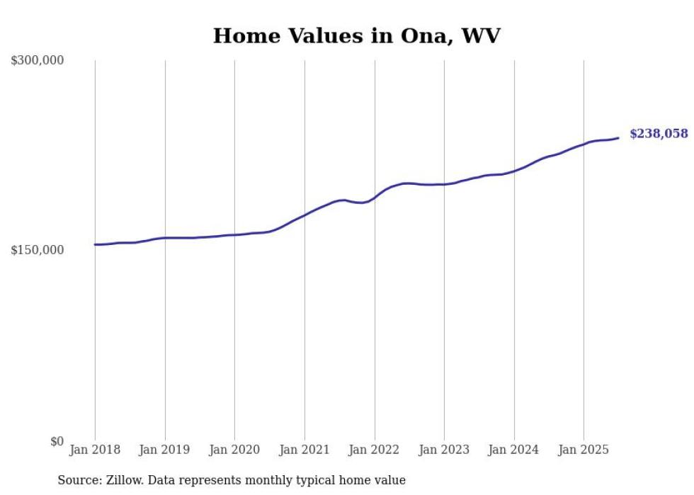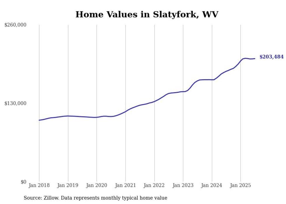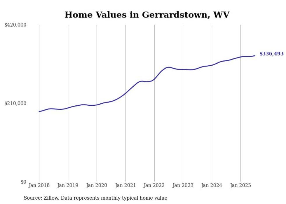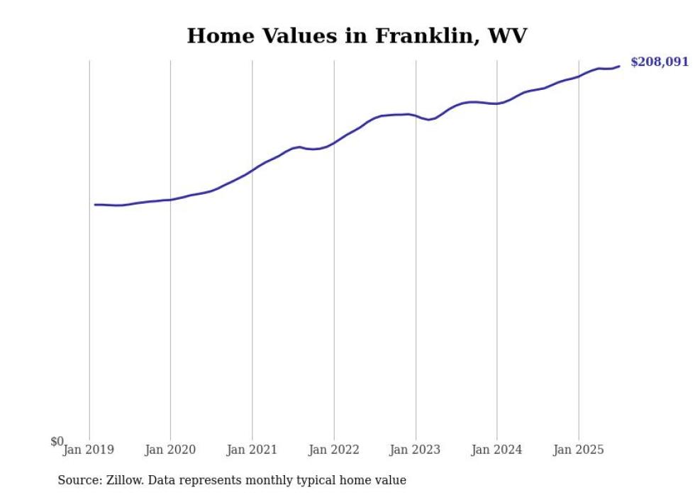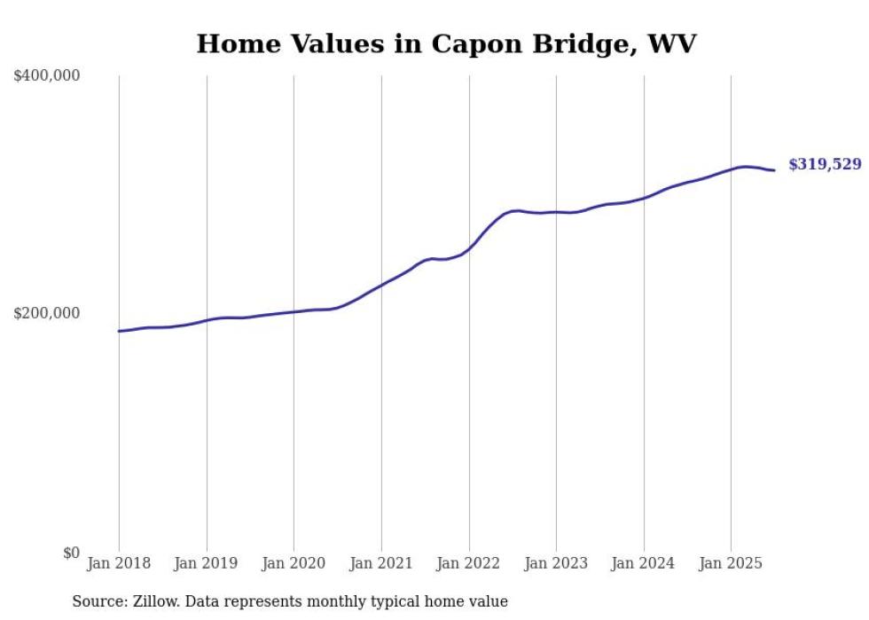 Stacker compiled a list of cities with the fastest-growing home prices in West Virginia using data from Zillow. Cities are ranked by the dollar change in the Zillow Home Values Index for all homes from the 12 months ending July 2025. The charts in this story were created automatically using Matplotlib. Data was available for 50 cities and towns in West Virginia.