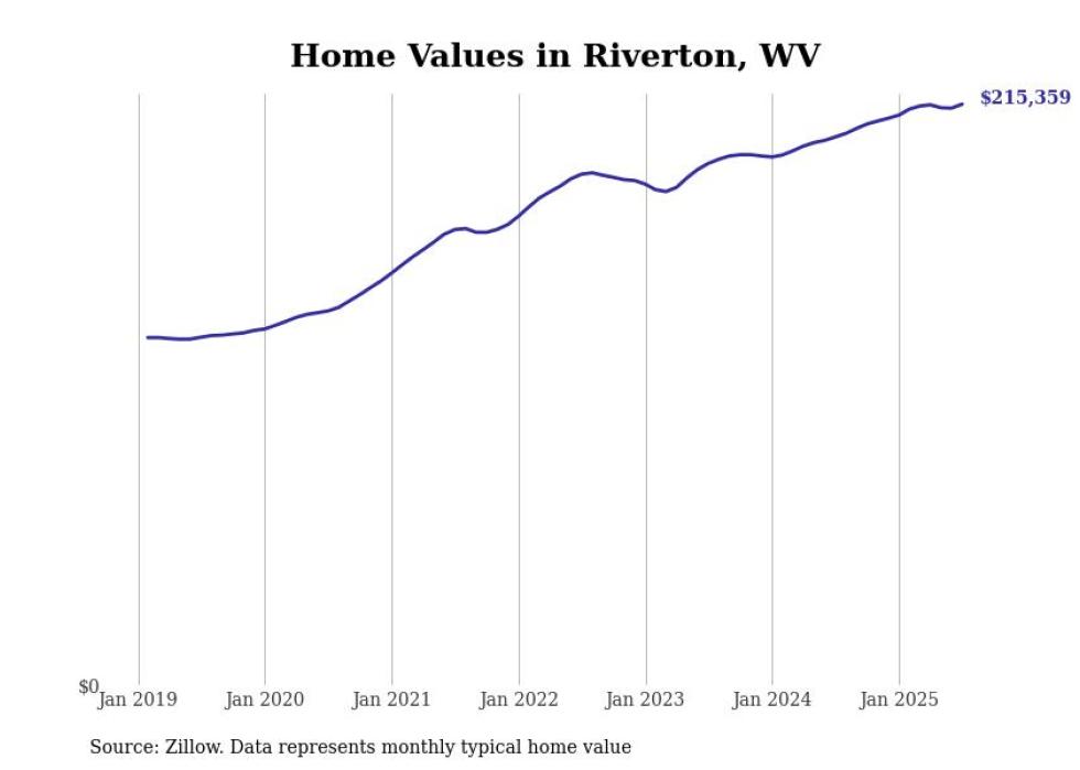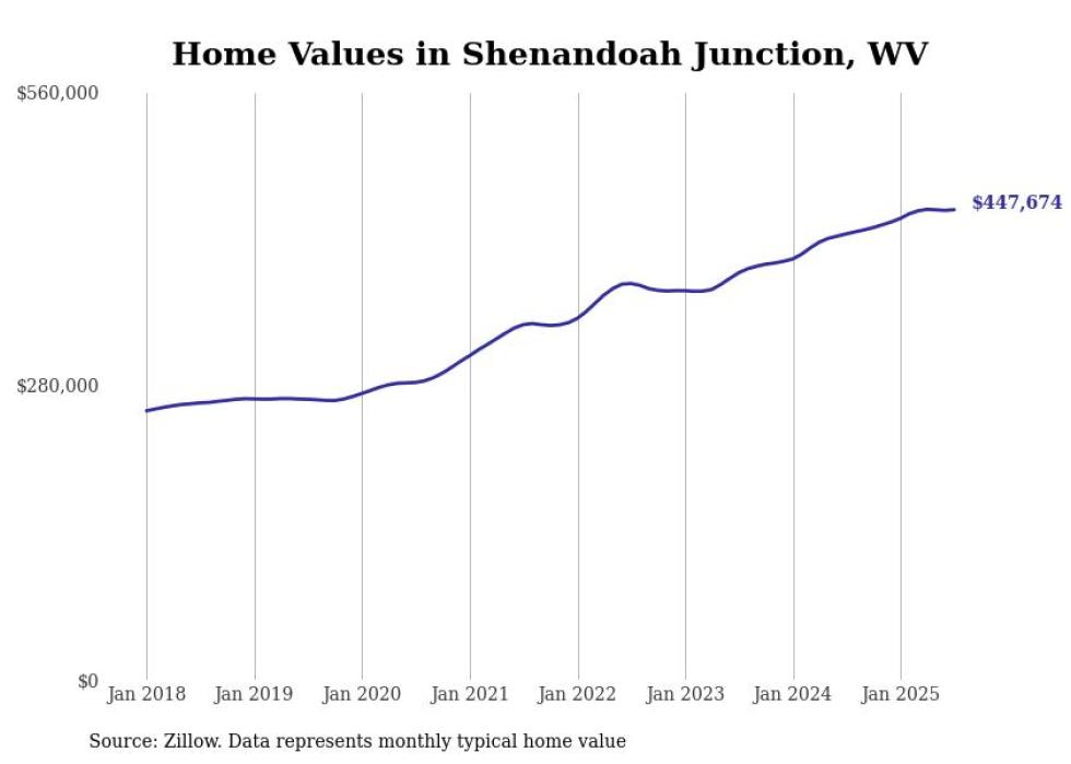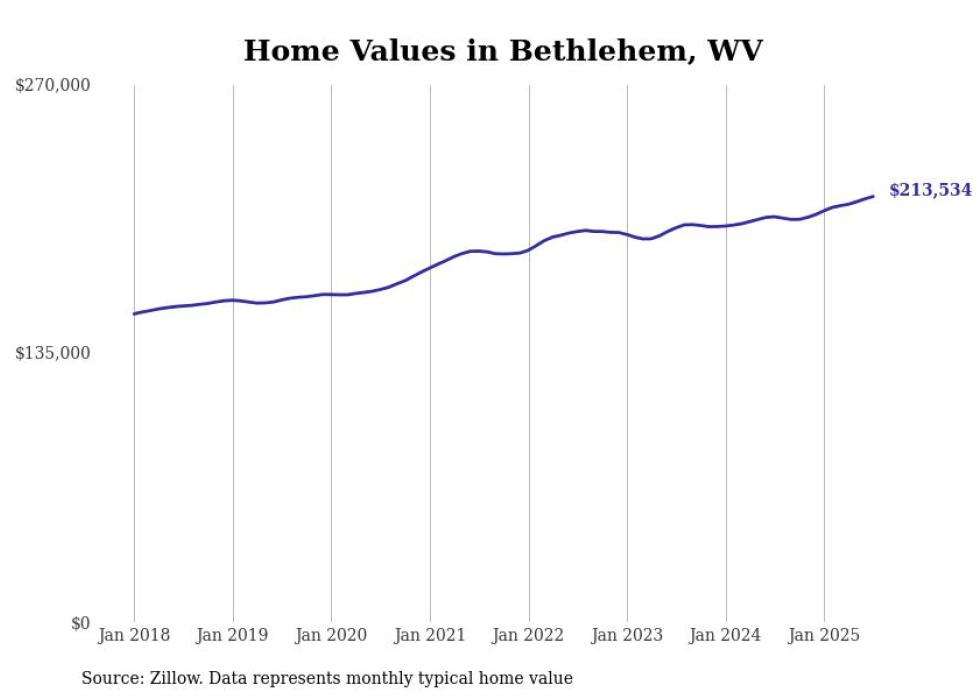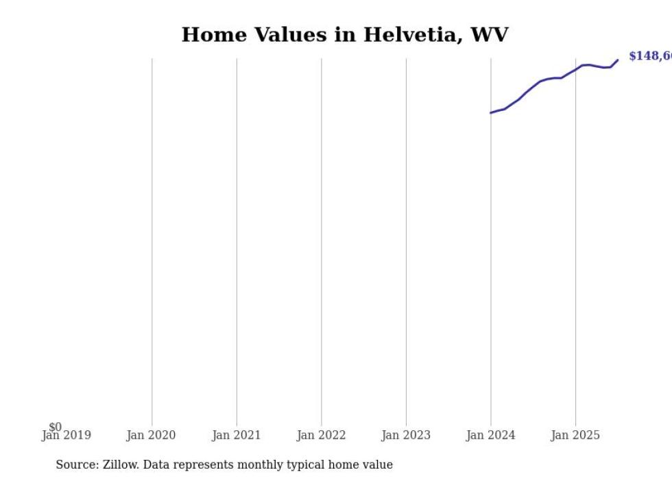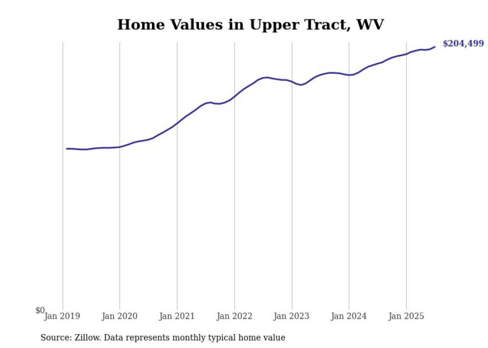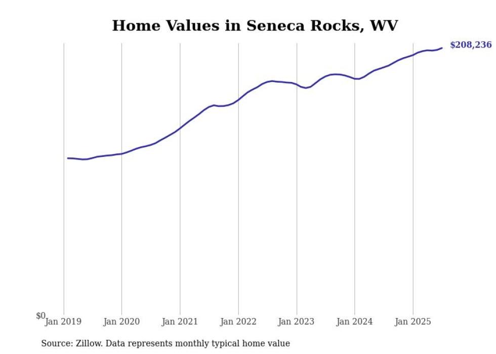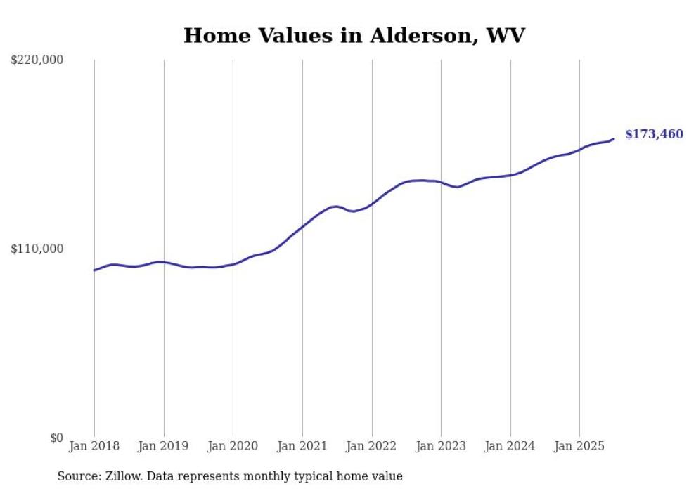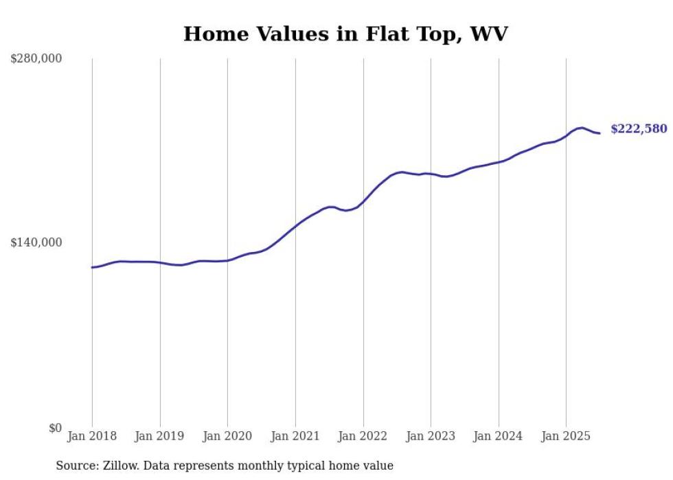 Stacker compiled a list of cities with the fastest-growing home prices in West Virginia using data from Zillow. Cities are ranked by the dollar change in the Zillow Home Values Index for all homes from the 12 months ending July 2025. The charts in this story were created automatically using Matplotlib. Data was available for 50 cities and towns in West Virginia.