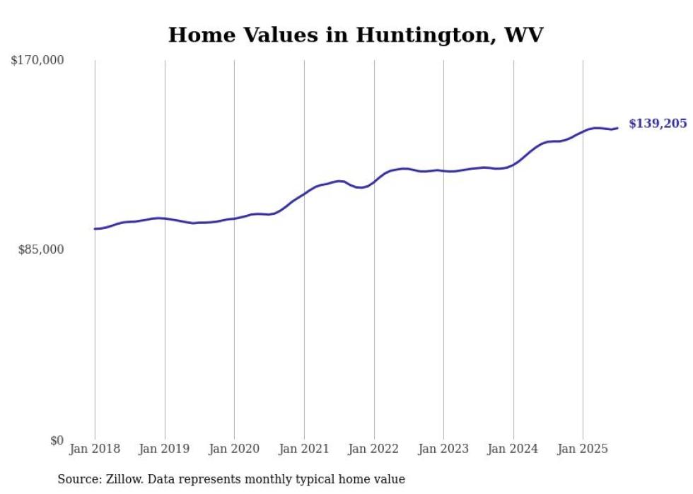 Stacker compiled a list of cities with the most expensive homes in the Huntington metro area using data from Zillow. Charts show the monthly typical home value since January 2018. Data was available for 46 cities and towns.