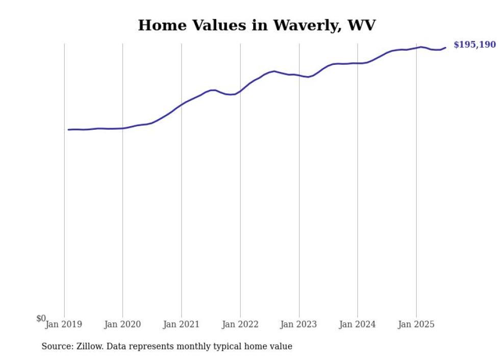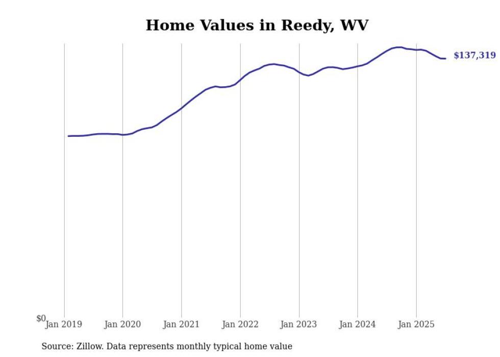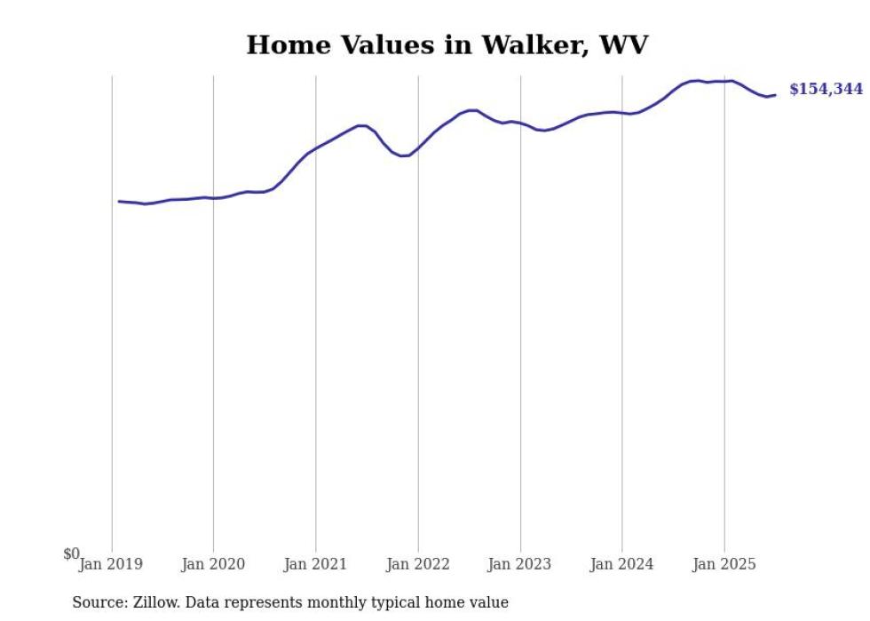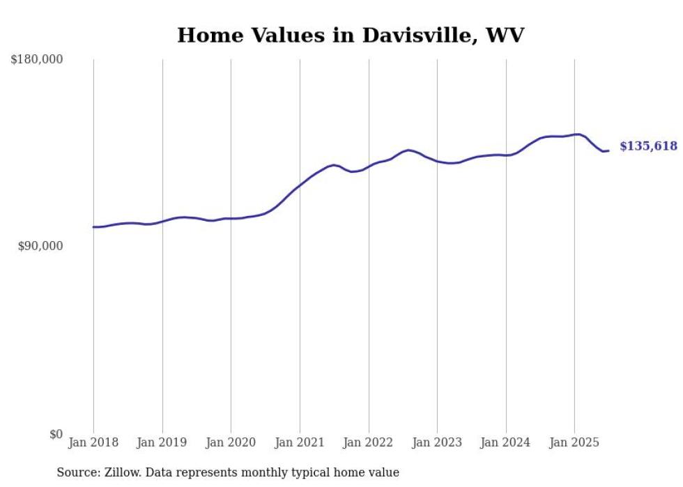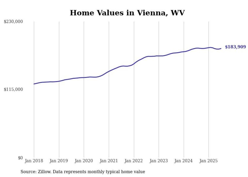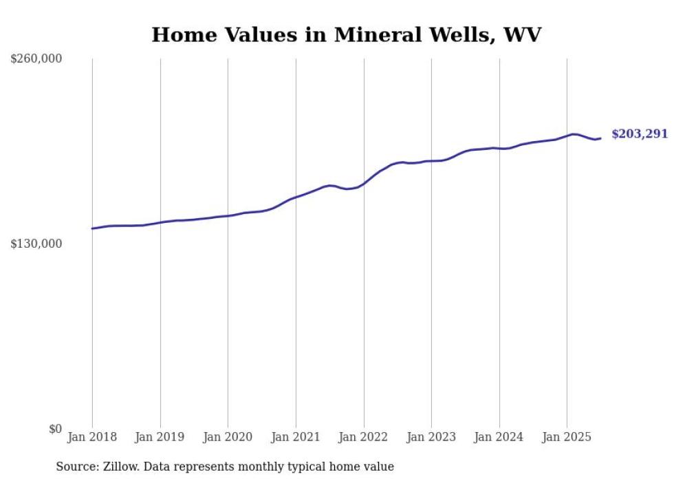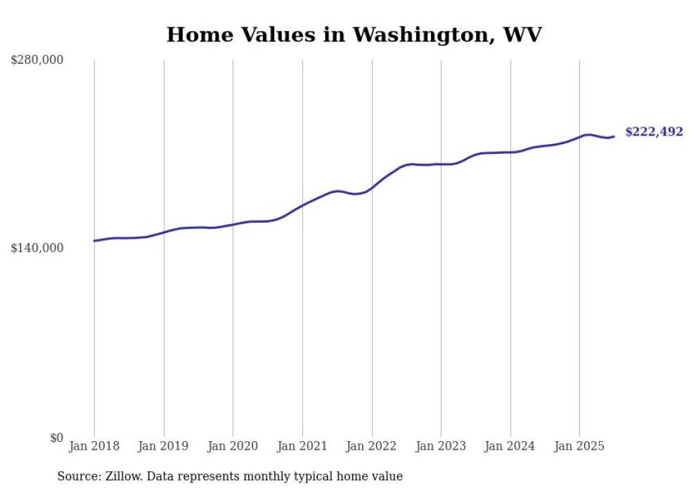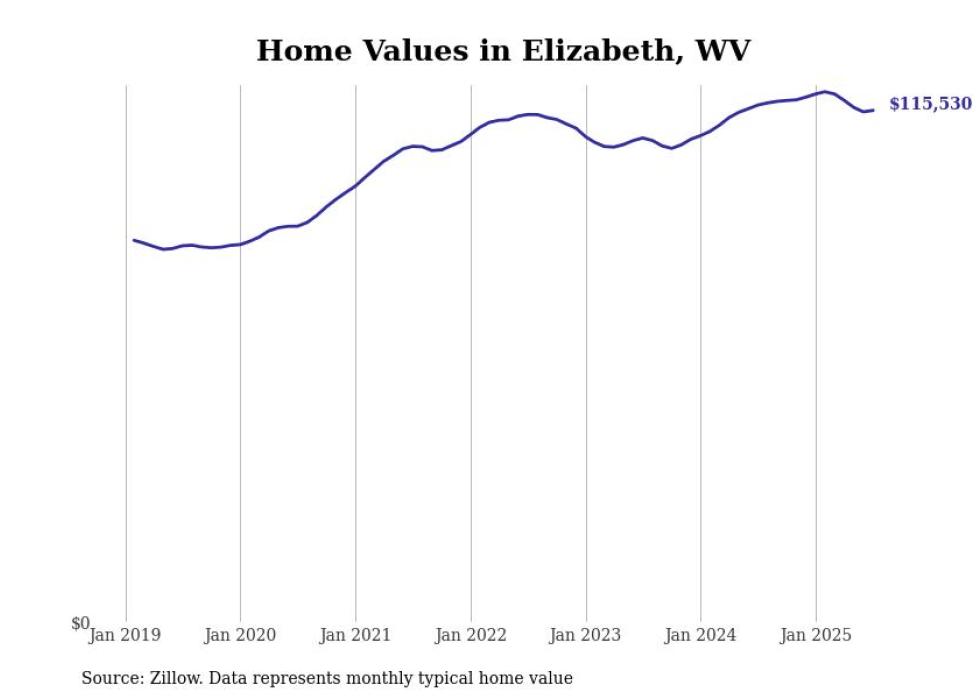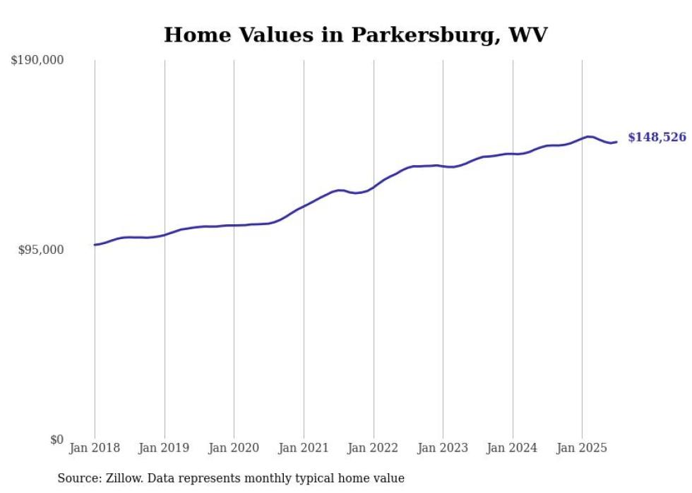 Stacker compiled a list of cities with the most expensive homes in the Parkersburg metro area using data from Zillow. Charts show the monthly typical home value since January 2018. All 12 cities and towns with data available were included in the list.
