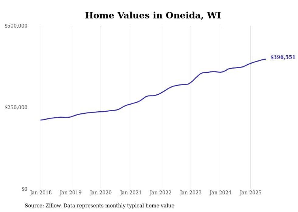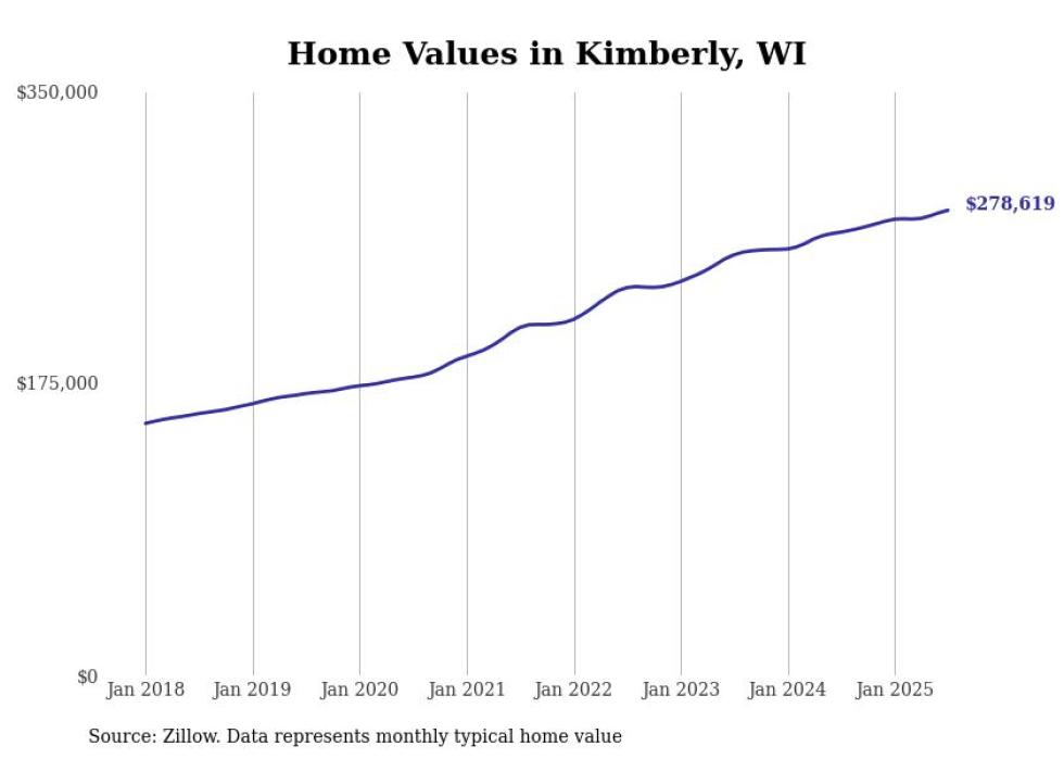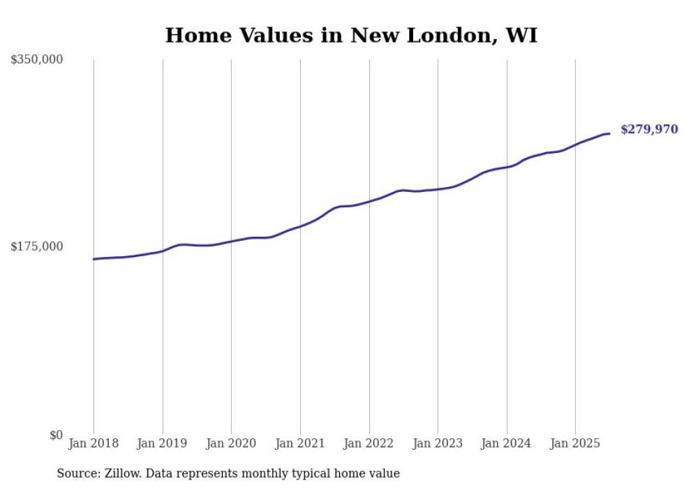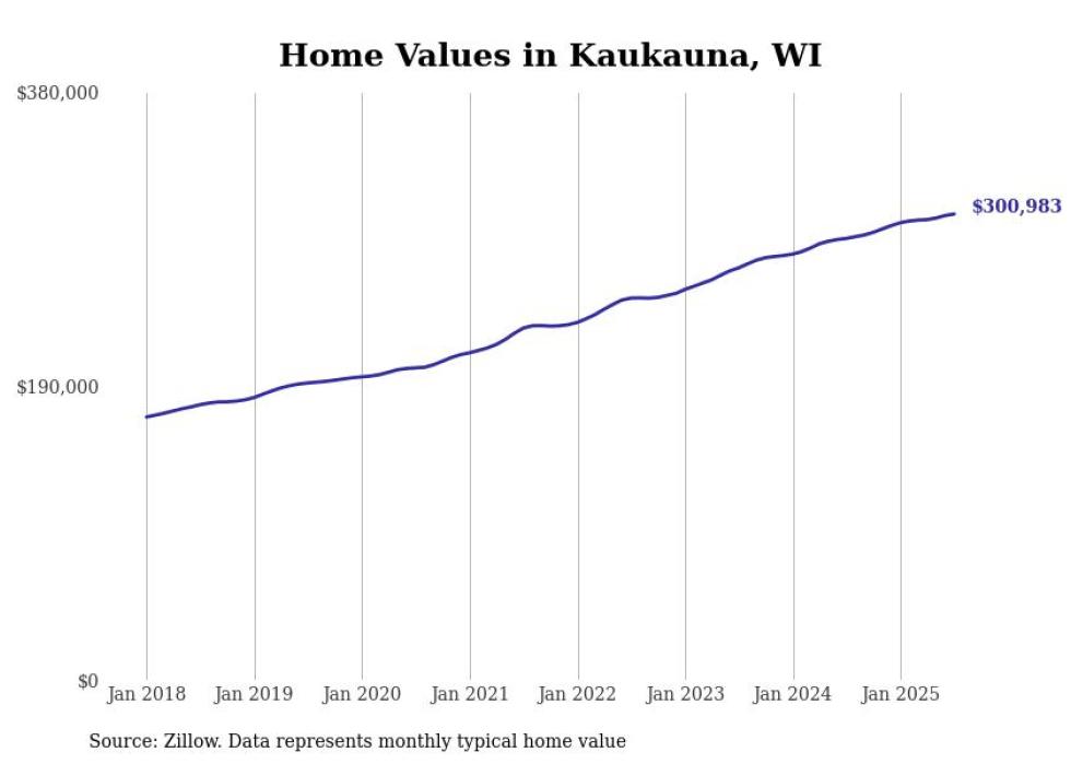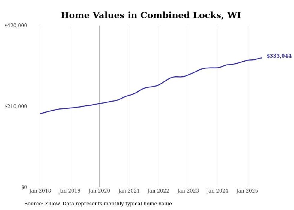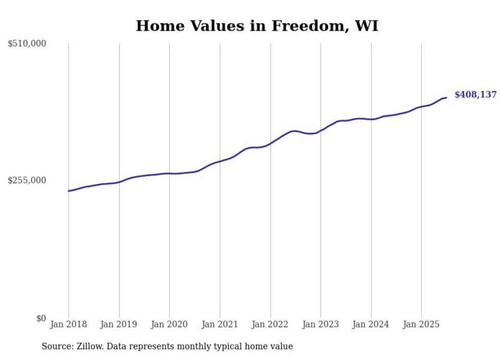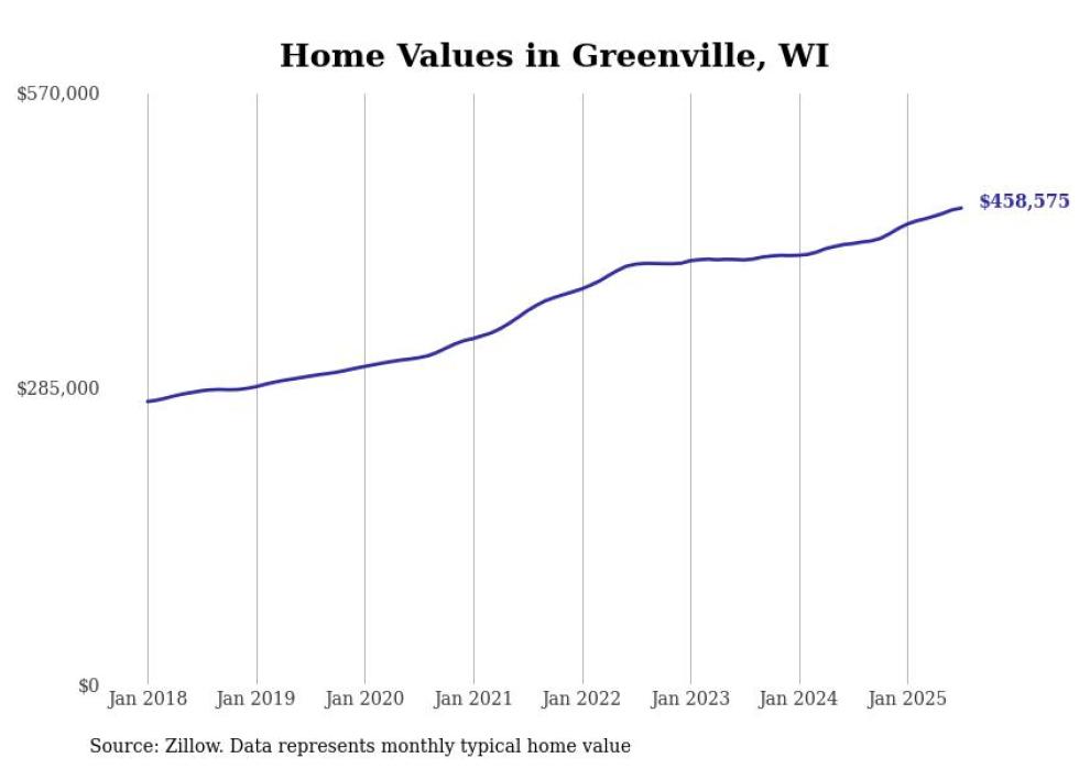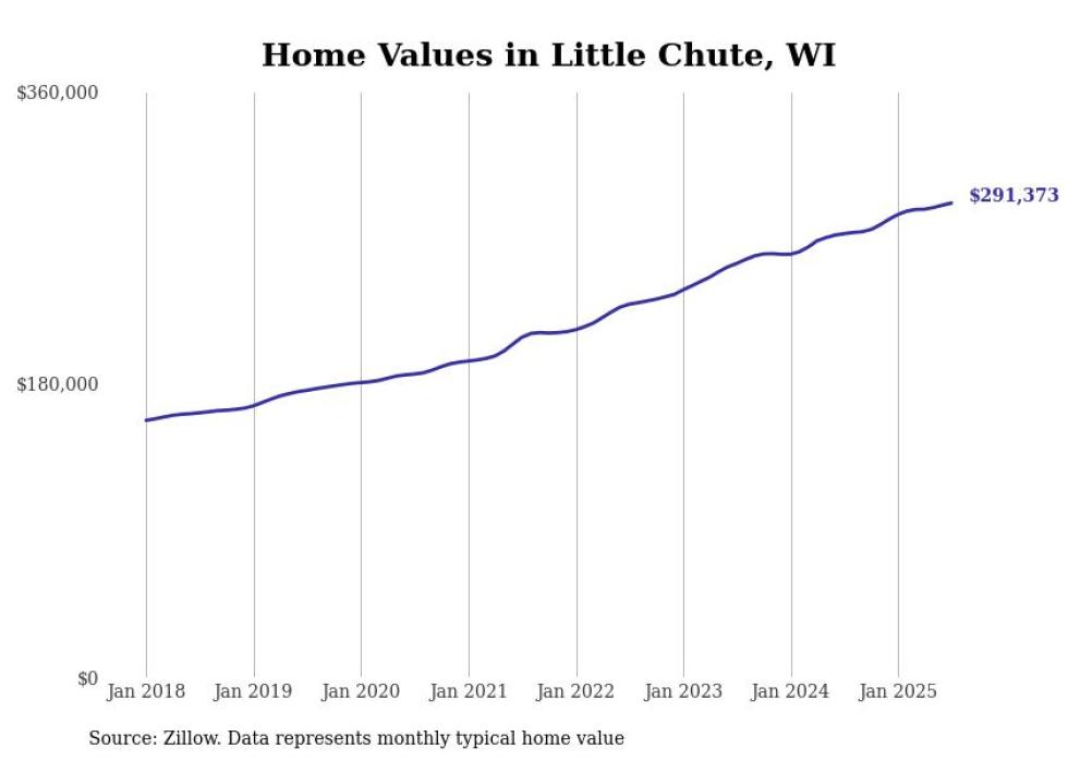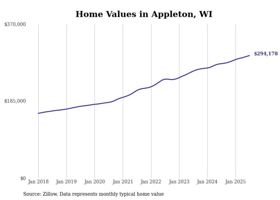 Stacker compiled a list of cities with the most expensive homes in the Appleton metro area using data from Zillow. Charts show the monthly typical home value since January 2018. All 23 cities and towns with data available were included in the list.