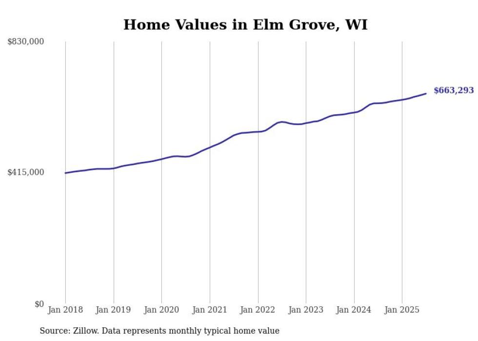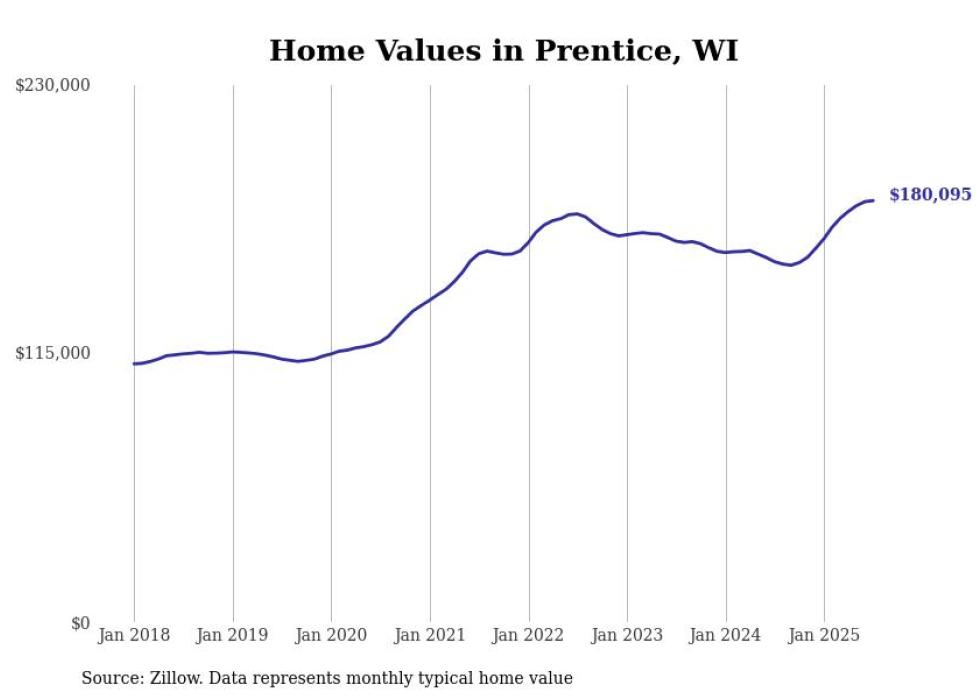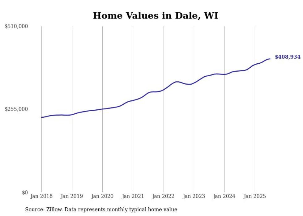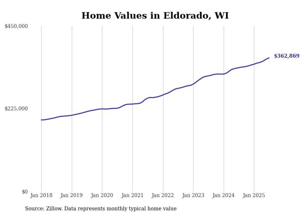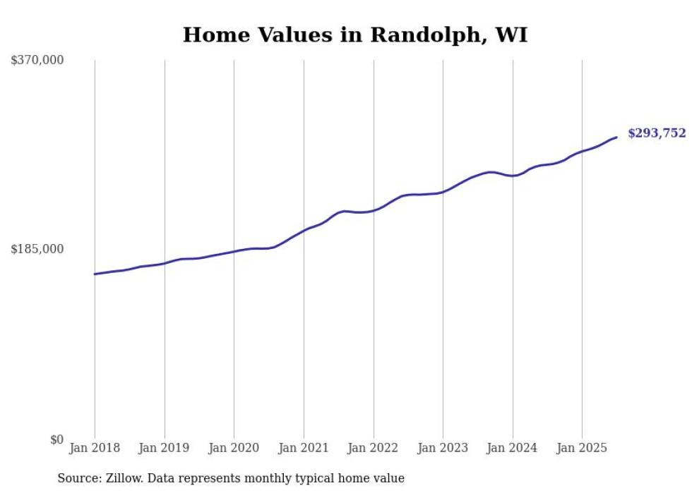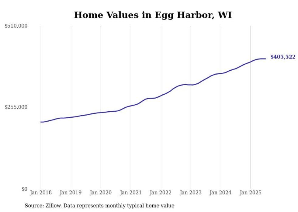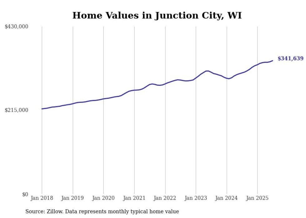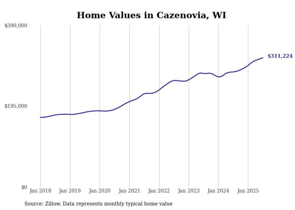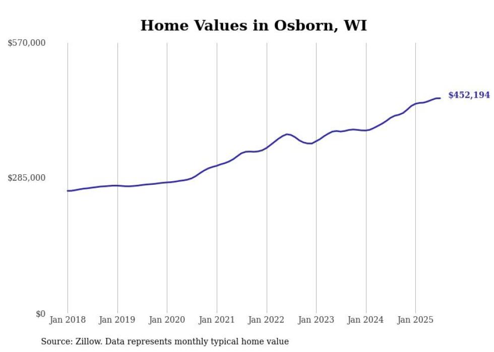 Stacker compiled a list of cities with the fastest-growing home prices in Wisconsin using data from Zillow. Cities are ranked by the dollar change in the Zillow Home Values Index for all homes from the 12 months ending July 2025. The charts in this story were created automatically using Matplotlib. Data was available for 50 cities and towns in Wisconsin.