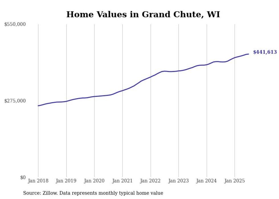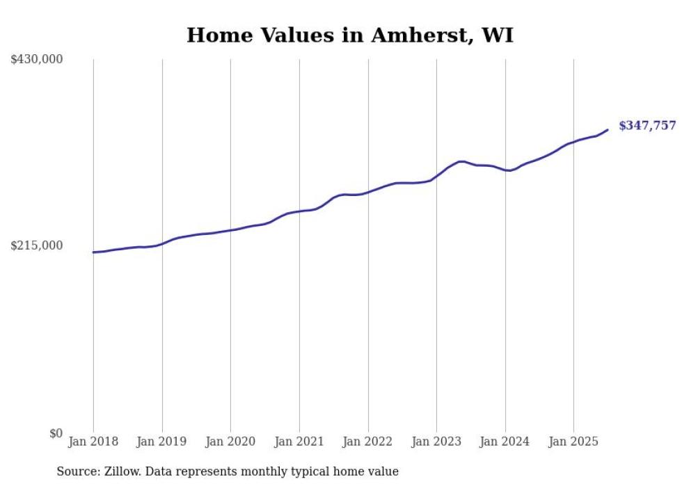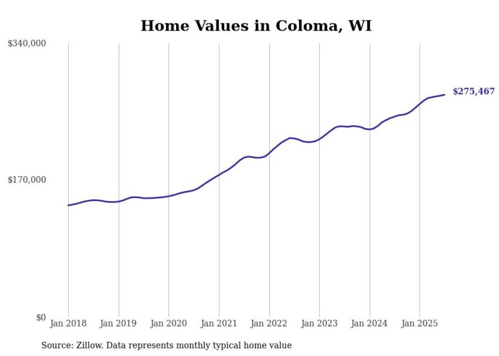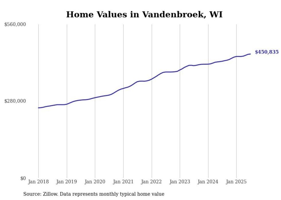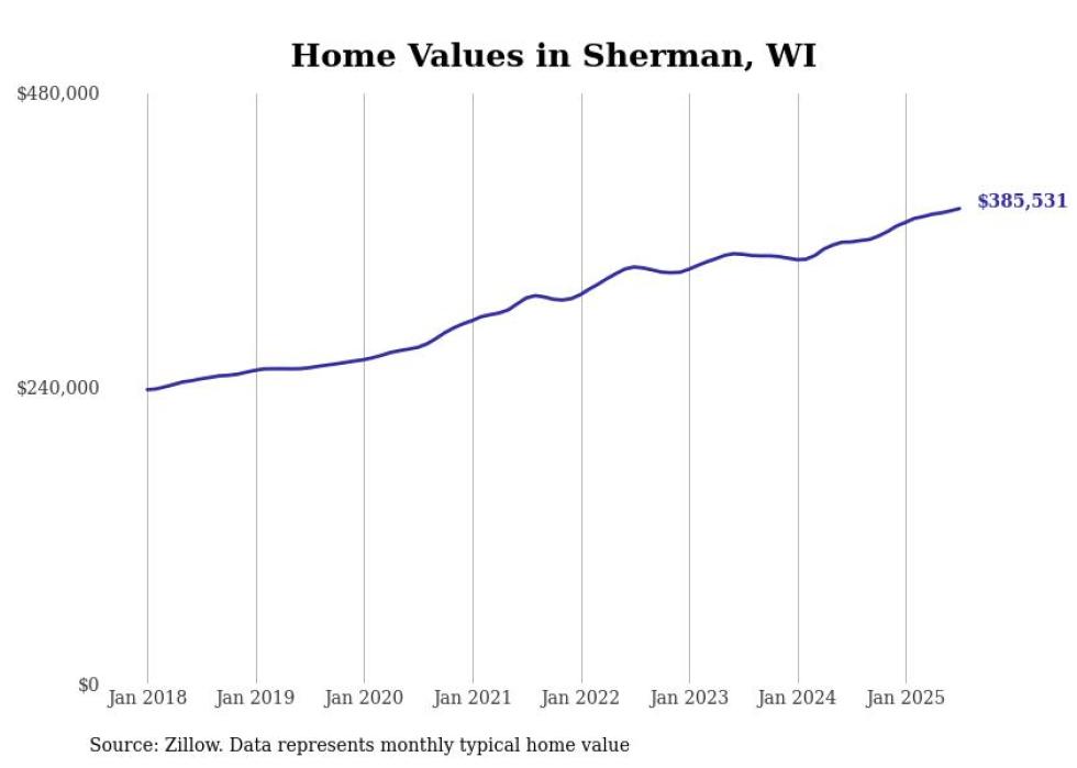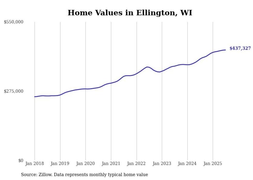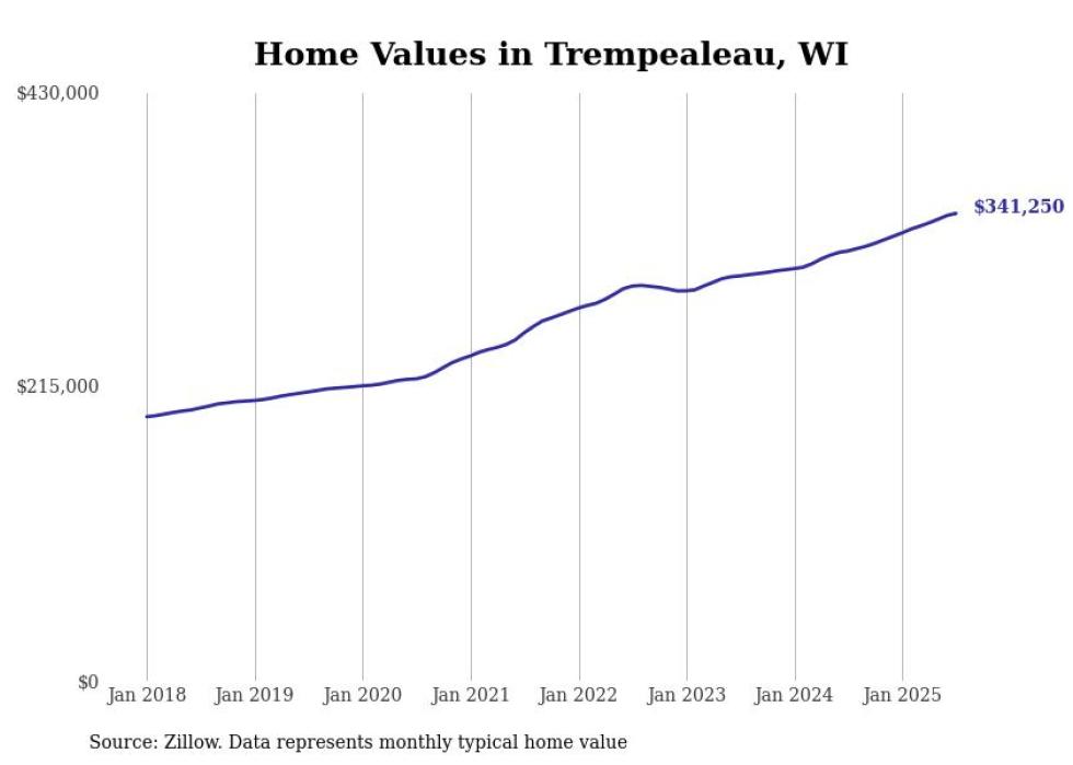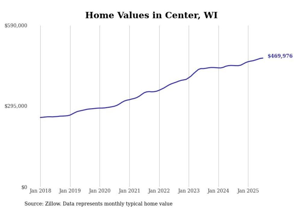 Stacker compiled a list of cities with the fastest-growing home prices in Wisconsin using data from Zillow. Cities are ranked by the dollar change in the Zillow Home Values Index for all homes from the 12 months ending July 2025. The charts in this story were created automatically using Matplotlib. Data was available for 50 cities and towns in Wisconsin.