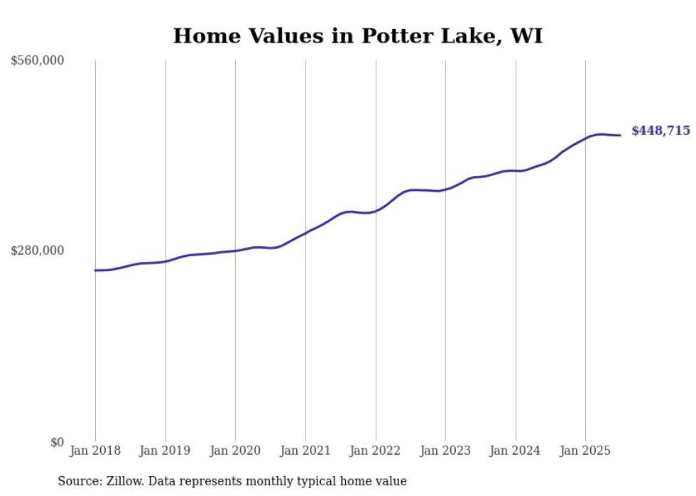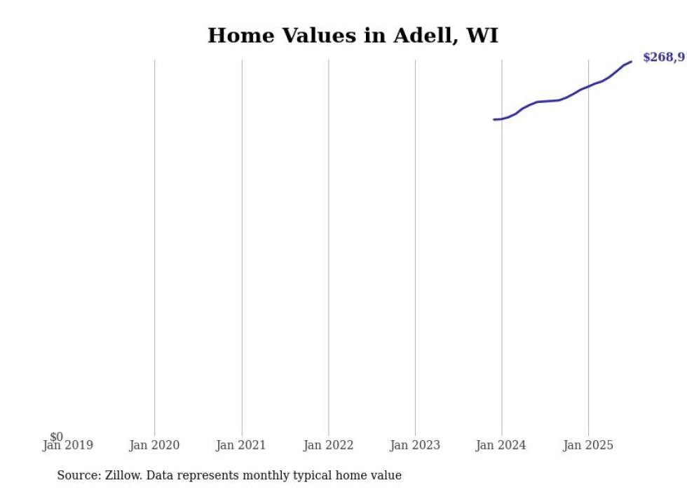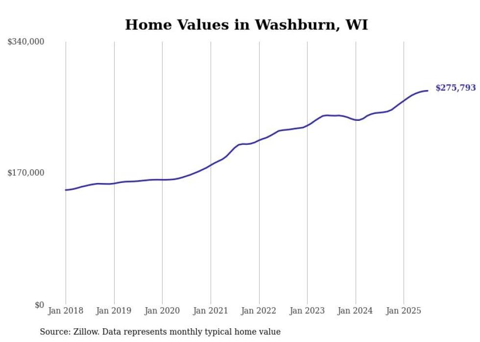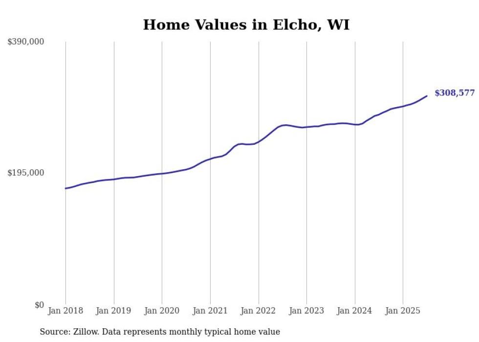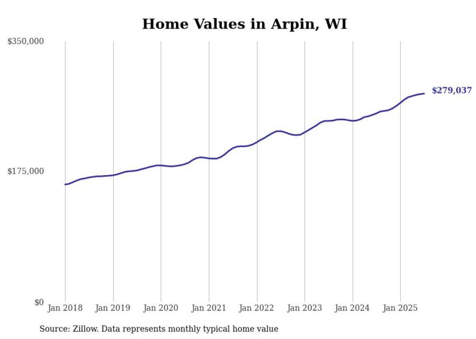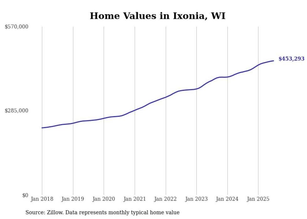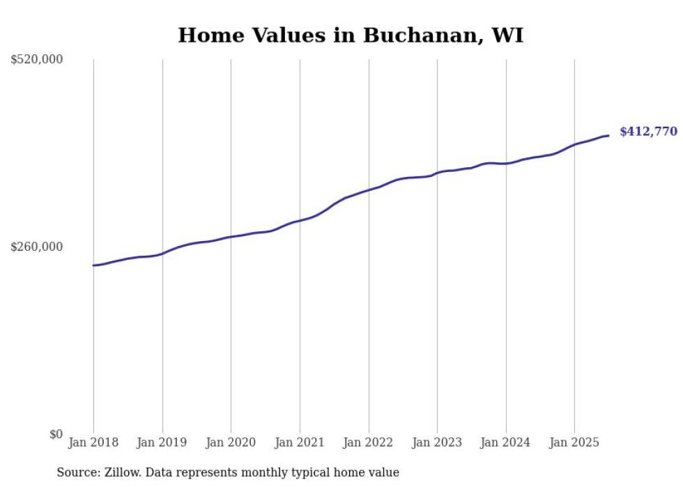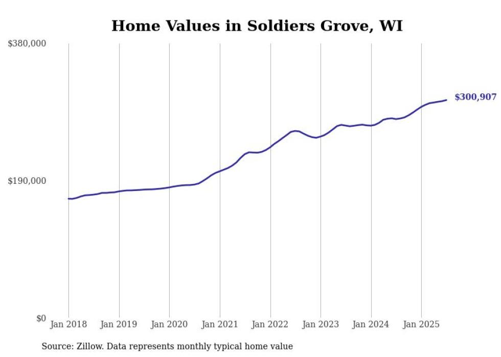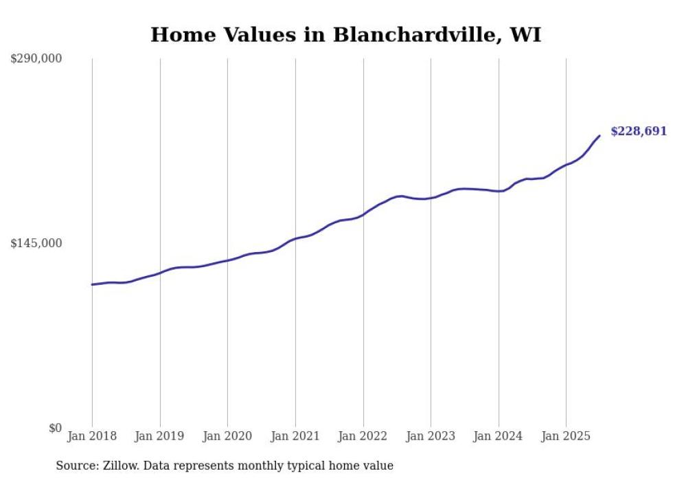 Stacker compiled a list of cities with the fastest-growing home prices in Wisconsin using data from Zillow. Cities are ranked by the dollar change in the Zillow Home Values Index for all homes from the 12 months ending July 2025. The charts in this story were created automatically using Matplotlib. Data was available for 50 cities and towns in Wisconsin.