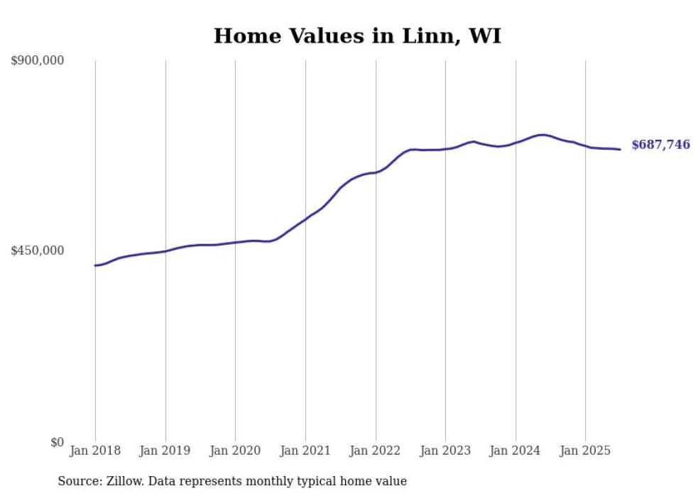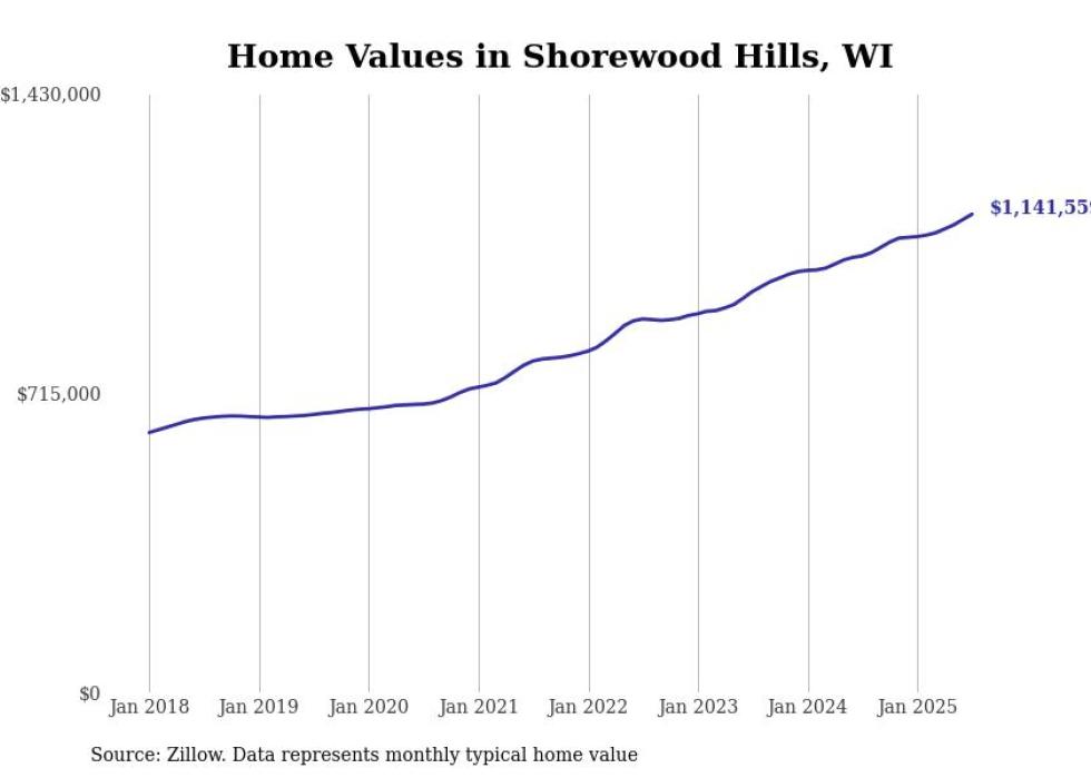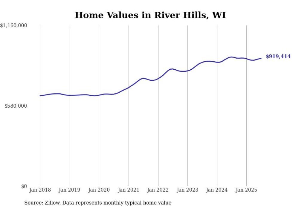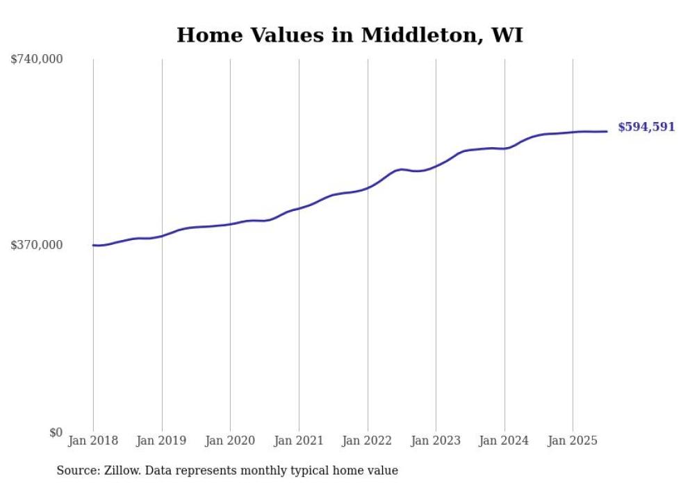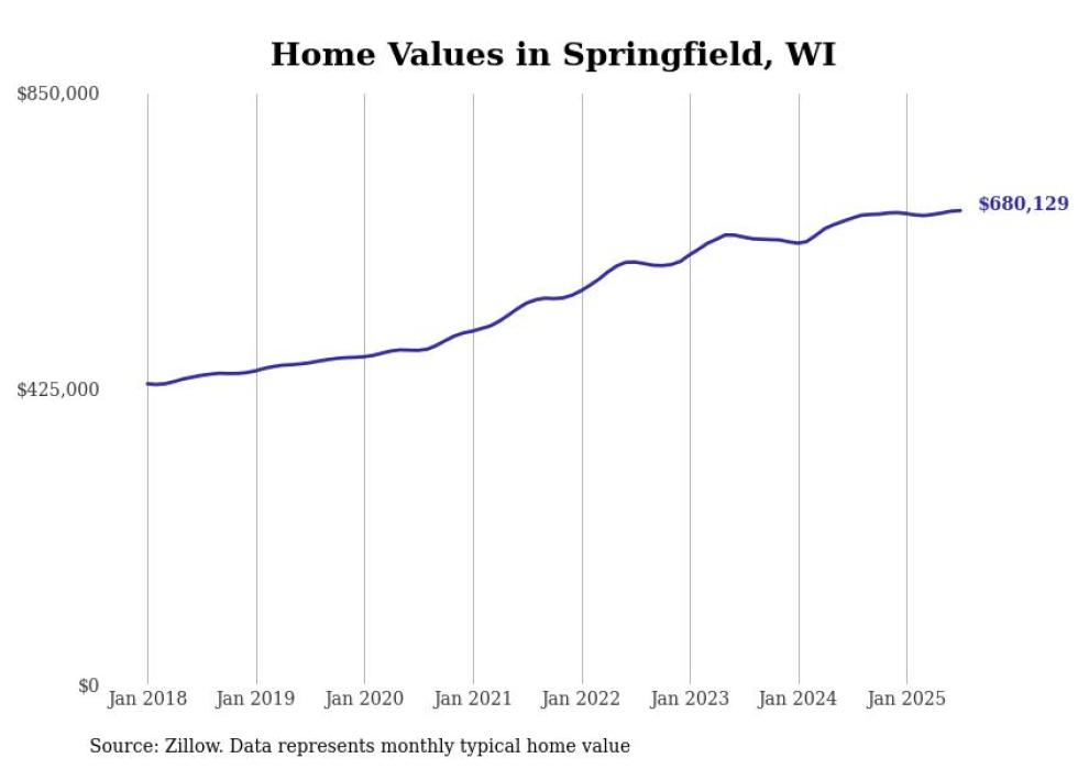 Stacker compiled a list of cities with the most expensive homes in Wisconsin using data from Zillow. Cities are ranked by the Zillow Home Values Index for all homes as of July 2025. The charts in this story were created automatically using Matplotlib.