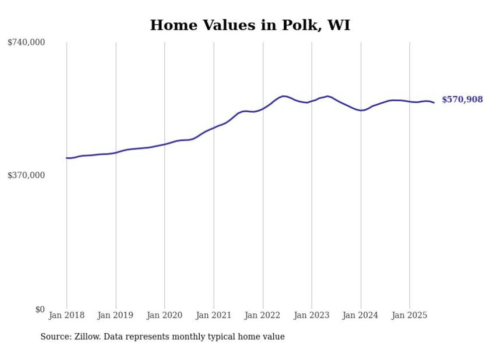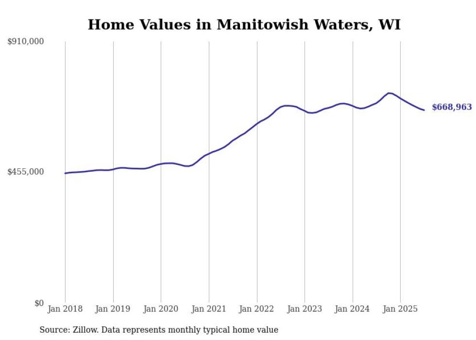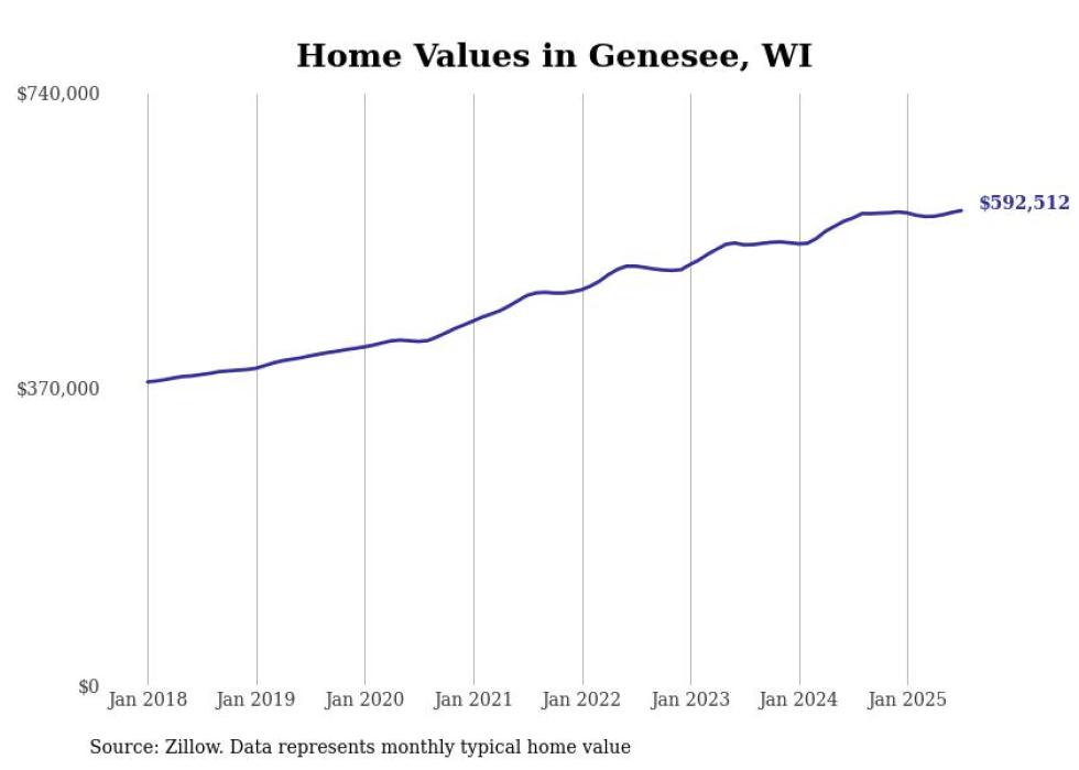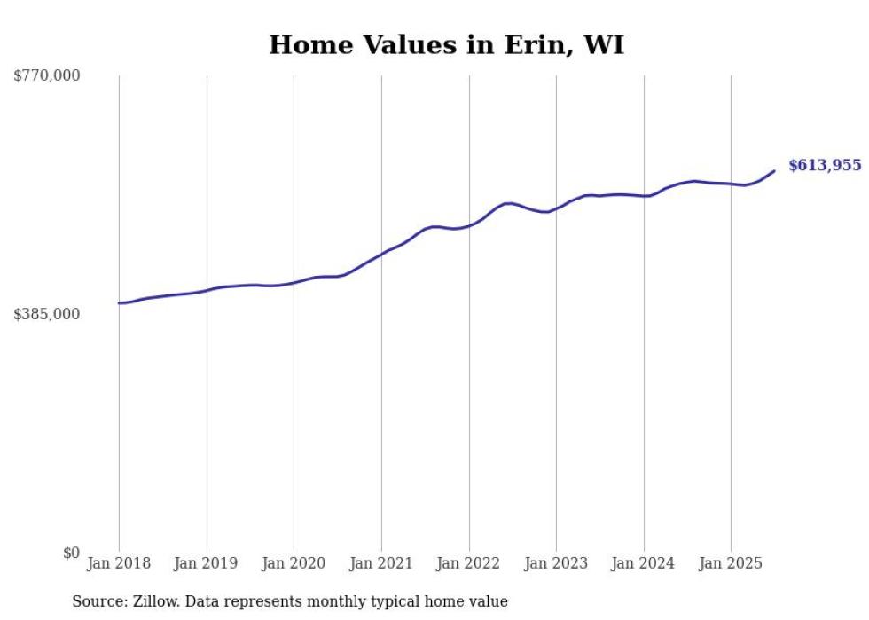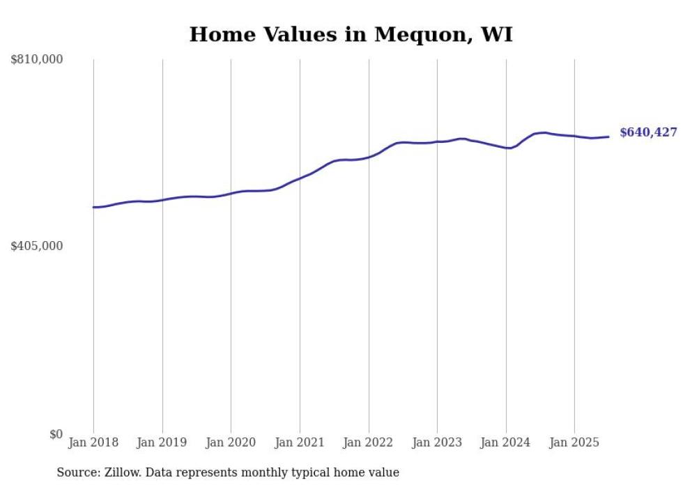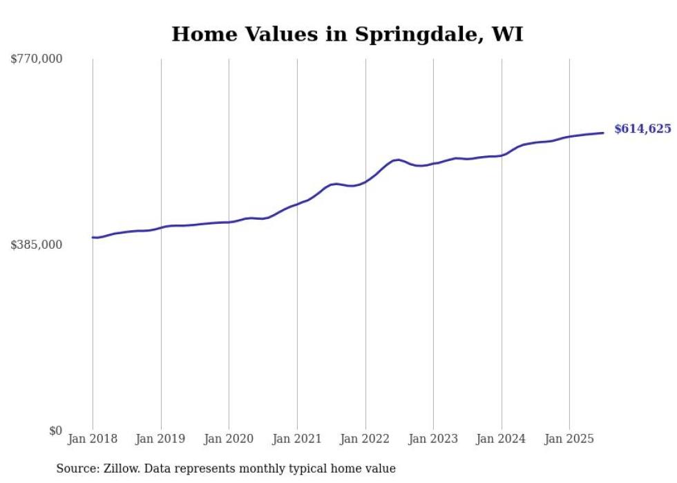 Stacker compiled a list of cities with the most expensive homes in Wisconsin using data from Zillow. Cities are ranked by the Zillow Home Values Index for all homes as of July 2025. The charts in this story were created automatically using Matplotlib.