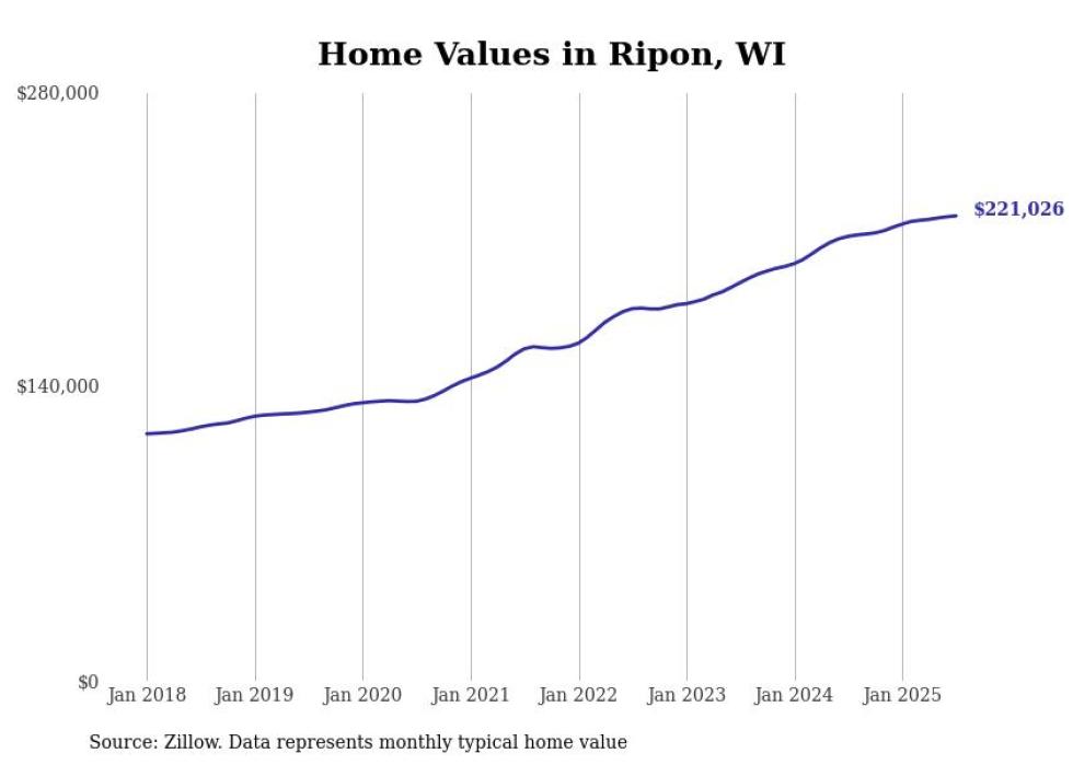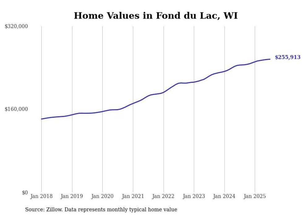 Stacker compiled a list of cities with the most expensive homes in the Fond du Lac metro area using data from Zillow. Charts show the monthly typical home value since January 2018. All 12 cities and towns with data available were included in the list.